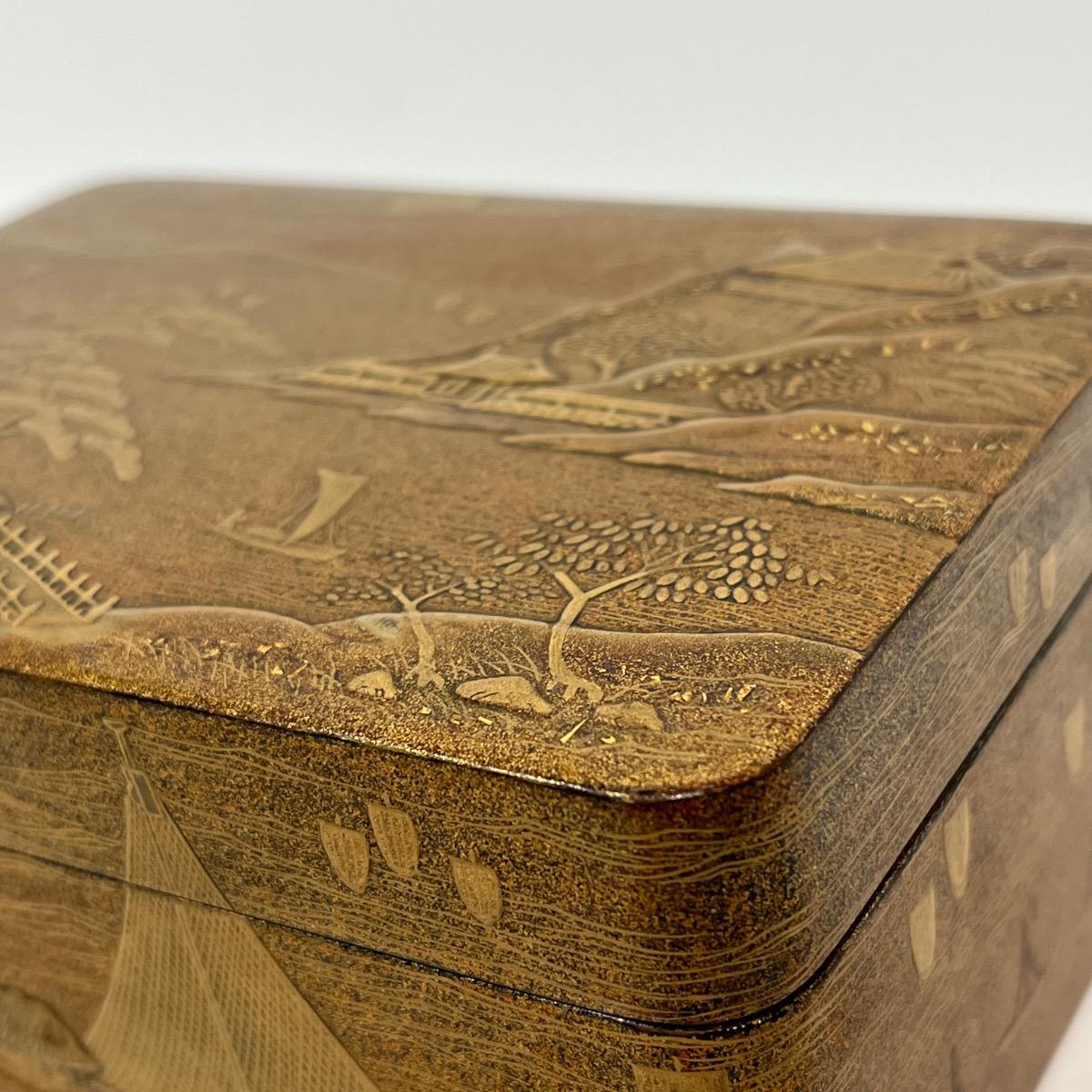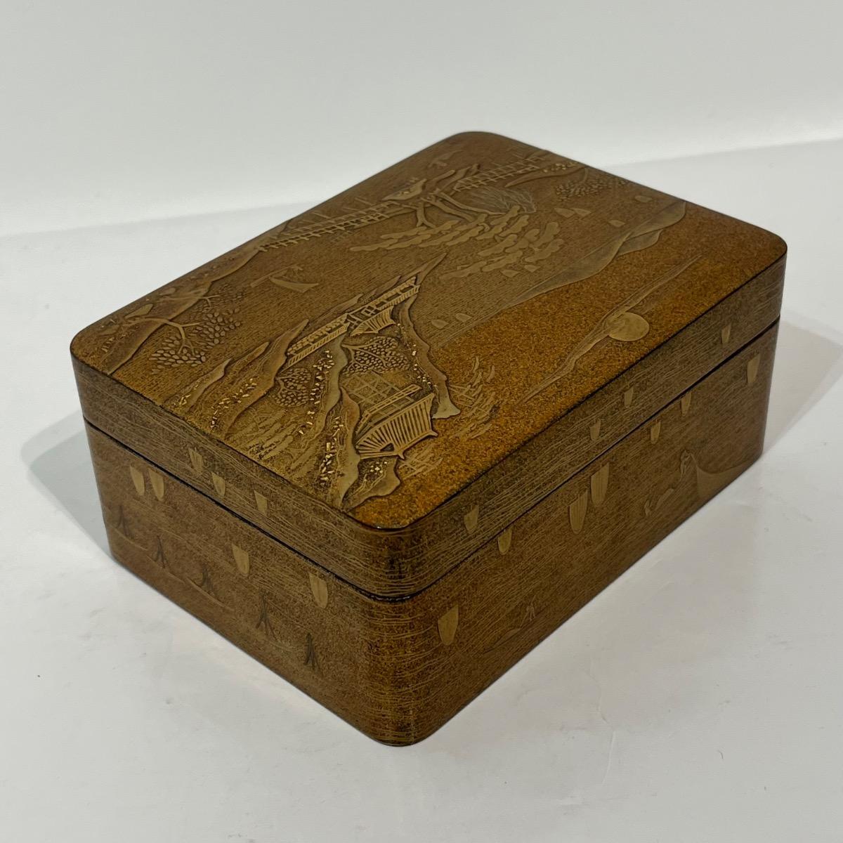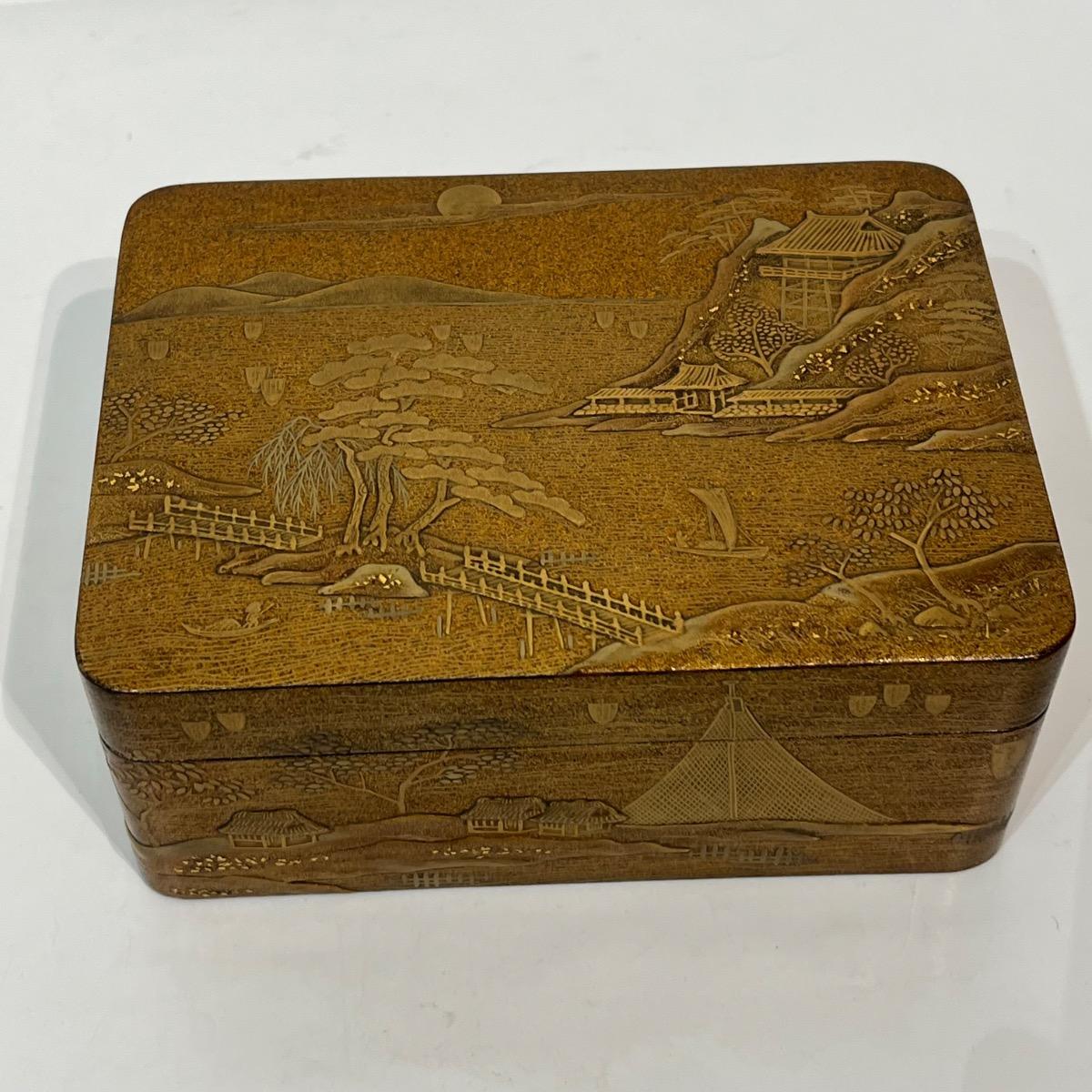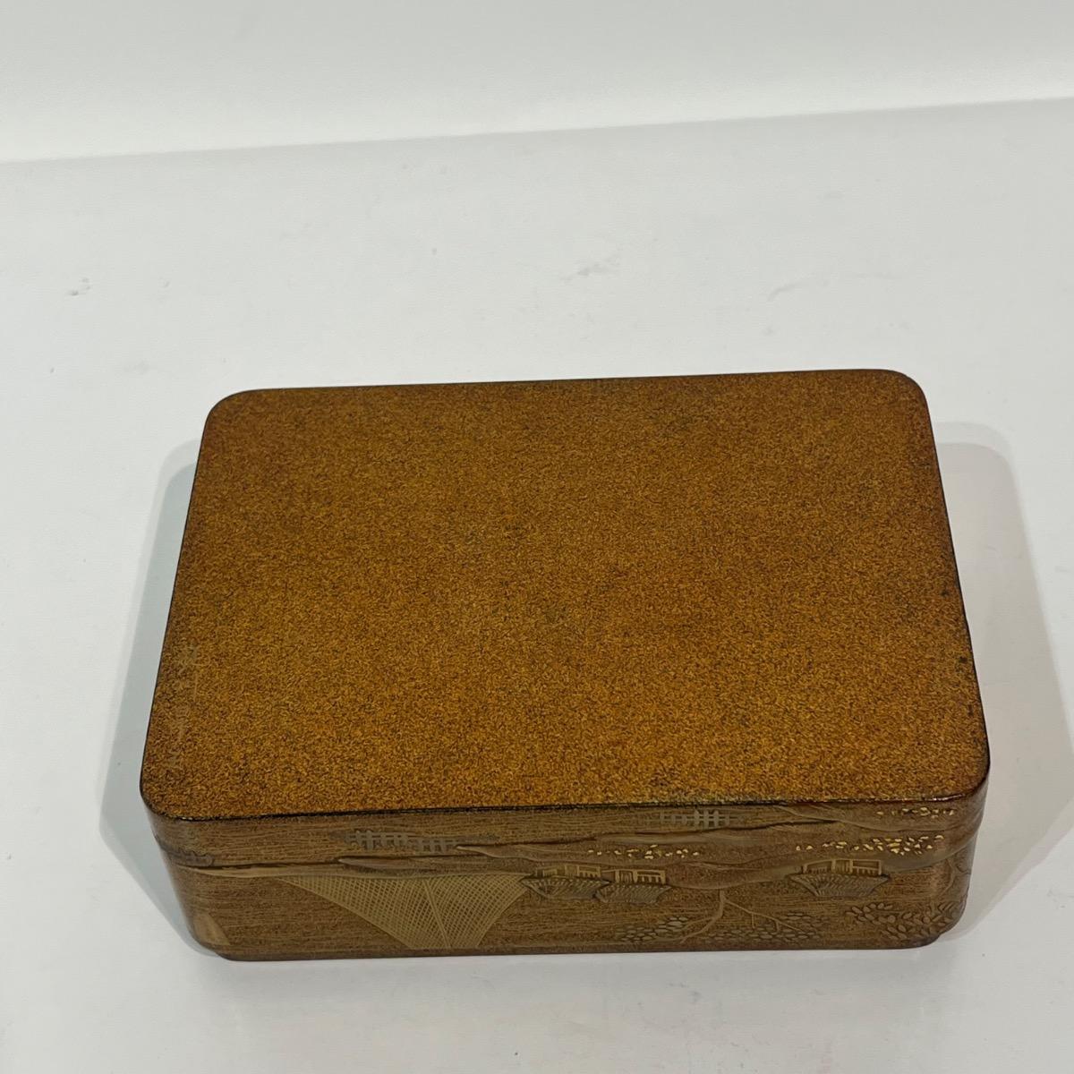 Boîle en bois sculpté et laqué richement décorée en laque nashiji et takamakie. Le décor représentante un paysage au bord de mer avec un temple et des bateaux de pêche. Sur le devant une petite île avec un saulepleureur et un pin, traversée par un pont. A l'intérieur, laqu nashiji et sous le couvercle un décor de panier de fleurs et papillons. Très belle qualité de laque. Signature dessous. Japon, ère Edo (début XIXème), 14 x 10,5 x 6 cm.