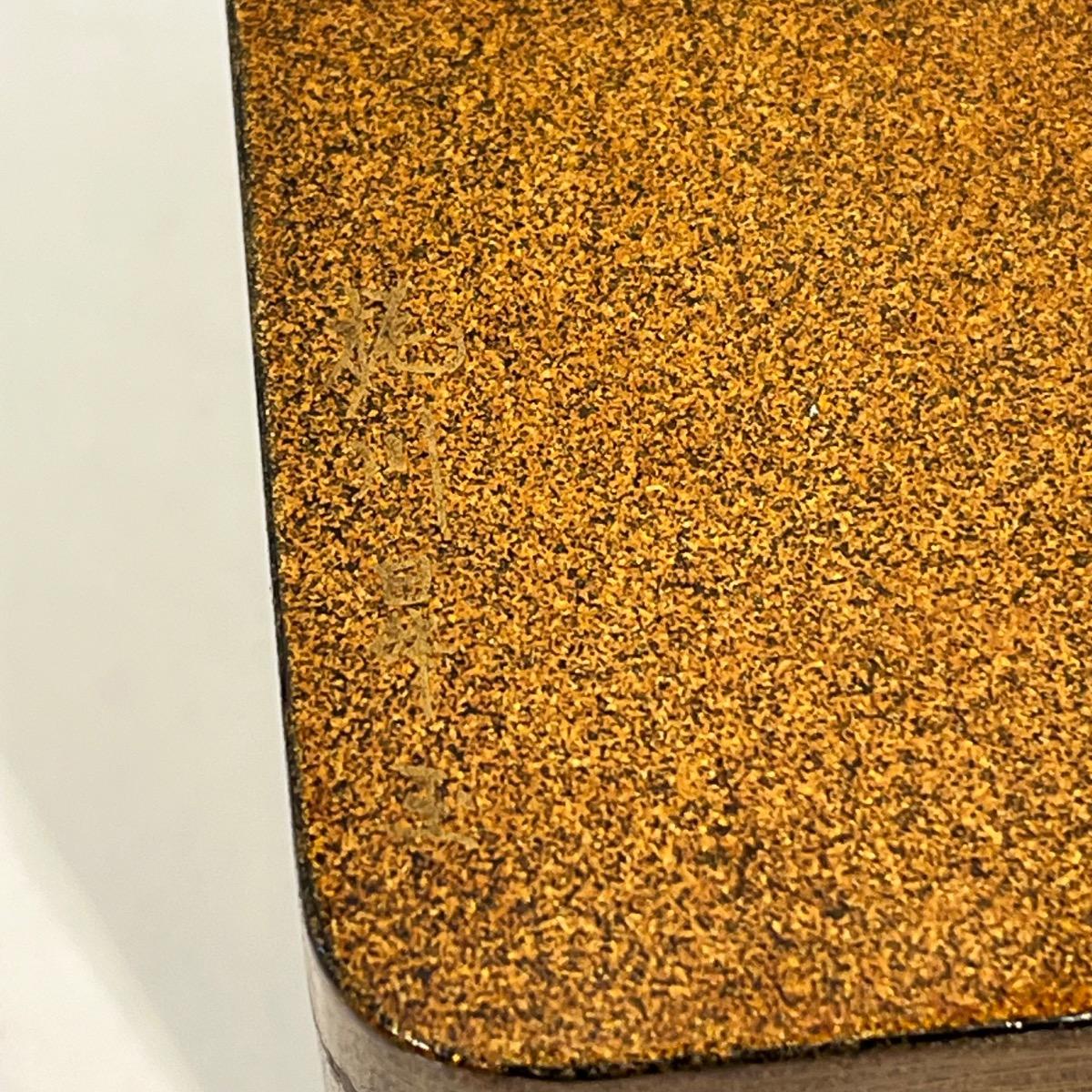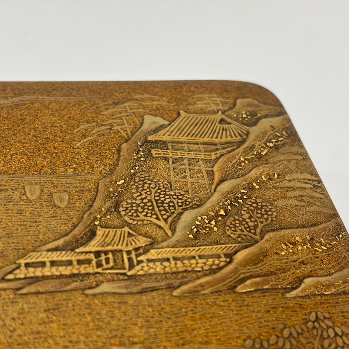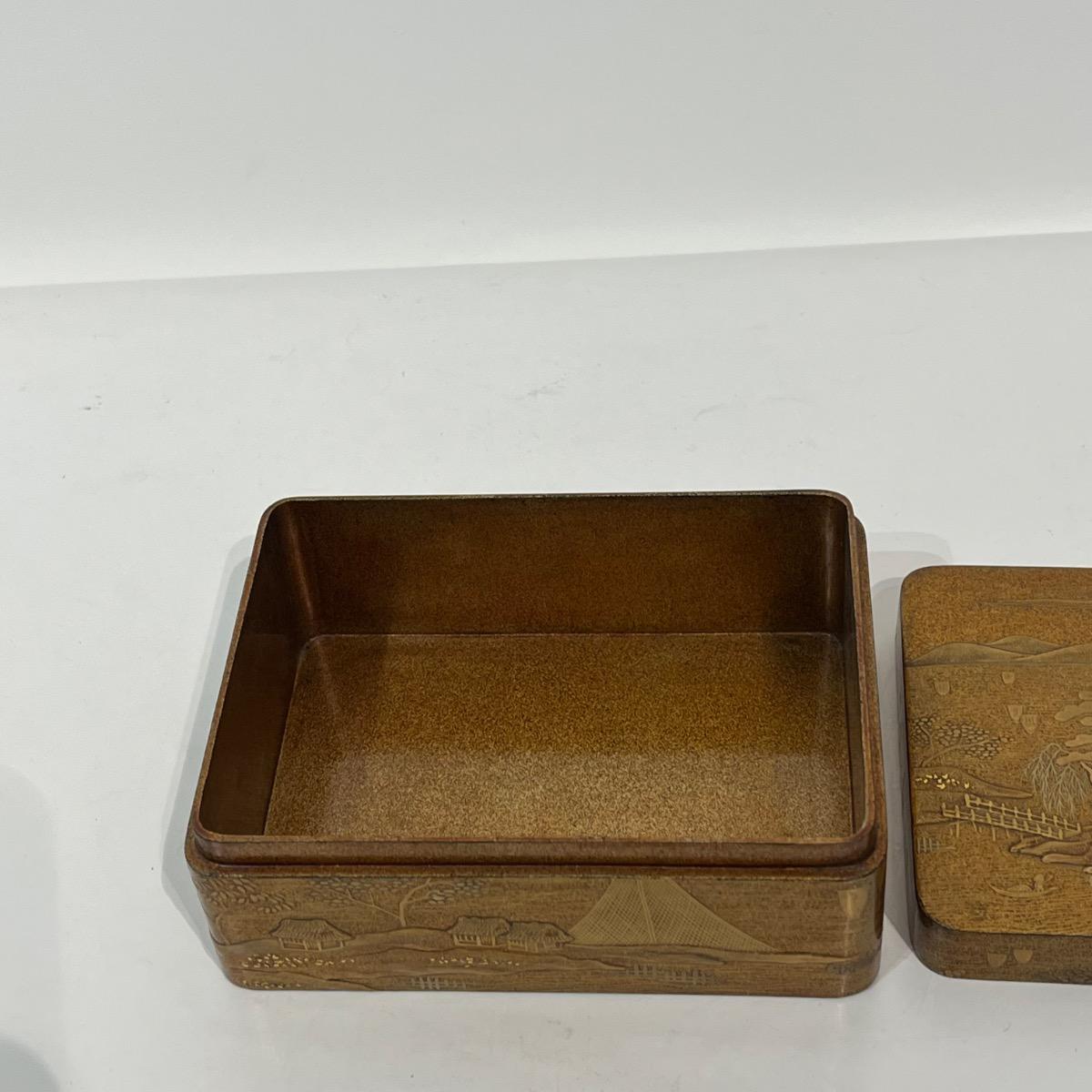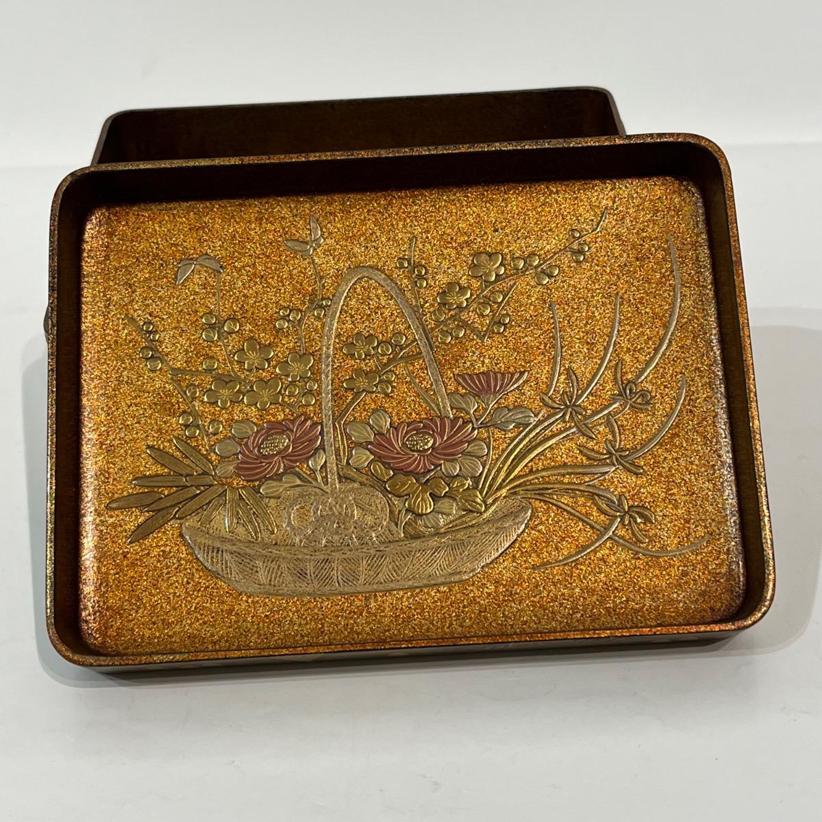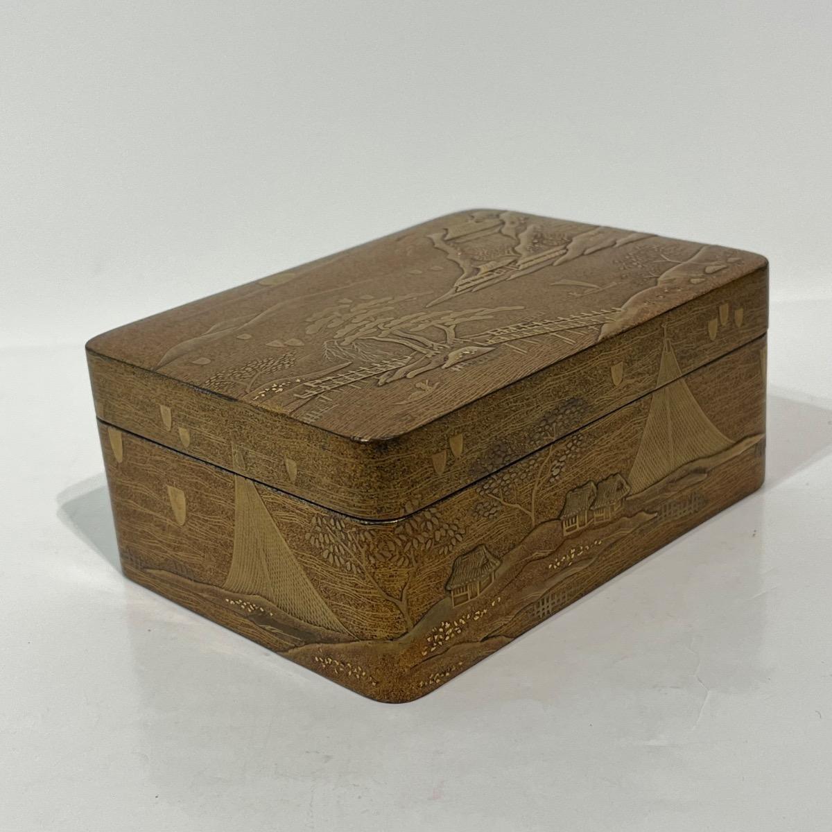 Boîle en bois sculpté et laqué richement décorée en laque nashiji et takamakie. Le décor représentante un paysage au bord de mer avec un temple et des bateaux de pêche. Sur le devant une petite île avec un saulepleureur et un pin, traversée par un pont. A l'intérieur, laqu nashiji et sous le couvercle un décor de panier de fleurs et papillons. Très belle qualité de laque. Signature dessous. Japon, ère Edo (début XIXème), 14 x 10,5 x 6 cm.