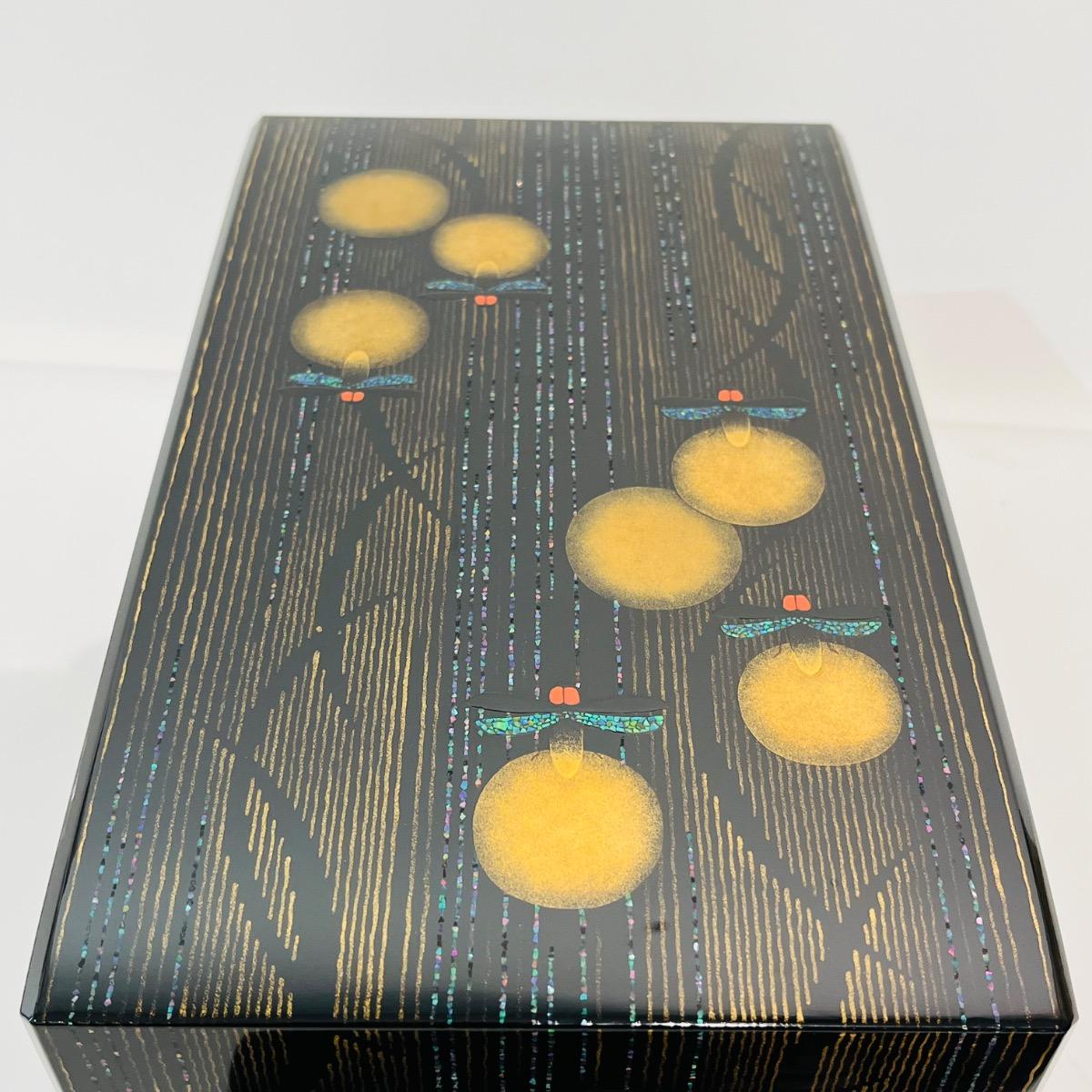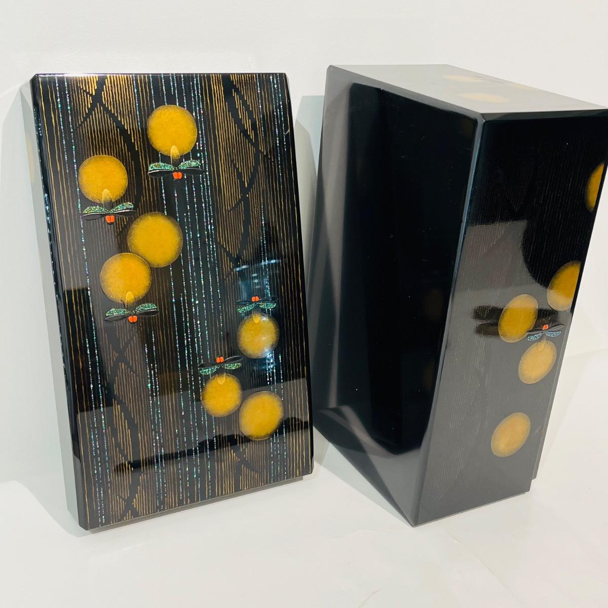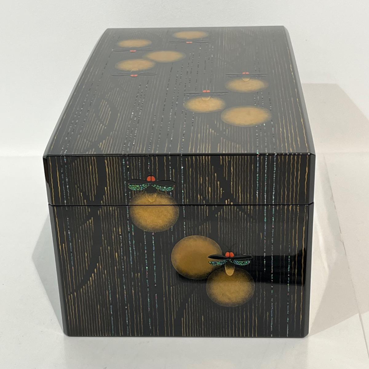 Boîte chabako pour presenter les ustensiles de la cérémonie du thé. Bois laqué aux décors de lucioles lumineuses. Les ailes des lucioles sont avec des incrustations de nacre et la lumière est en poudre d'or. Toute la boîte est décorée avec des délicates incrustations de nacre et de la poudre d'or évoquant des herbes. L'intérieur laisse apparaître le textile avec la laque rouge et noire reprenant la trame du textile. Un travail de laque exceptionne, d'une grande élégance et poétique, reprenant le thème traditionnel japonais du kacho, animal et végétal. Artiste : Takase Ryuichi (1928-2017), célèbre primé à de multiples reprises. Japon, circa 1990, 27 x 14 x 16,5 cm. Avec sa boîte d'origine signée par l'artiste.