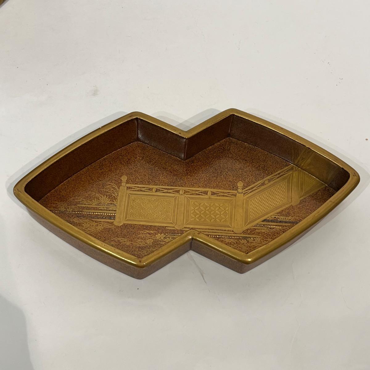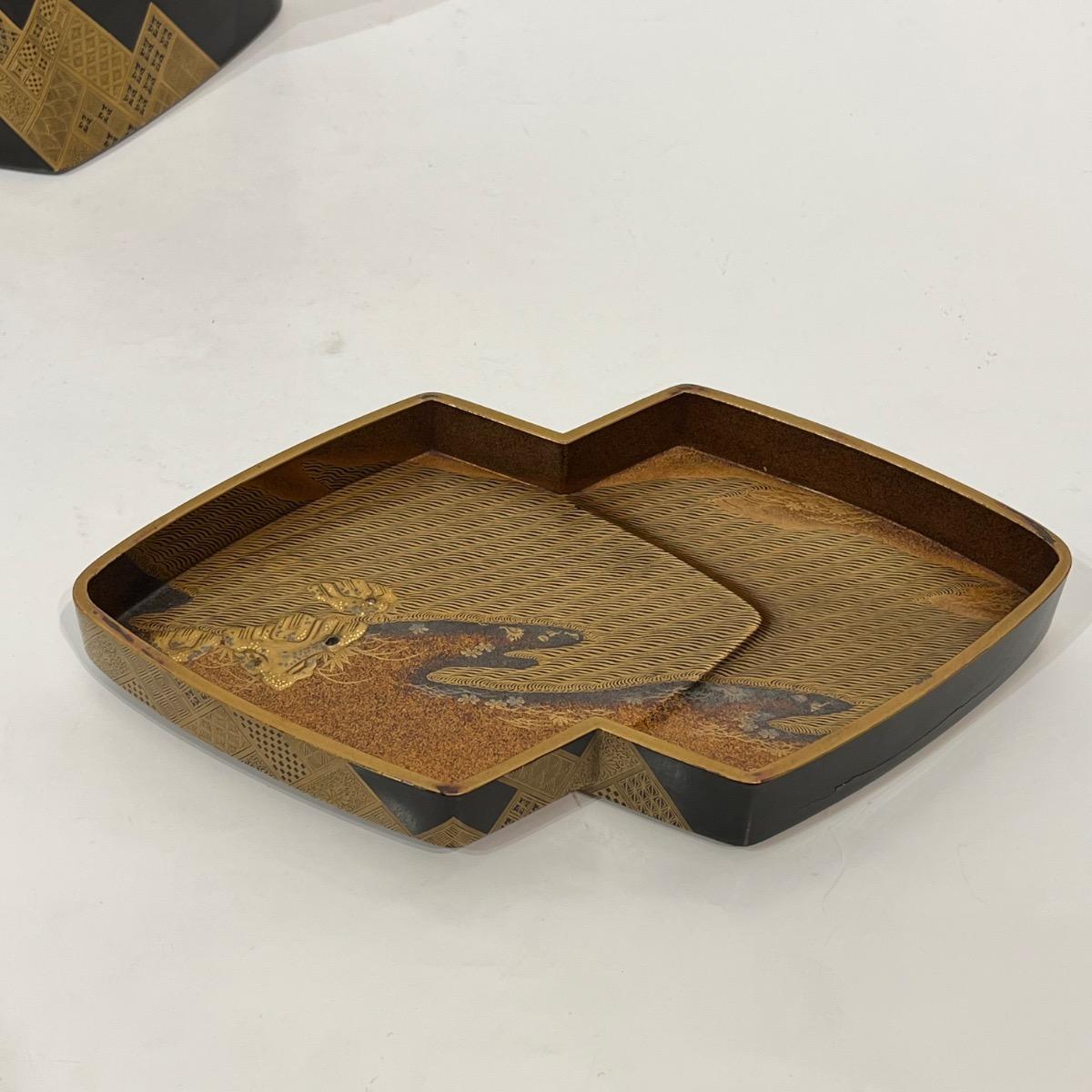 Le plateau intérieur est également en laque nashiji avec un décor de barrière reprenant les motifs géométriques et des végétaux en laque makie or et kirigane.
