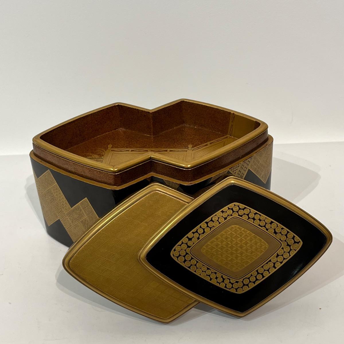 À l'extérieur de la boîte, des décors géométriques et traditionnels en laque makie or sur fond noir.