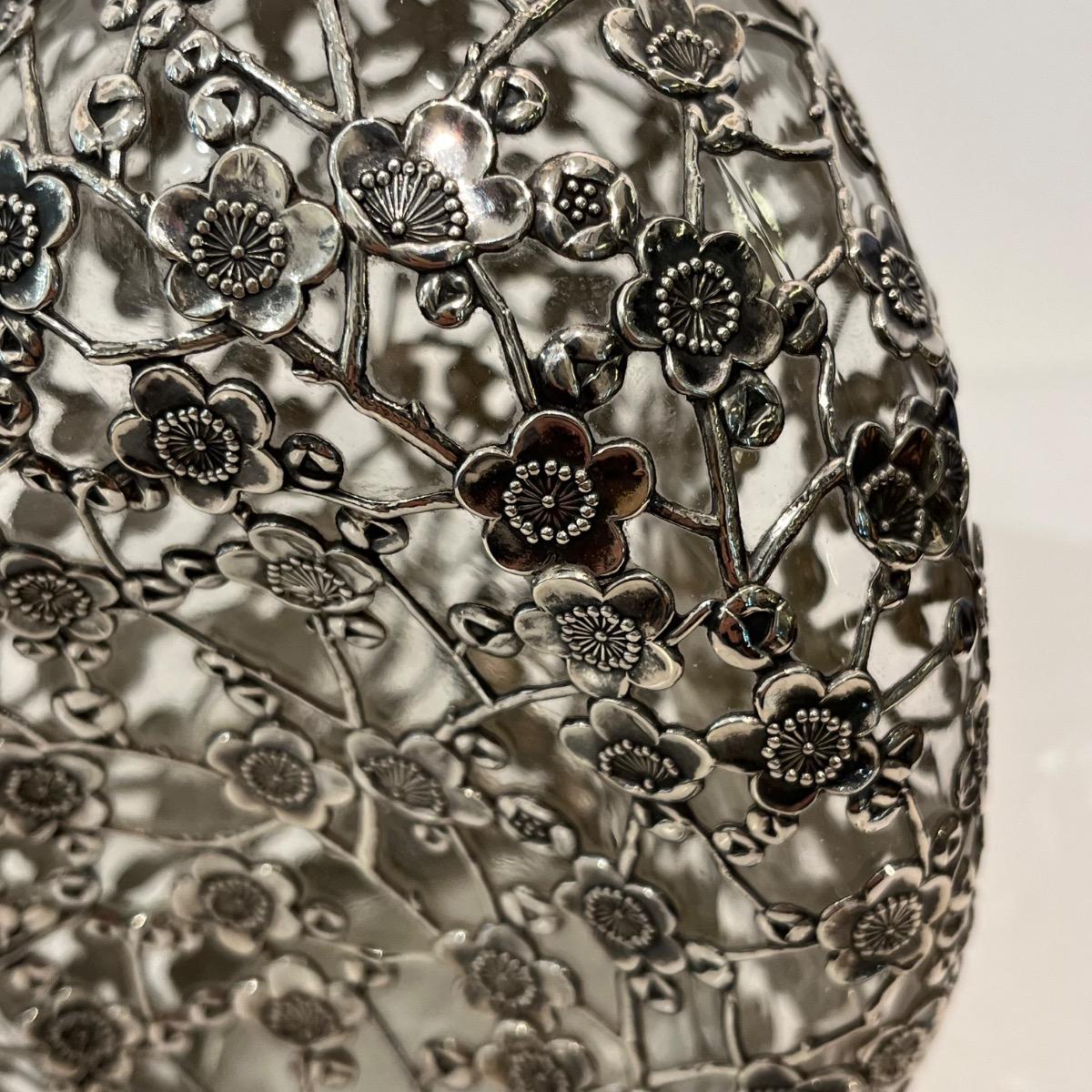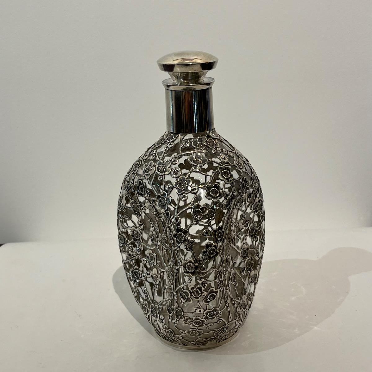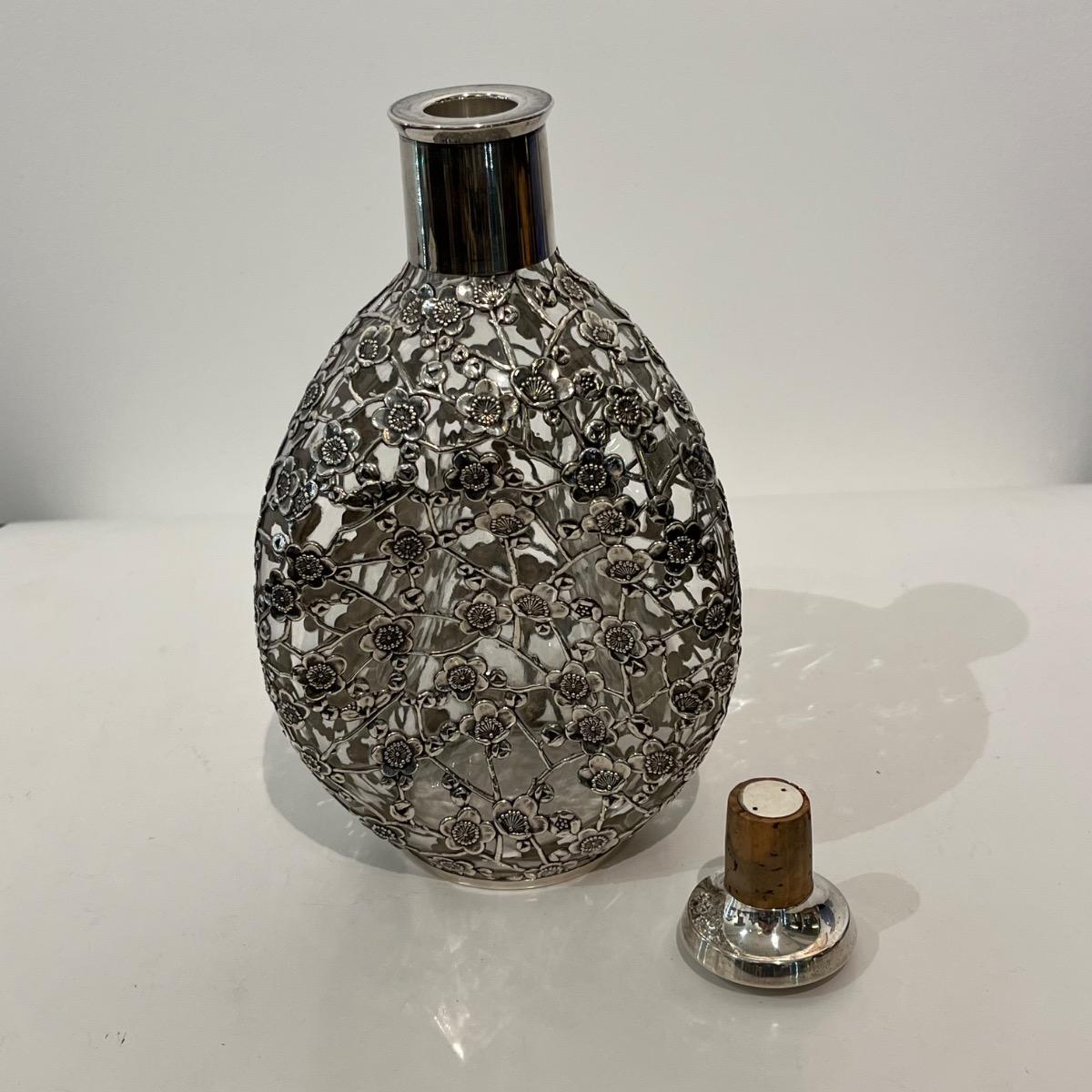 Carafe polylobée en verre recou d´un décors de fleurs de sakura en argent massif.