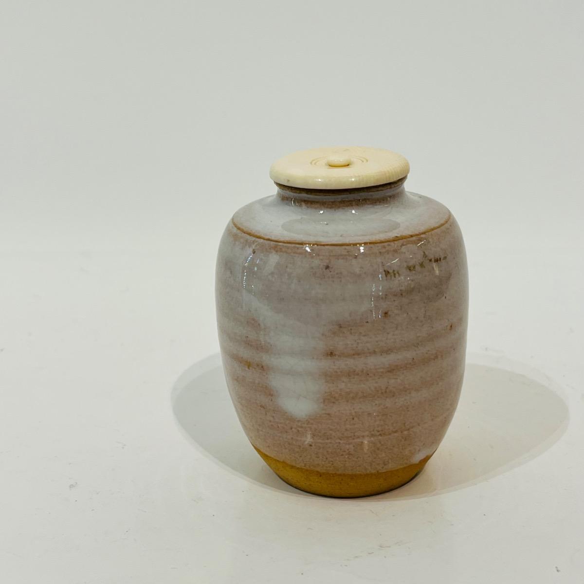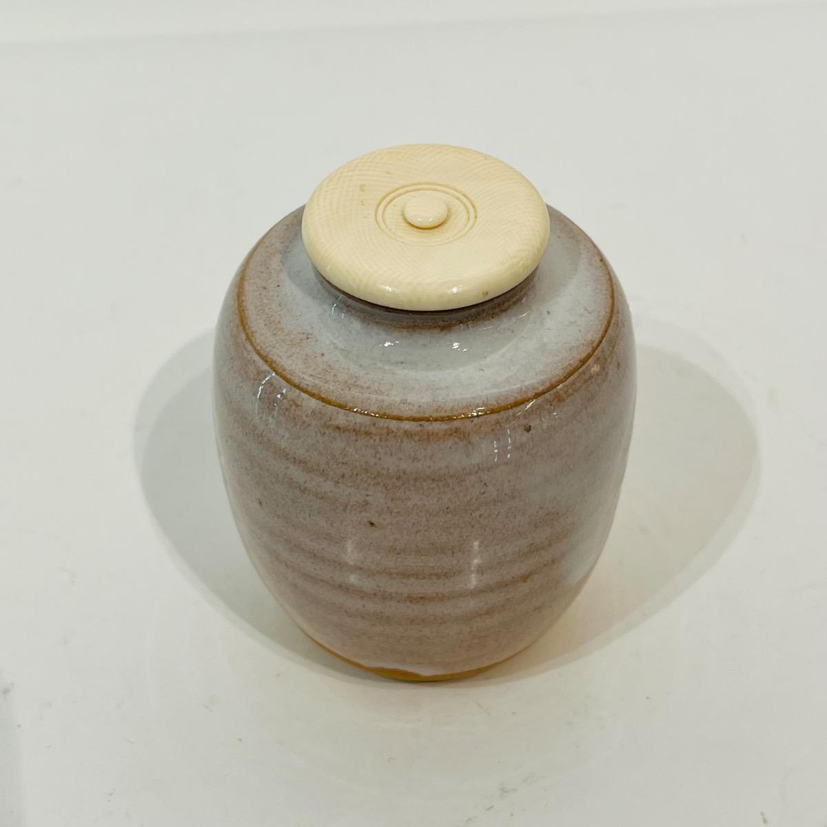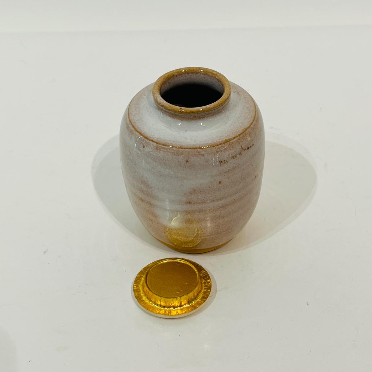 Chai-ire, boîte à thé en céramique de Hagi avec un émail blanc laissant apparaître la terre cuite et le travail de façonnage, avec couvercle en os sculpté recouvert de feuille d'or à l'intérieur du couvercle. Sceau de l'artiste sous la pièce. La pièce a également son sac en soie shifuku ainsi que sa boîte d'origine signée par l'artiste . Japon, circa 1980, 8 x 6 cm.