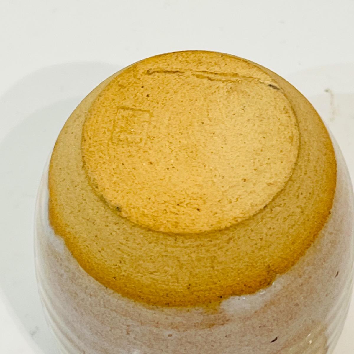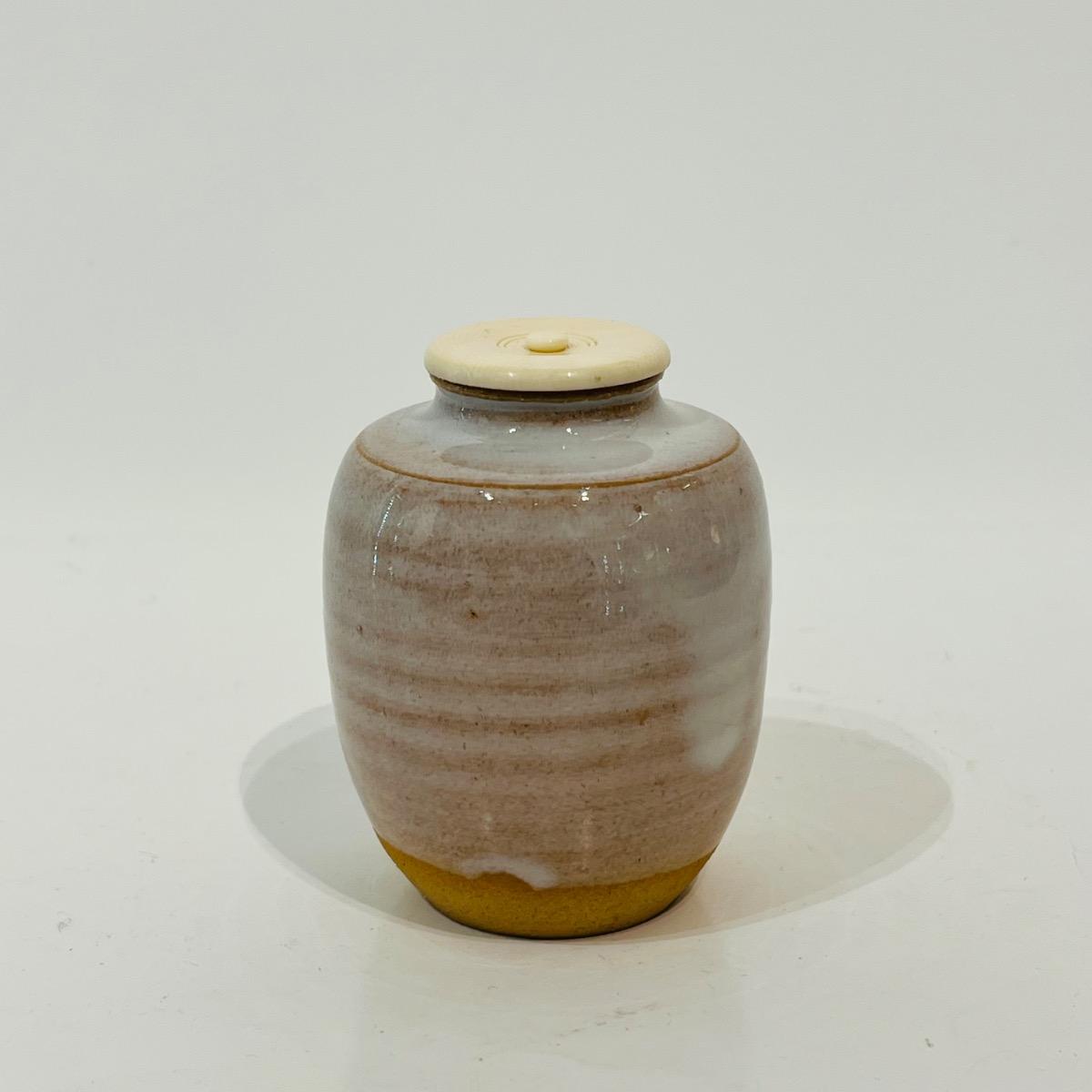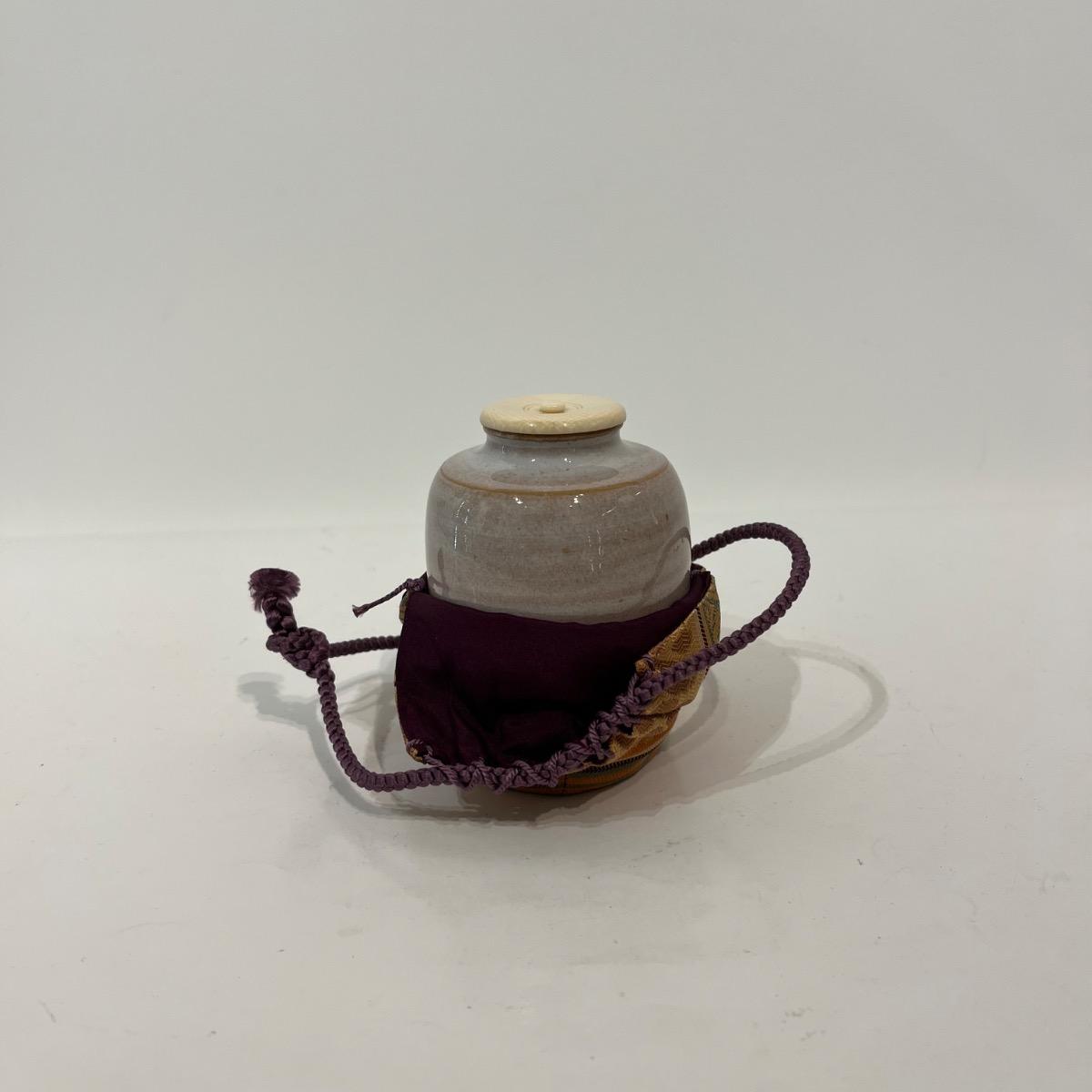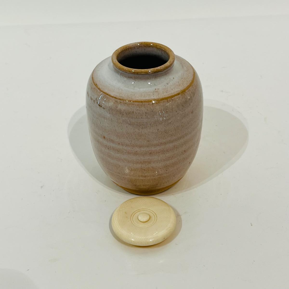 Chai-ire, boîte à thé en céramique de Hagi avec un émail blanc laissant apparaître la terre cuite et le travail de façonnage, avec couvercle en os sculpté recouvert de feuille d'or à l'intérieur du couvercle. Sceau de l'artiste sous la pièce. La pièce a également son sac en soie shifuku ainsi que sa boîte d'origine signée par l'artiste . Japon, circa 1980, 8 x 6 cm.
