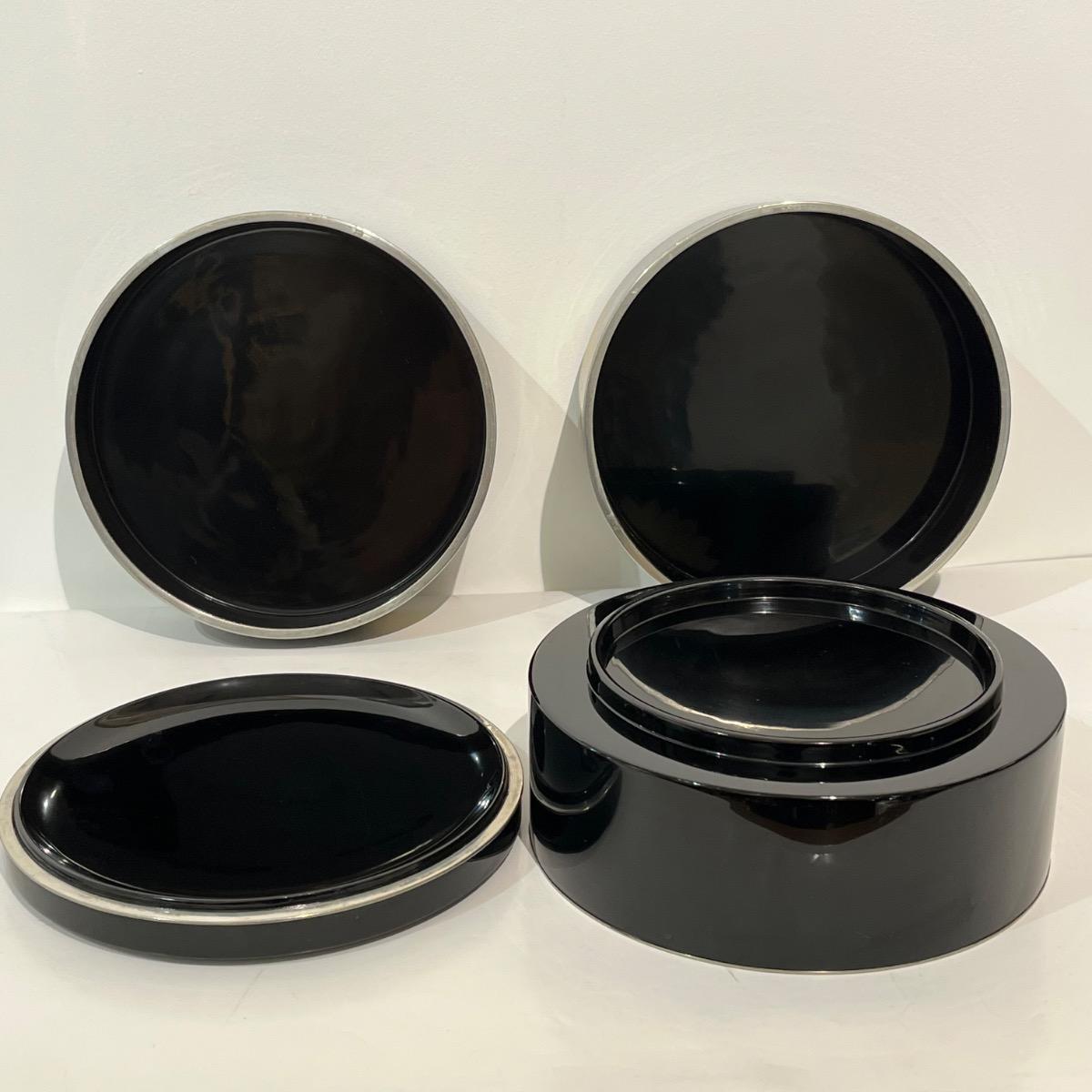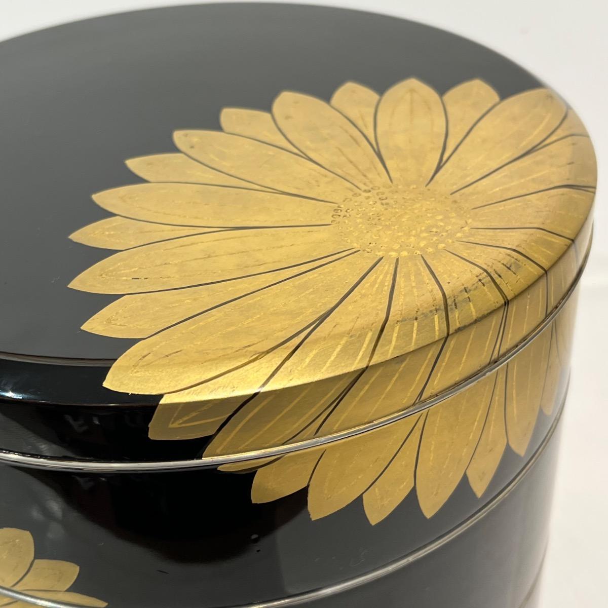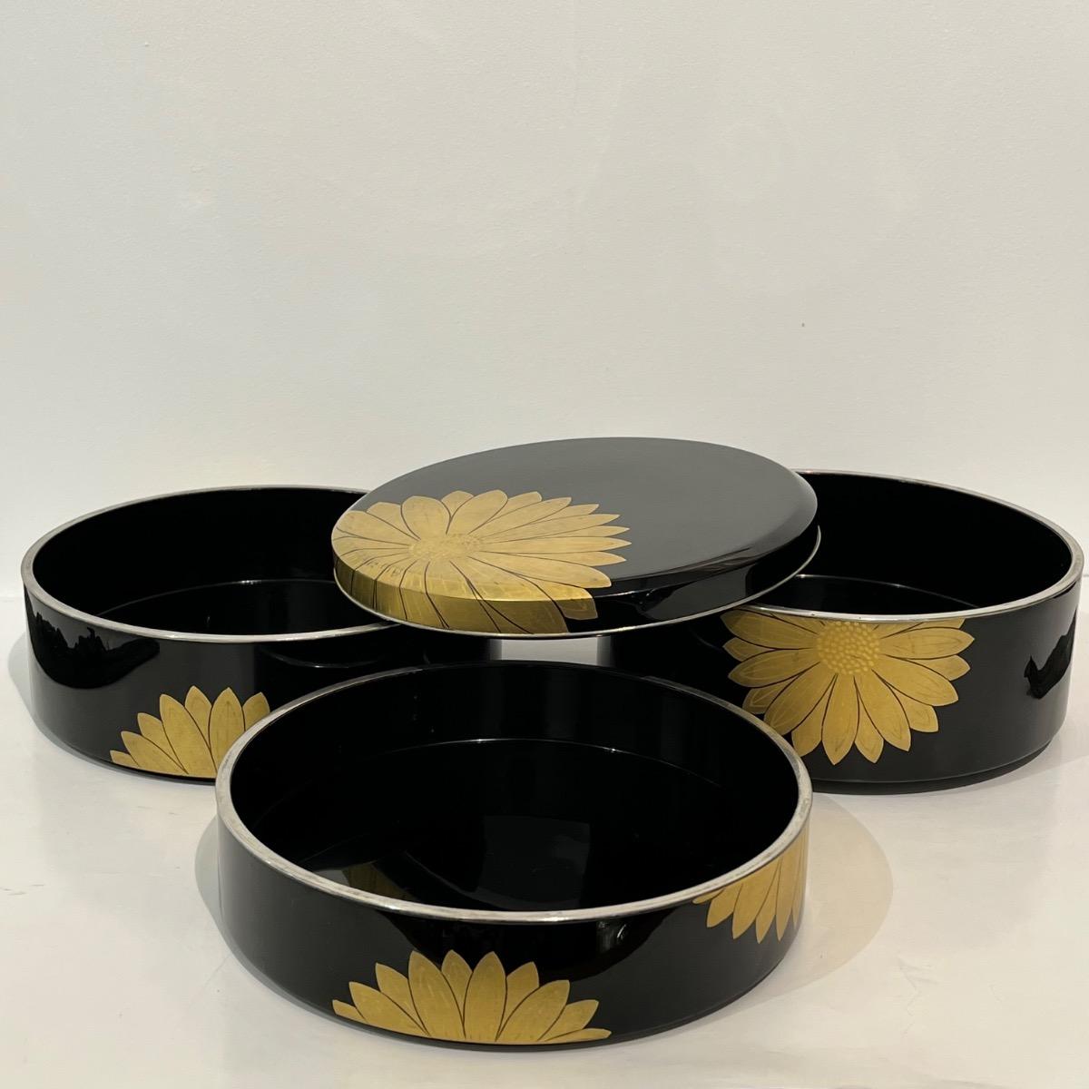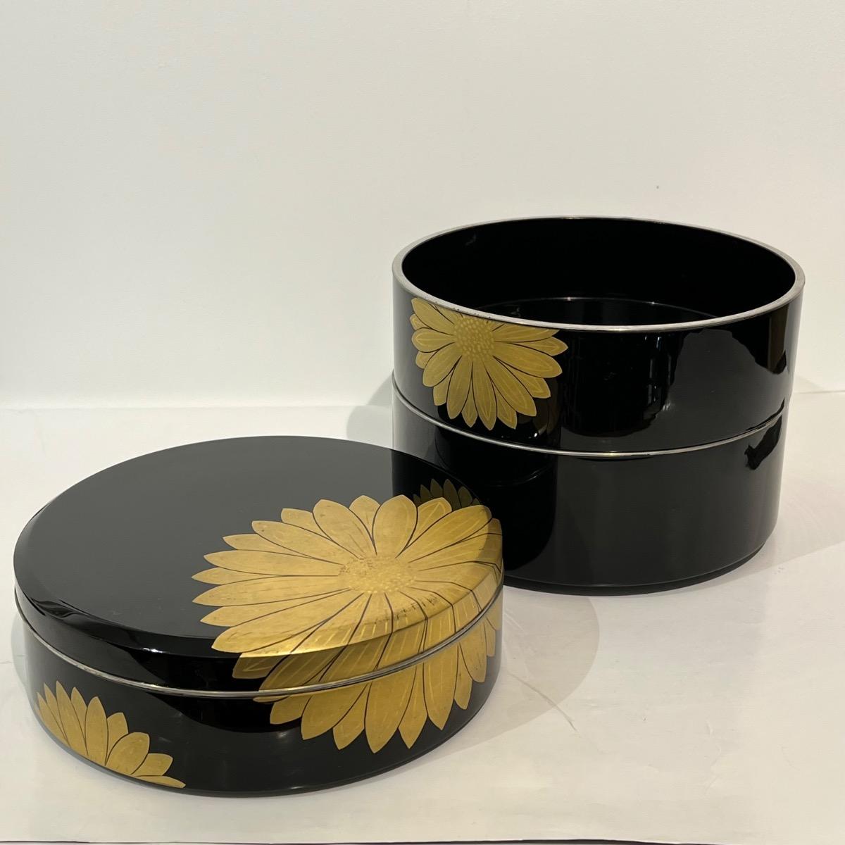 Jubako, boîte à pique-nique à trois niveaux en laque noire au décor de fleurs de chrysanthèmes en laque makie or. Rebords en métal. Pièce minimaliste pouvant servir pour un usage alimentaire ou simplement décoratif. Japon, circa 1940, 19 x 18,5 cm.
