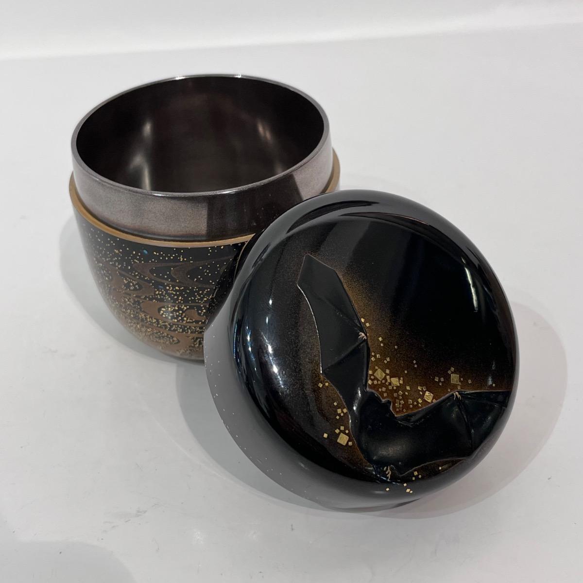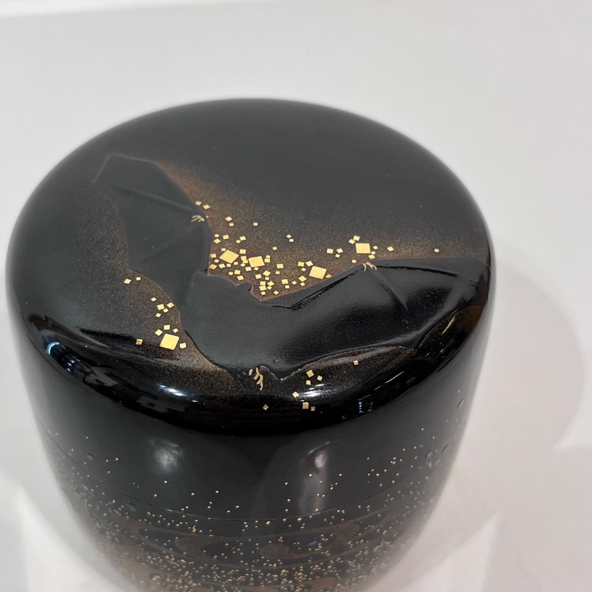 En bois laqué d'un noir profond avec, sur le couvercle, un décor de chauve-souris créé par le contour en kirigane (petits carrés de feuille d'or) et l'épaisseur de la laque.