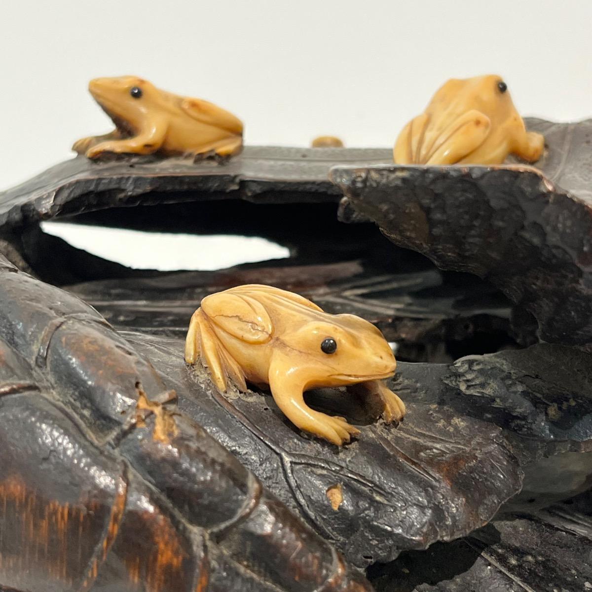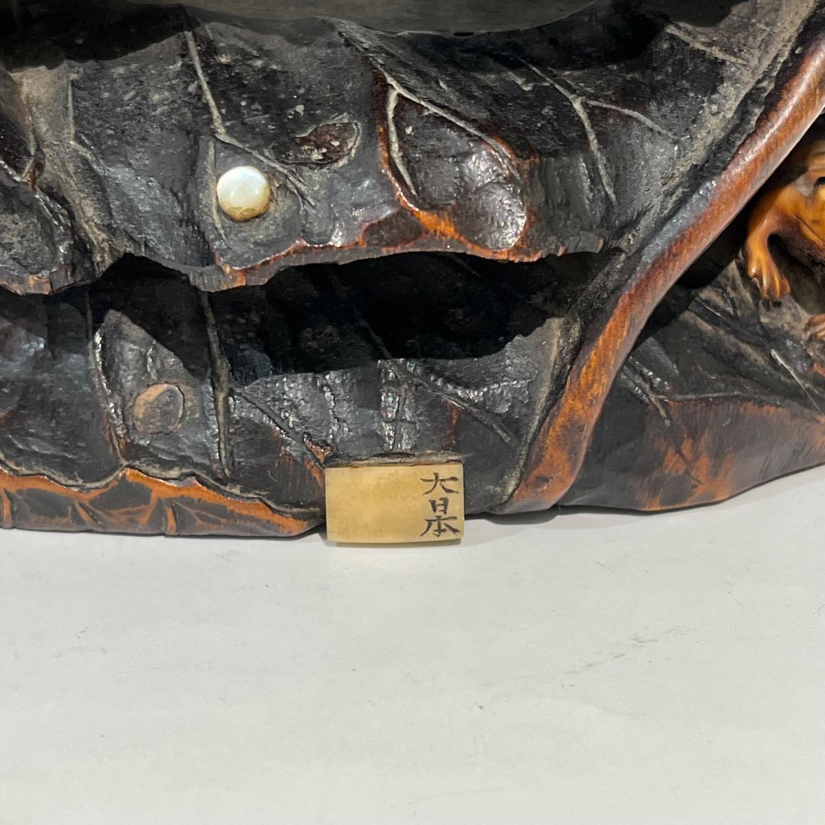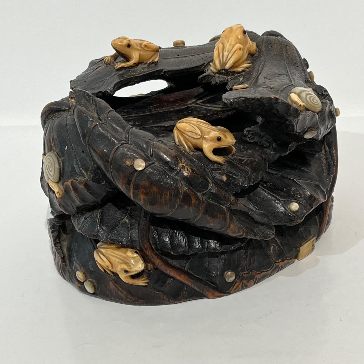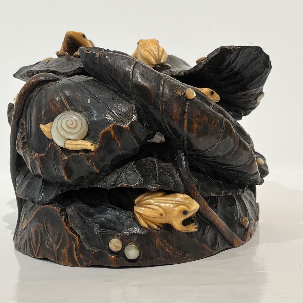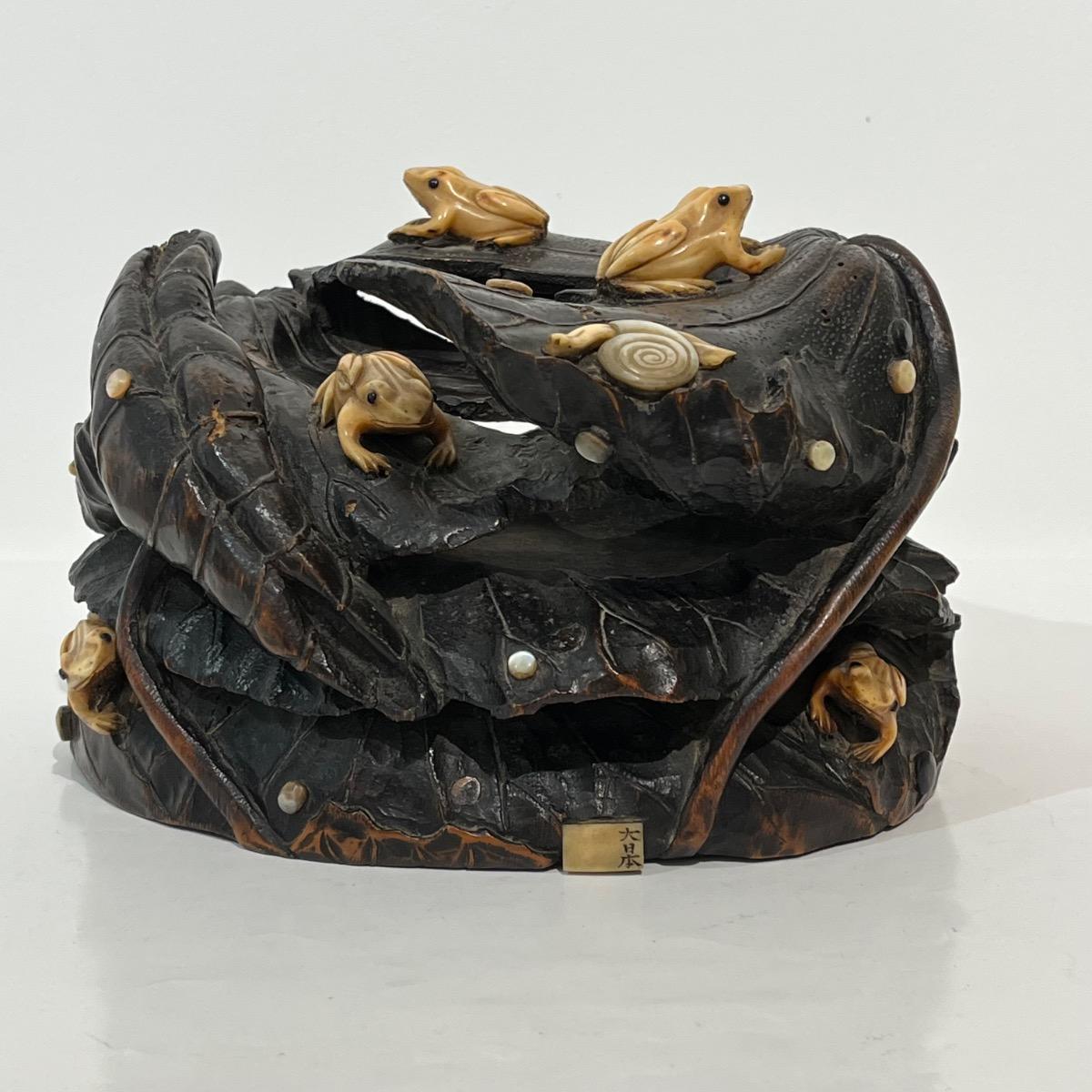 Okimono feuilles de lotus sculptées dans une seule pièce de bois, avec des grenouilles et escargots en bois de cerf et nacre. Dessous avec trois moineaux en nacre.