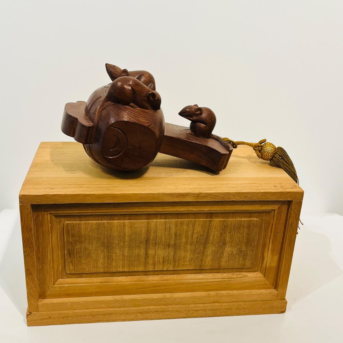 Okimono sculpture japonaise en bois souris sur maillet