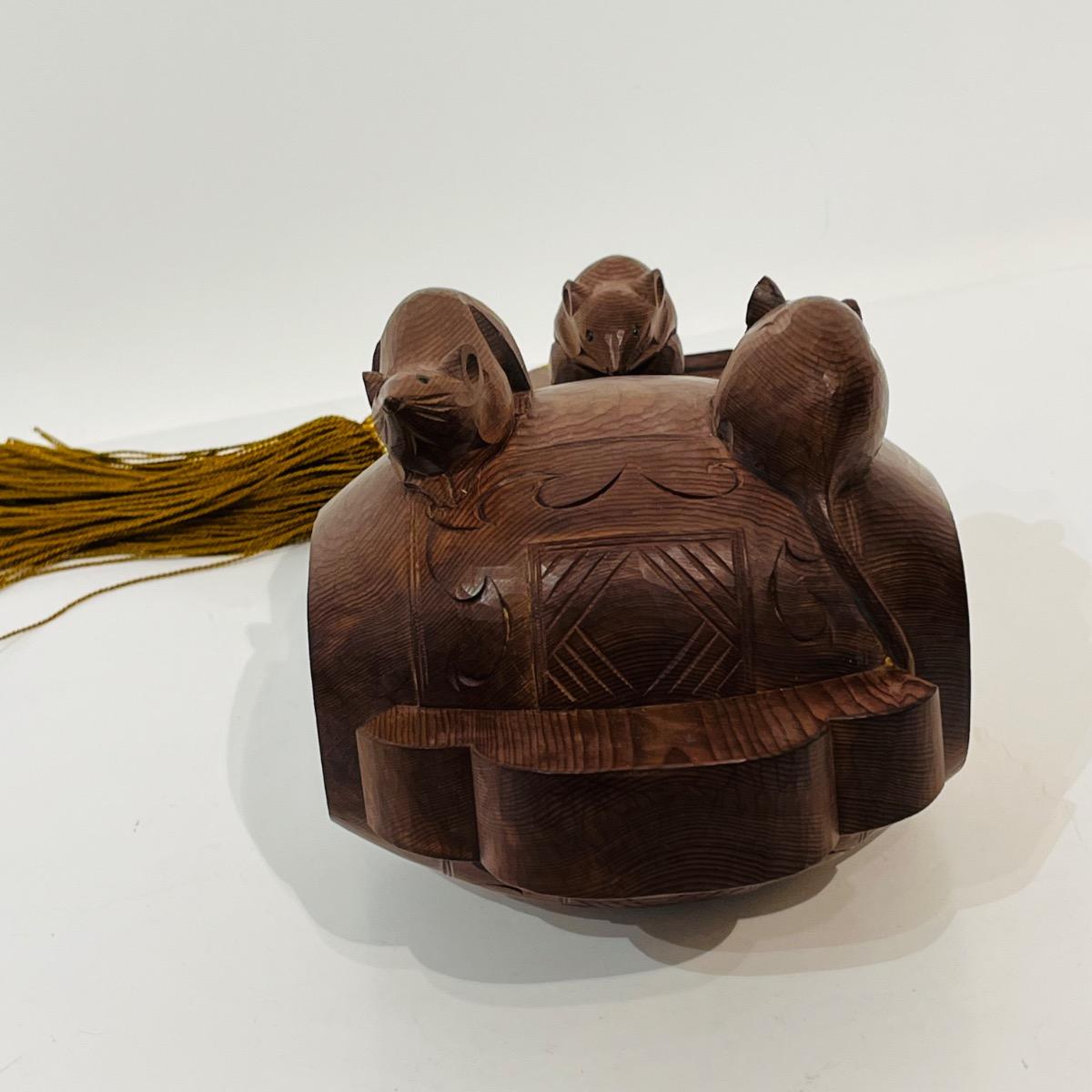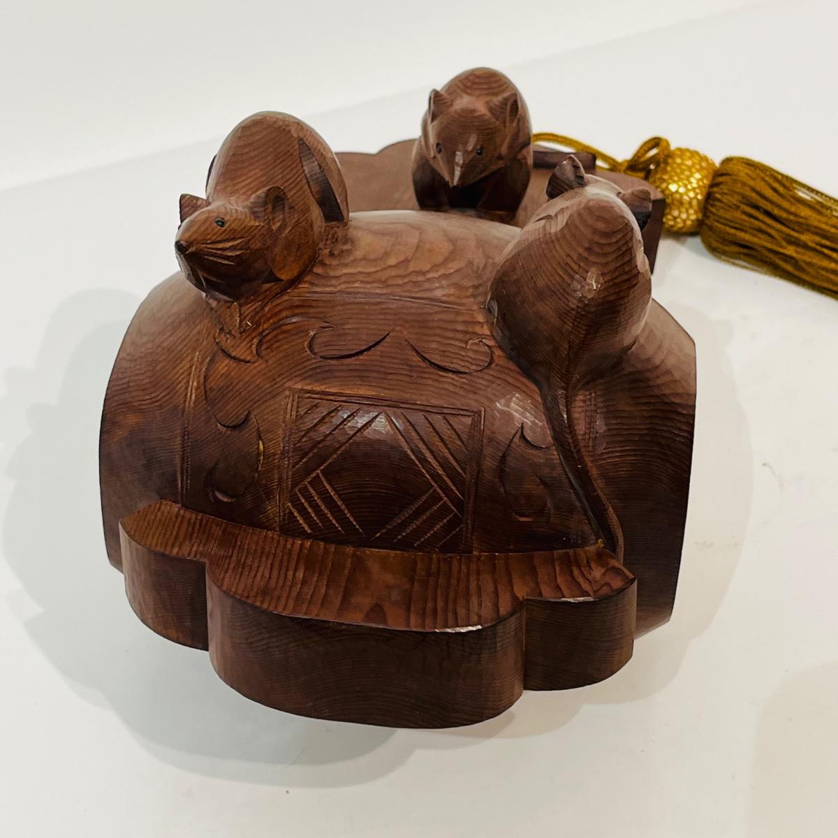 Okimono, sculpture en bois représentant trois souris sur le maillet de Daikokuten, dieu du commerce et des paysans.