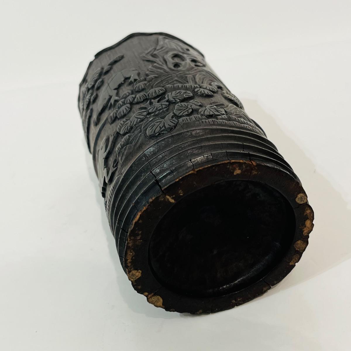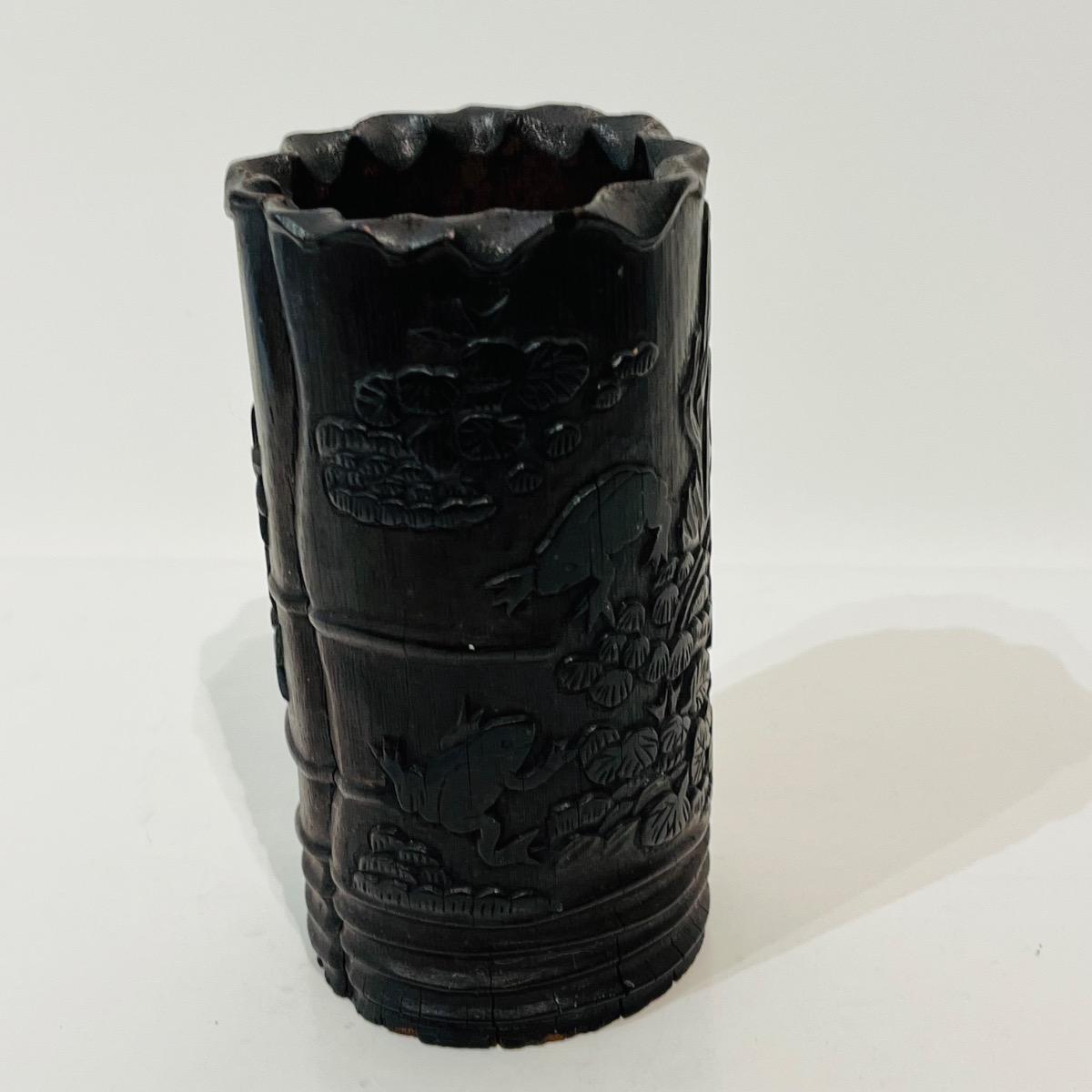 en bambou sculpté avec un décor kacho (animal et végétal) représentant deux grenouilles, un rocher et plantes.