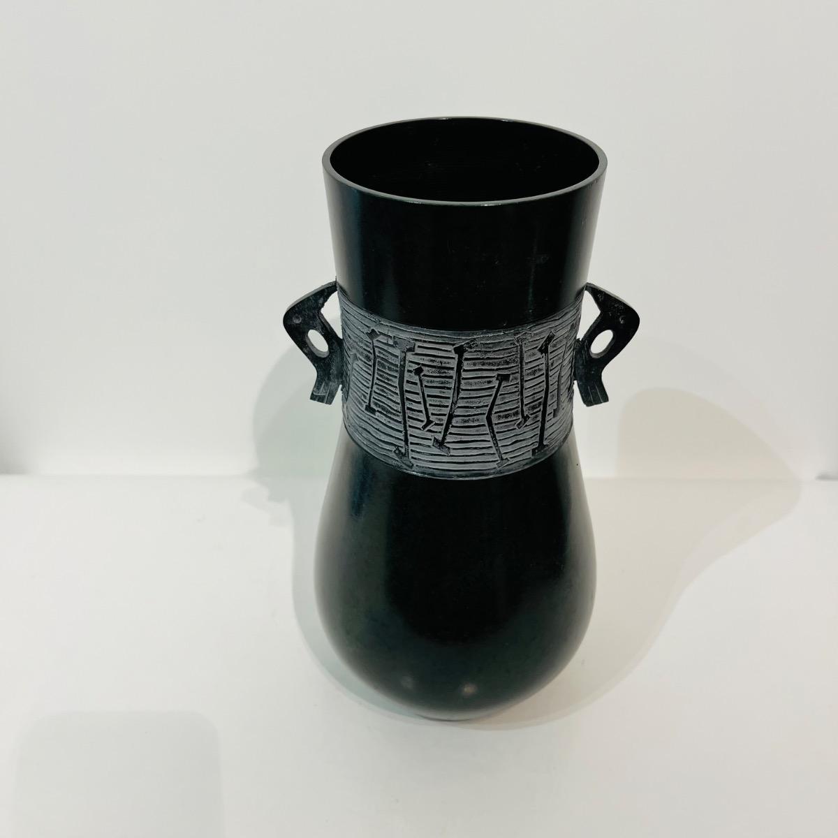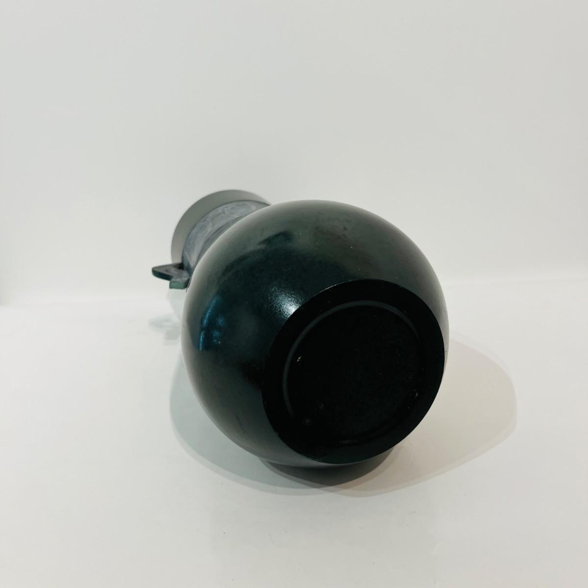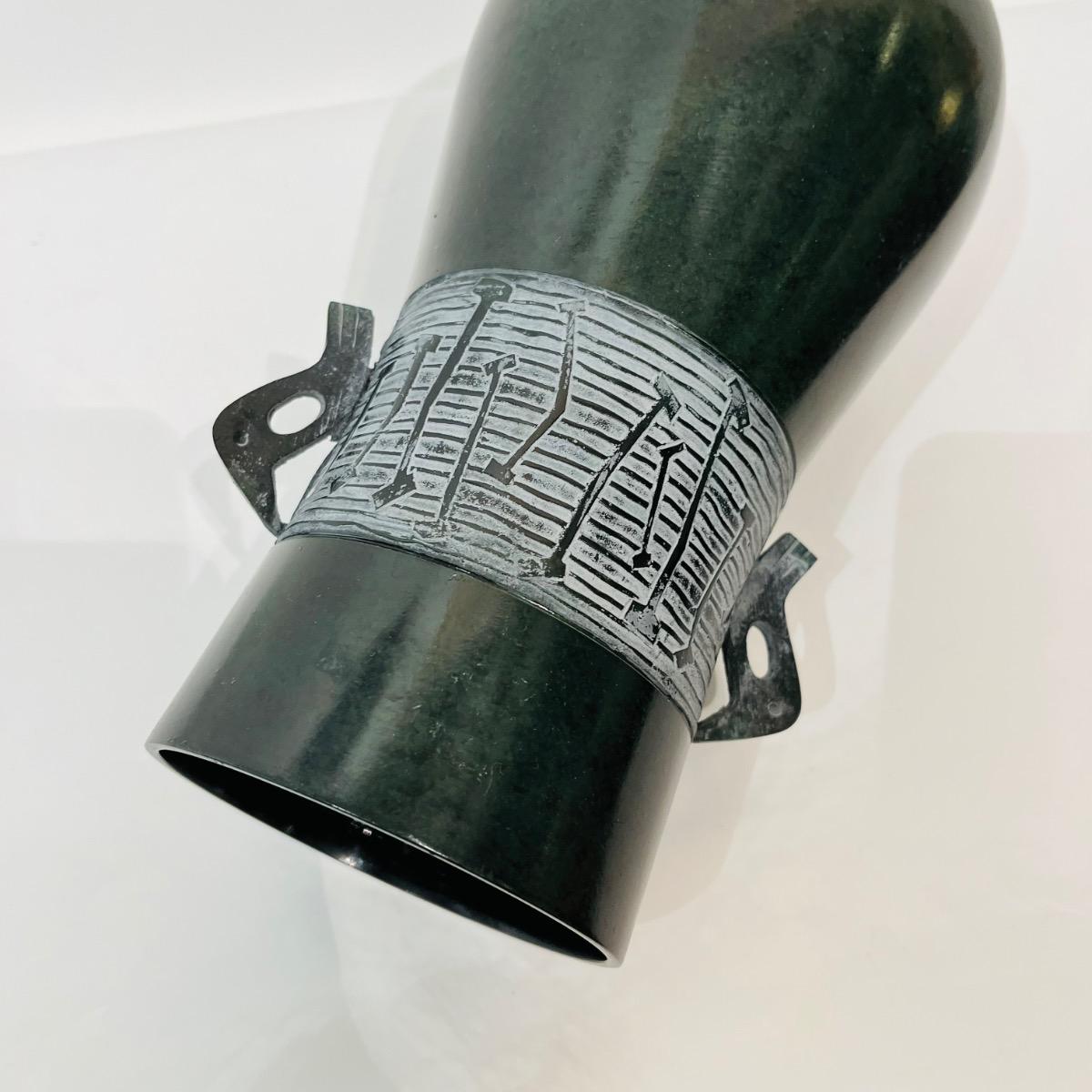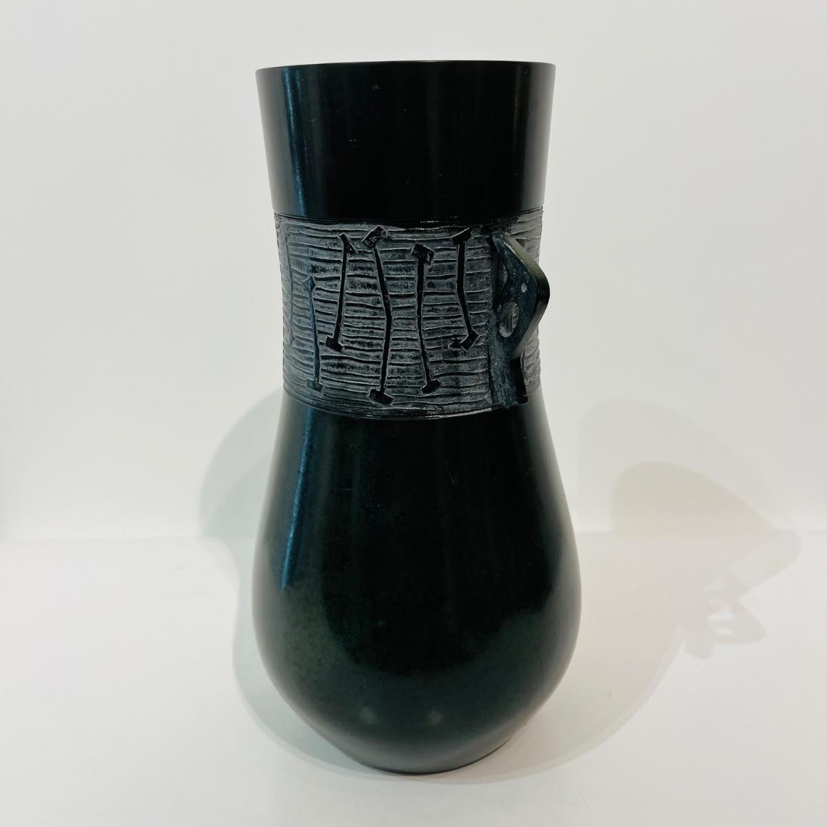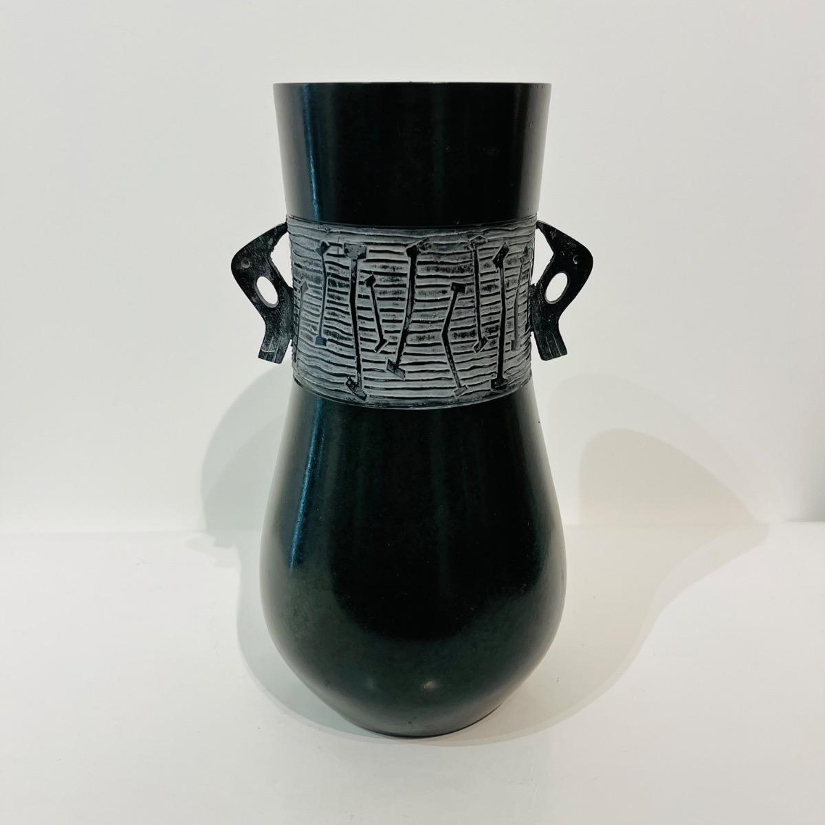 Grand vase en bronze à patine verte aux décors abstraits cisélés et anses en forme d'oiseaux stylisés. Japon, années 1970, 27 x 14,8 cm.