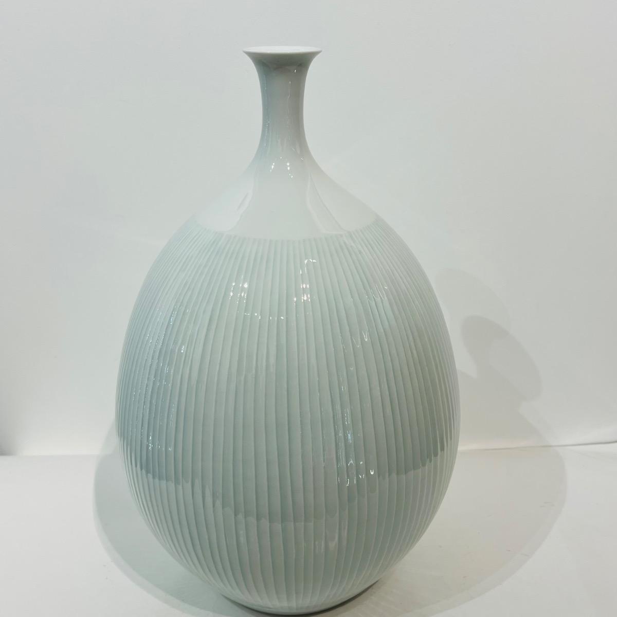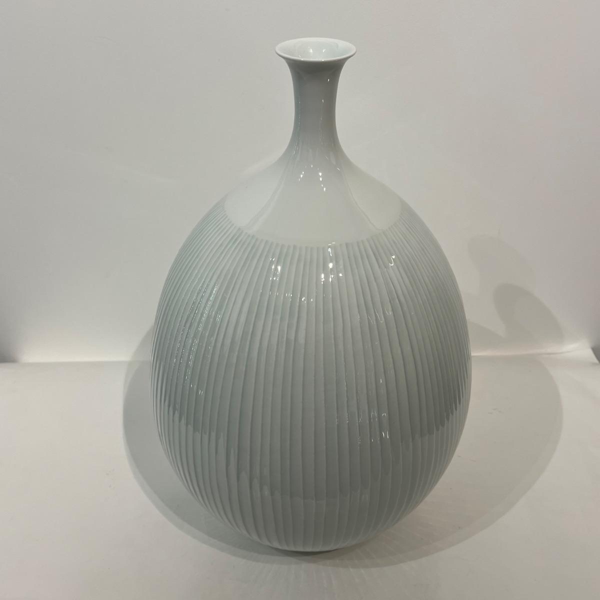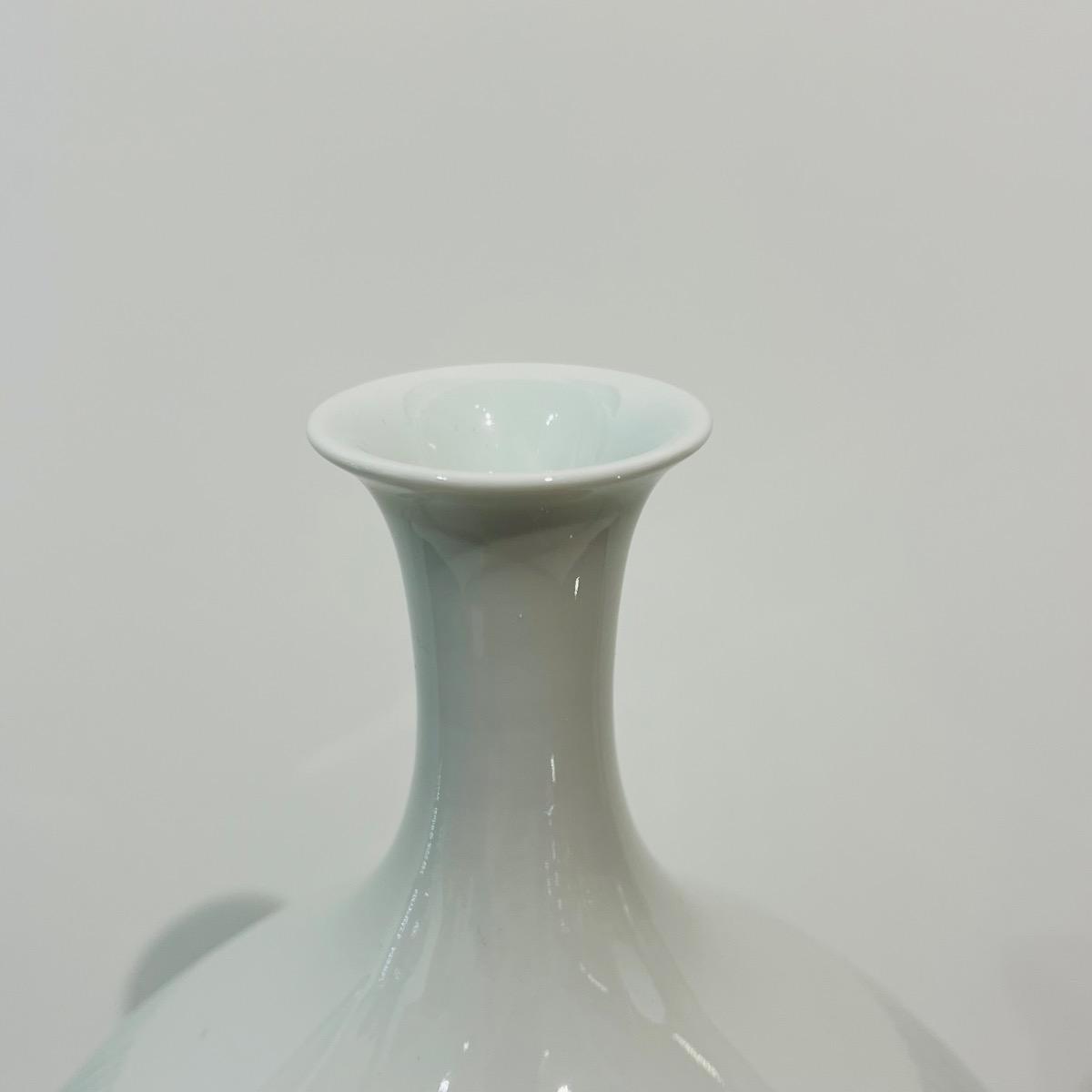 Grand et élégant vase en porcelaine céladon du célèbre artiste céramiste d'Arita Fujii Shumei. L'artiste a gagné de multiples prix et fait partie de nombreuses collections publiques à travers le monde. Cette pièce est particulière dans son travail avec aucun motif figuratif, mettant en avant la matière et le céladon japonais (seihakuji). Japon, circa 1980, 35,5 x 23 cm. Avec sa boîte d'origine signée par l'artiste.