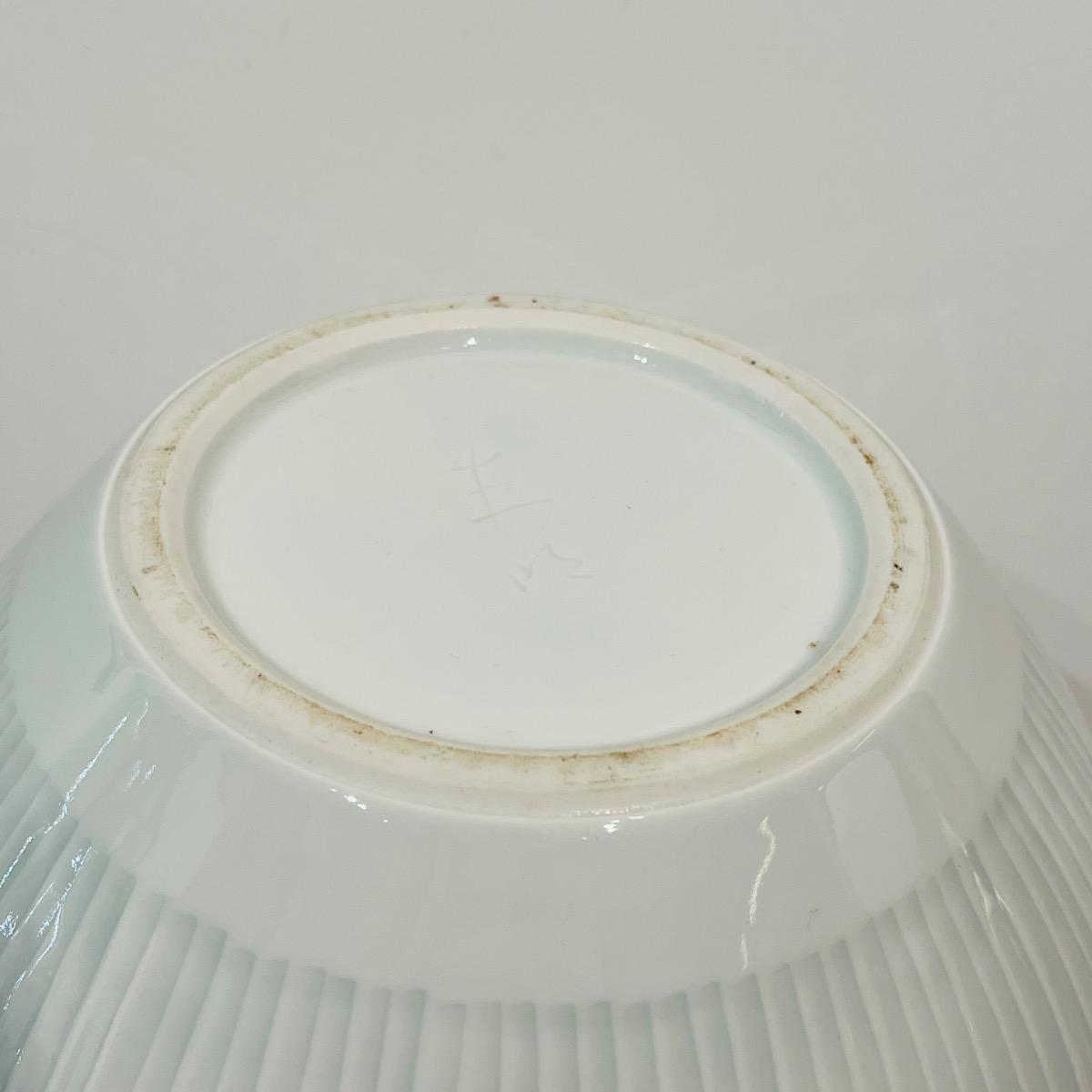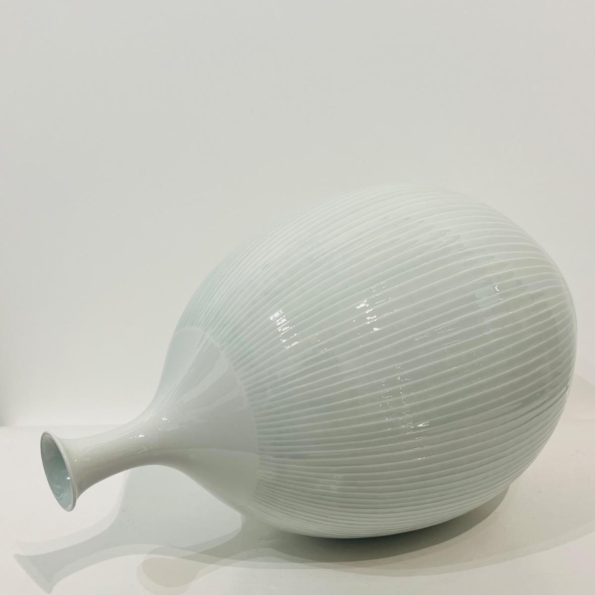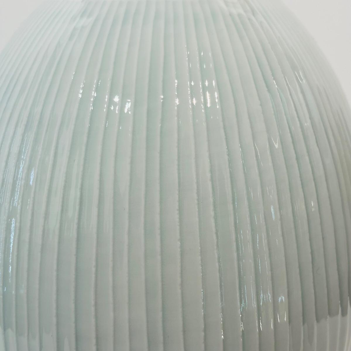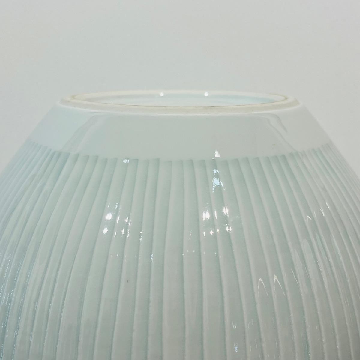 Grand et élégant vase en porcelaine céladon du célèbre artiste céramiste d'Arita Fujii Shumei. L'artiste a gagné de multiples prix et fait partie de nombreuses collections publiques à travers le monde. Cette pièce est particulière dans son travail avec aucun motif figuratif, mettant en avant la matière et le céladon japonais (seihakuji). Japon, circa 1980, 35,5 x 23 cm. Avec sa boîte d'origine signée par l'artiste.