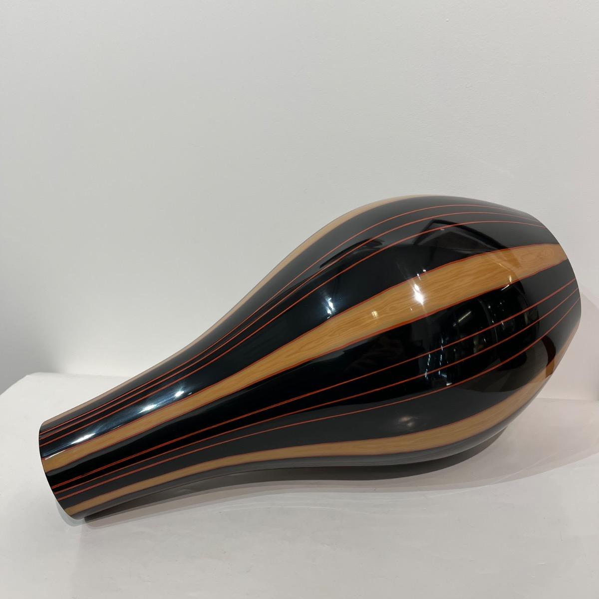 Vase en laque sèche , dite kanshitsu en japonais, aux lignes minimalistes. Pièce decorative très élégant, typique du style moderne japonais. Un travail de laque remarquable laissant apparaître les multiples couches de differentes laques grâce aux polissages successifs, notamment dans les lignes beiges. Pièce unique signée dessous par l'artiste Hiroyoshi Amagasa. Japon, années 1970, 41 x 22 cm avec ouverture de 7,5 cm. Avec sa boîte d'origine signée par l'artiste.