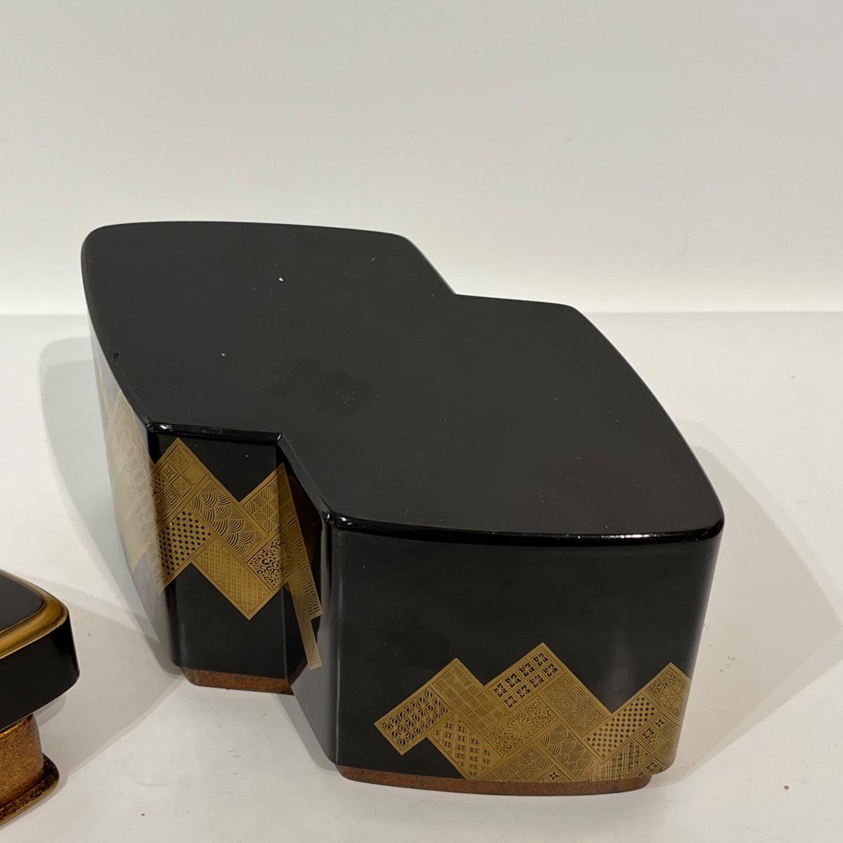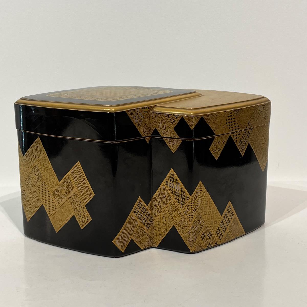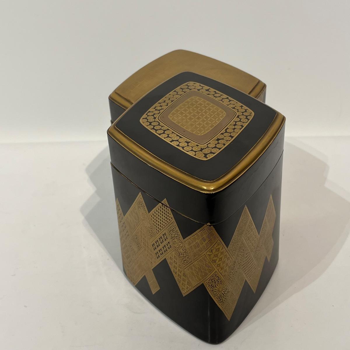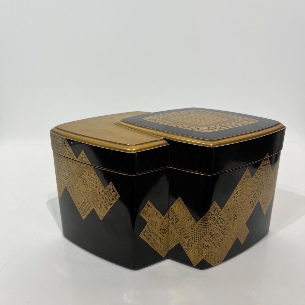 À l'extérieur de la boîte, des décors géométriques et traditionnels en laque makie or sur fond noir.
