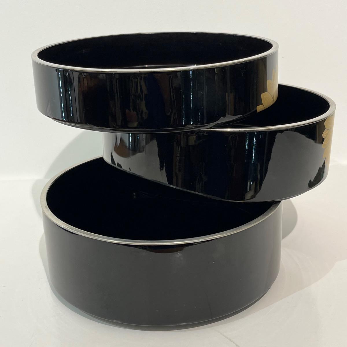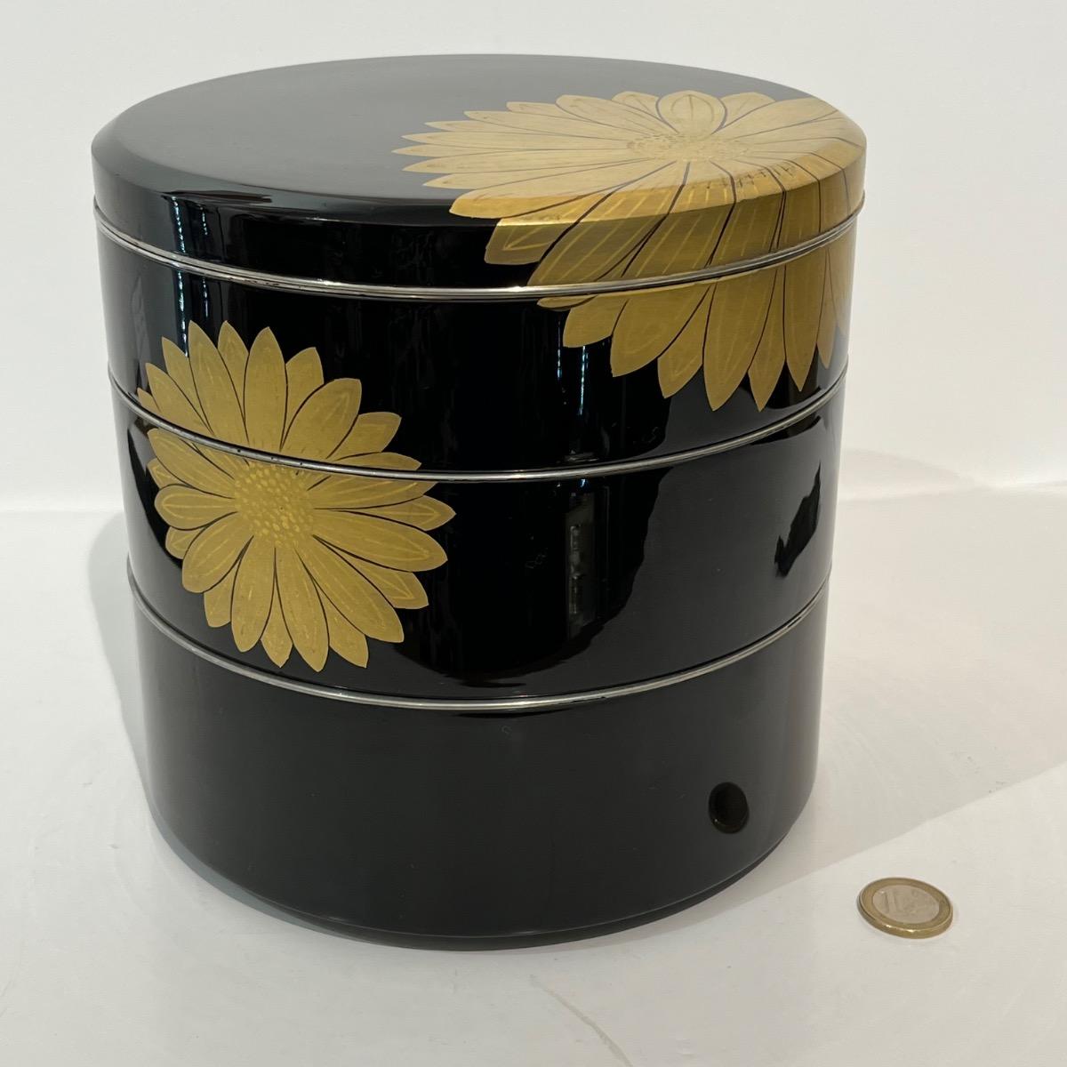 Jubako, boîte à pique-nique à trois niveaux en laque noire au décor de fleurs de chrysanthèmes en laque makie or.