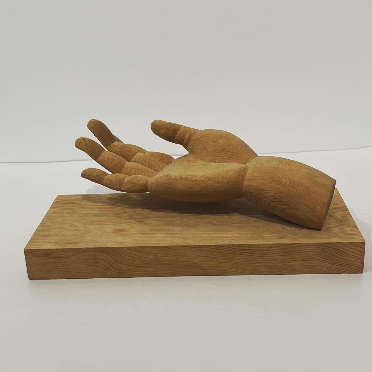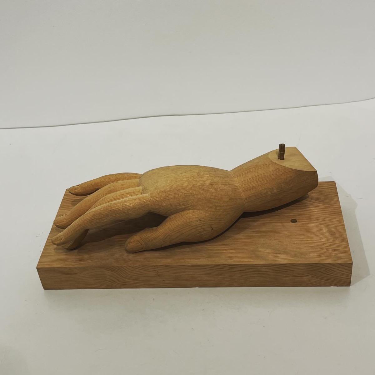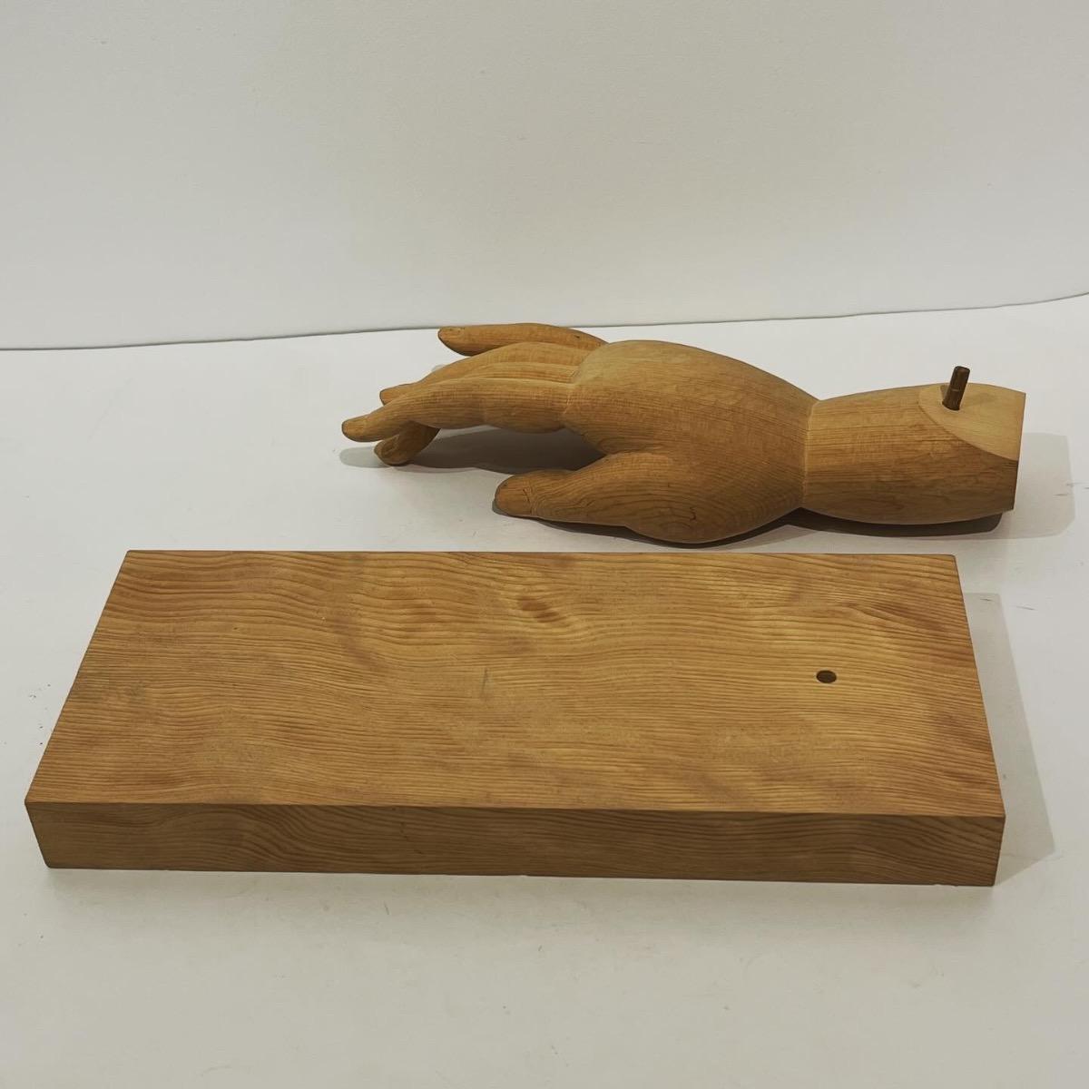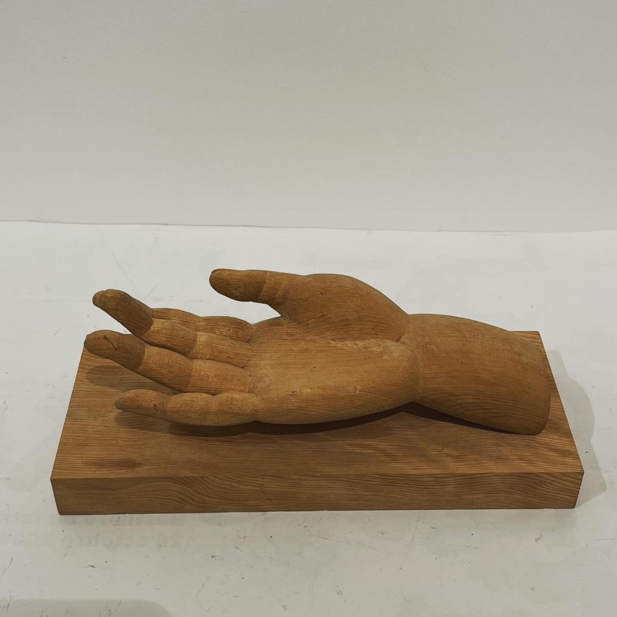 Okimono sculpture en bois d’une main de Bouddha sur son socle.