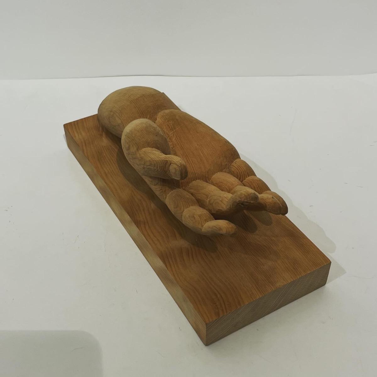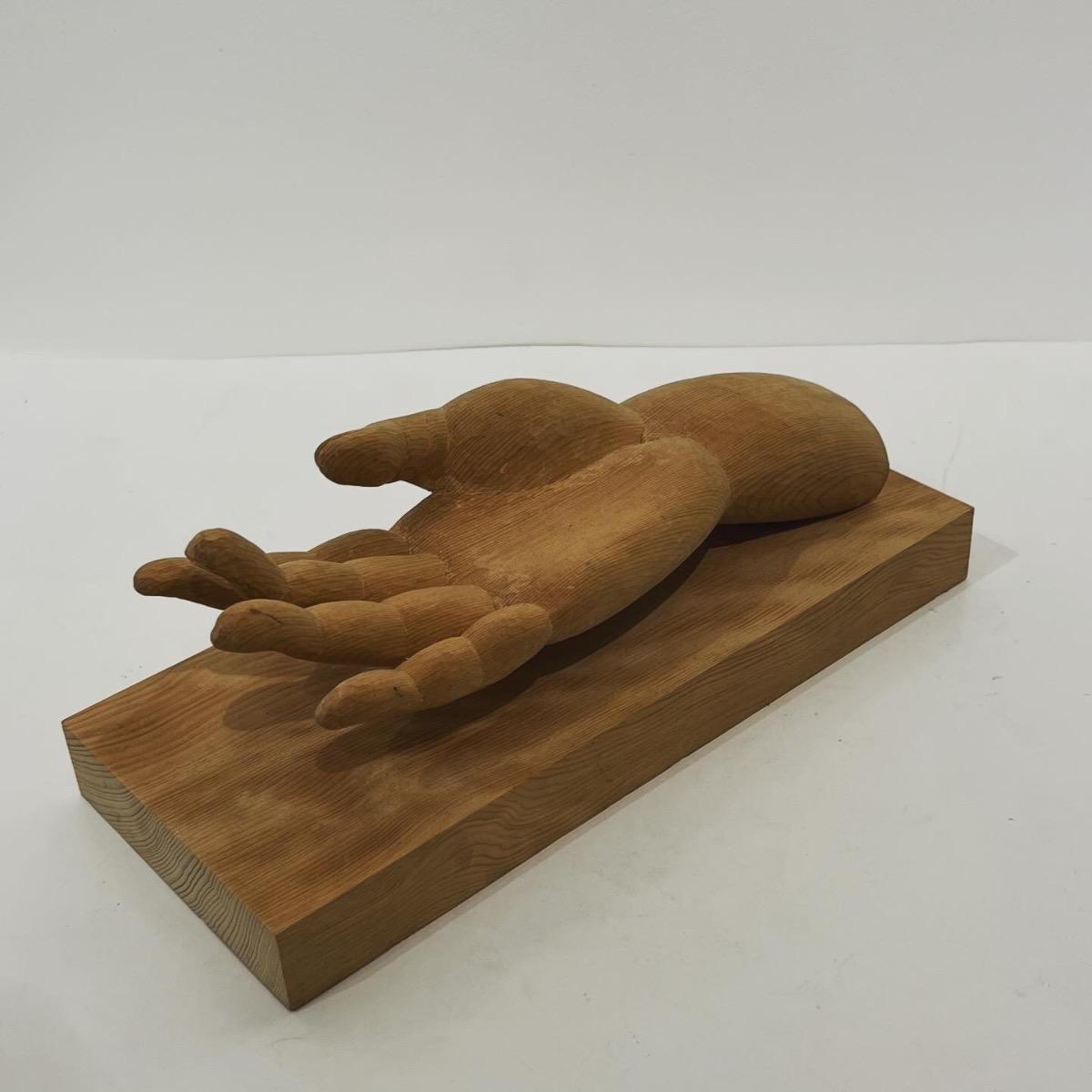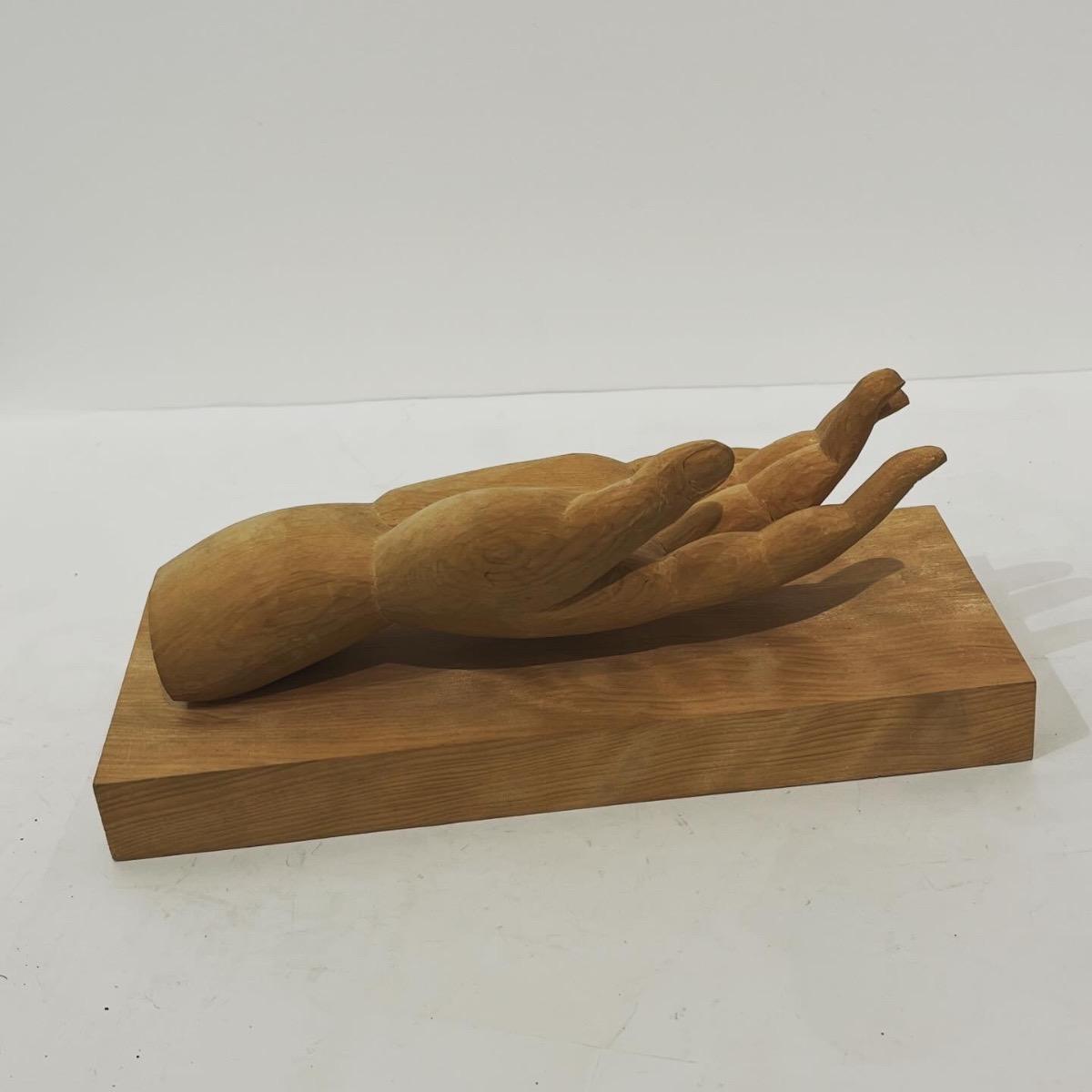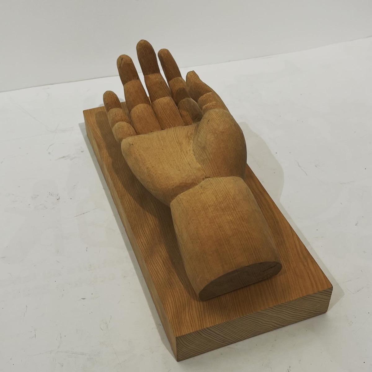 Okimono sculpture en bois d’une main de Bouddha sur son socle.