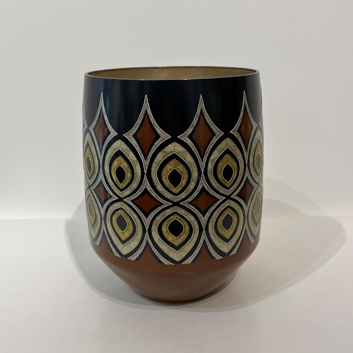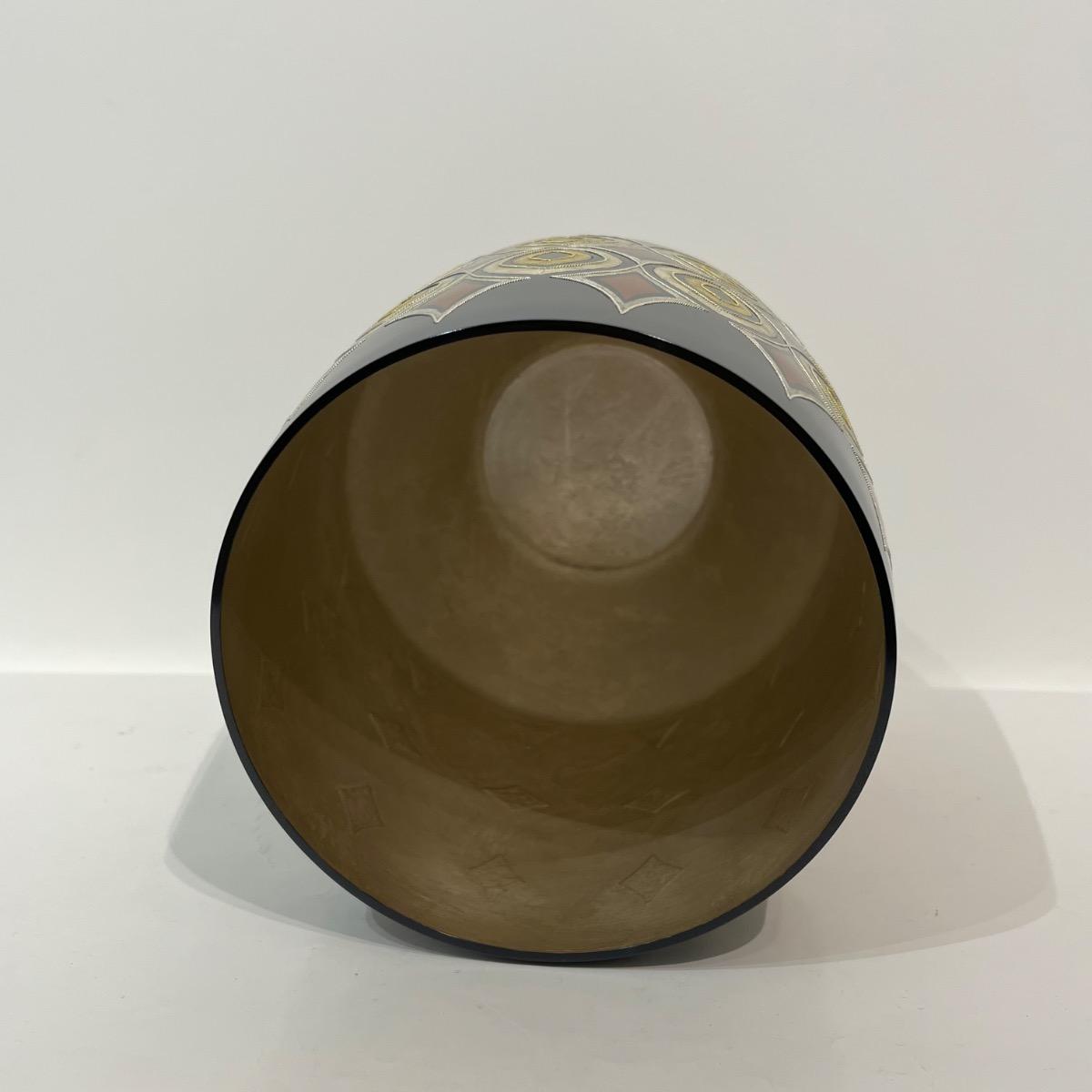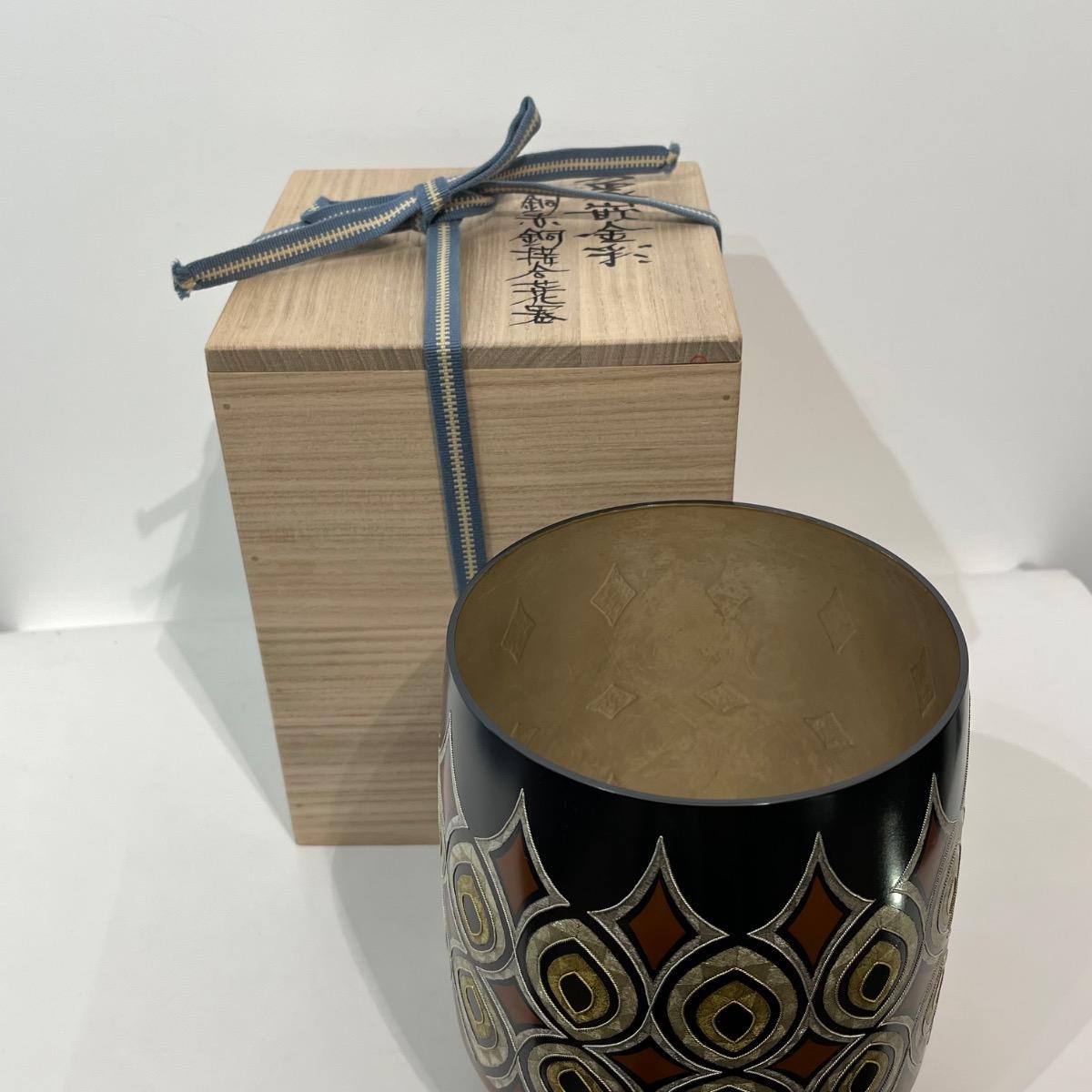 Mizusashi, récipient pour l'eau de la cérémonie du thé avec incrustations d'or et d'argent par Kashima Kazuo (né en 1958). Un motif géométrique saisissant d'or martelé est incrusté dans la surface métallique de ce pot d'eau douce doublé d'argent pour être utilisé lors de la cérémonie du thé. Japon, circa 1990, 20 x 15,6 cm. Avec sa boîte d'origine signée par l'artiste. La technique dite nunome zogan, imite la texture et les motifs de textiles grace aux incrustations de métal où de fines rainures verticales et horizontales sont gravées dans un métal. De fines feuilles d'or, d'argent ou de plomb sont ensuite incrustées dans ces rainures. Les rainures entrecroisées ressemblent au tissage du tissu, qui serait à l'origine du nom "Nunome Zogan" (incrustation à motif textile). Le maître Kashima de première génération a développé une variante japonaise unique de la technique Nunome Zogan. Cette version, appelée Kashima Nunome, a été spécialement adaptée aux métaux colorés traditionnels du Japon comme le shakudo (alliage cuivre-or à patiné noir) et shibuichi (alliage argent-cuivre). À Tokyo, la famille Kashima était considérée comme la principale autorité sur Nunome Zogan. Kashima Kazuo est le chef de la 5e génération de la famille Kashima. Né en 1958 en tant que deuxième fils du peintre de style japonais Hiroyuki Hiraide, il a étudié directement sous la direction de son grand-père, Living National Treasure Kashima Ikkoku, le chef de la famille de 4e génération, et Kazuo perpétue la tradition Kashima. Ces dernières années, il a organisé des expositions et des ateliers à l'étranger (y compris aux États-Unis et en Chine). Il a été une figure centrale de l'exposition 2020 du musée d'art Takaoka sur l'art du métal contemporain, qui s'est tenue au Musée national d'art moderne (Kokuritsu Kogei Kan) et est reconnu comme l'un des principaux artistes japonais du métal.
