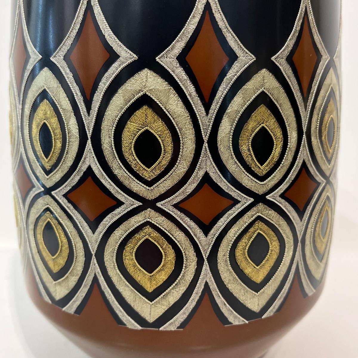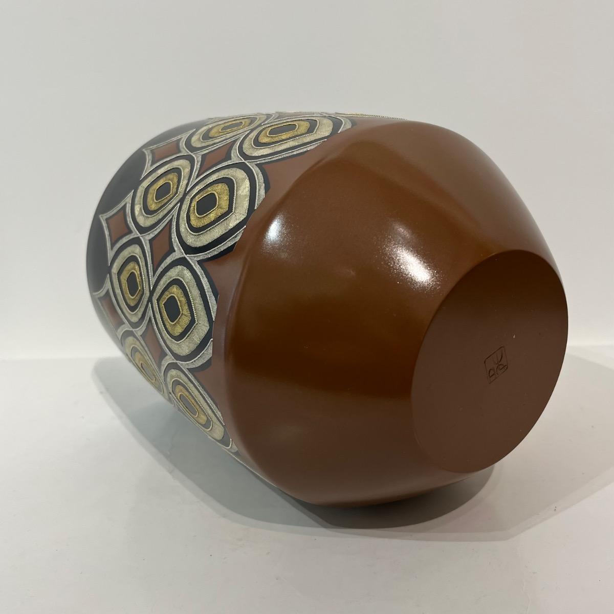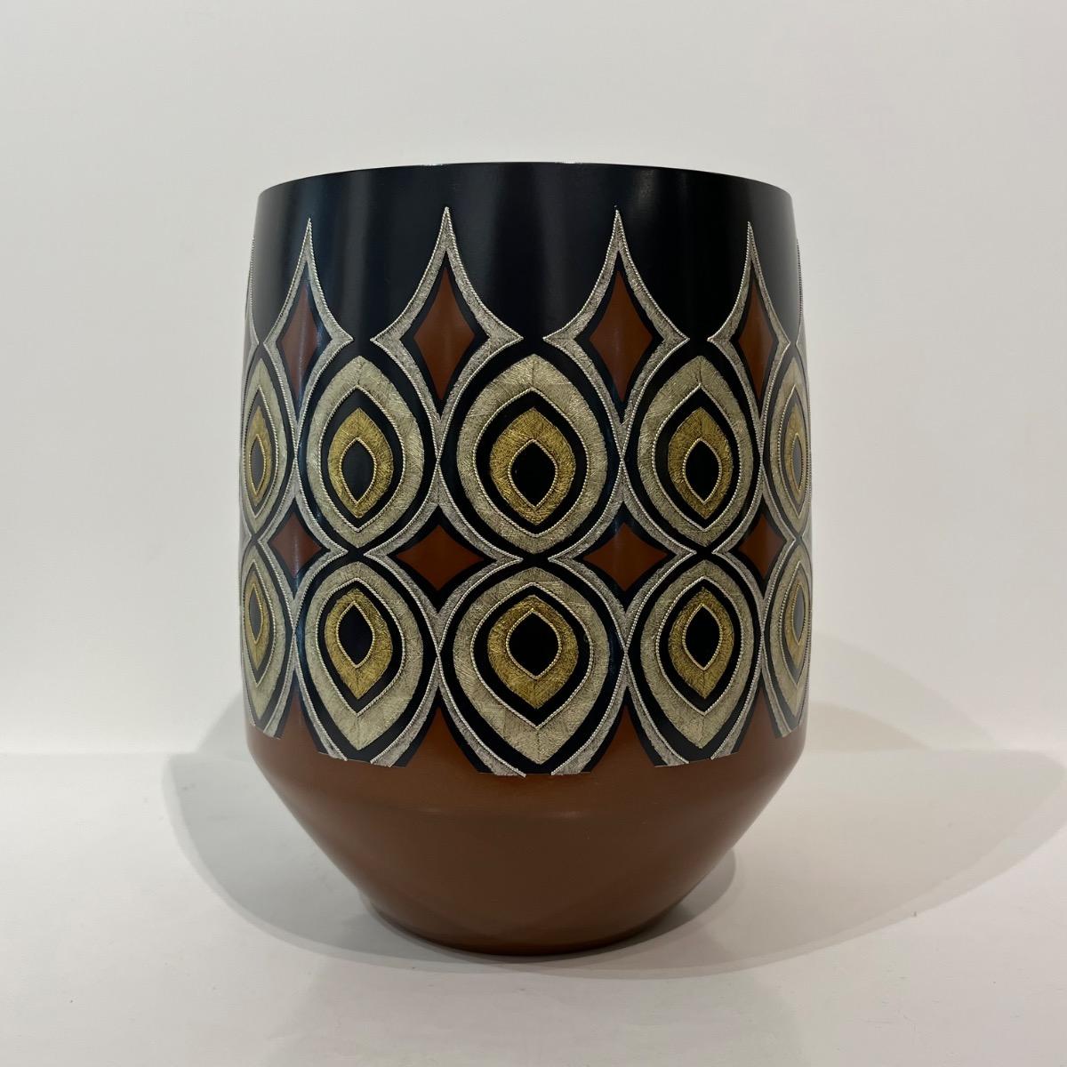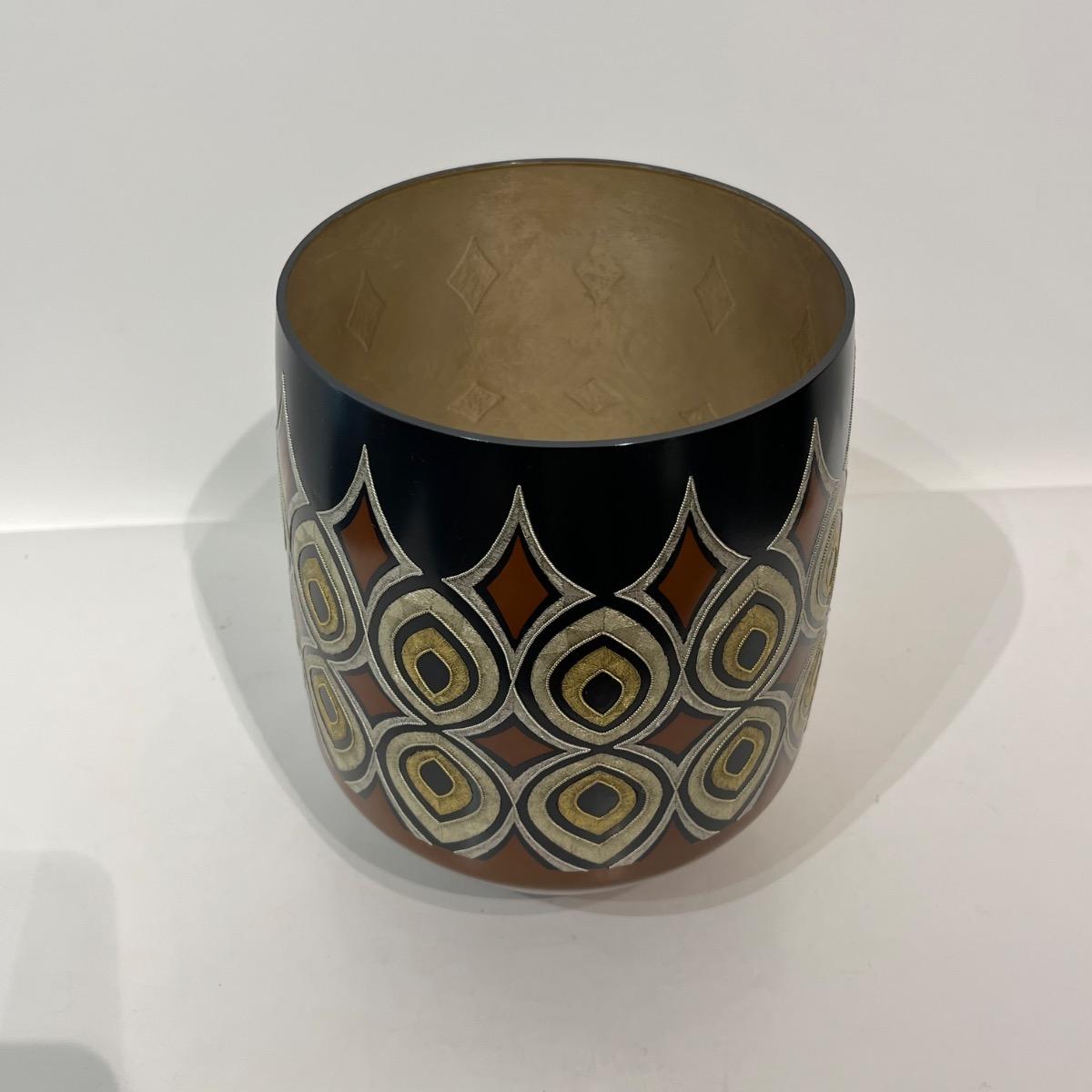 Mizusashi, récipient pour l'eau de la cérémonie du thé avec incrustations d'or et d'argent par Kashima Kazuo (né en 1958). Un motif géométrique saisissant d'or martelé est incrusté dans la surface métallique de ce pot d'eau douce doublé d'argent pour être utilisé lors de la cérémonie du thé. Japon, circa 1990, 20 x 15,6 cm. Avec sa boîte d'origine signée par l'artiste. La technique dite nunome zogan, imite la texture et les motifs de textiles grace aux incrustations de métal où de fines rainures verticales et horizontales sont gravées dans un métal. De fines feuilles d'or, d'argent ou de plomb sont ensuite incrustées dans ces rainures. Les rainures entrecroisées ressemblent au tissage du tissu, qui serait à l'origine du nom "Nunome Zogan" (incrustation à motif textile). Le maître Kashima de première génération a développé une variante japonaise unique de la technique Nunome Zogan. Cette version, appelée Kashima Nunome, a été spécialement adaptée aux métaux colorés traditionnels du Japon comme le shakudo (alliage cuivre-or à patiné noir) et shibuichi (alliage argent-cuivre). À Tokyo, la famille Kashima était considérée comme la principale autorité sur Nunome Zogan. Kashima Kazuo est le chef de la 5e génération de la famille Kashima. Né en 1958 en tant que deuxième fils du peintre de style japonais Hiroyuki Hiraide, il a étudié directement sous la direction de son grand-père, Living National Treasure Kashima Ikkoku, le chef de la famille de 4e génération, et Kazuo perpétue la tradition Kashima. Ces dernières années, il a organisé des expositions et des ateliers à l'étranger (y compris aux États-Unis et en Chine). Il a été une figure centrale de l'exposition 2020 du musée d'art Takaoka sur l'art du métal contemporain, qui s'est tenue au Musée national d'art moderne (Kokuritsu Kogei Kan) et est reconnu comme l'un des principaux artistes japonais du métal.