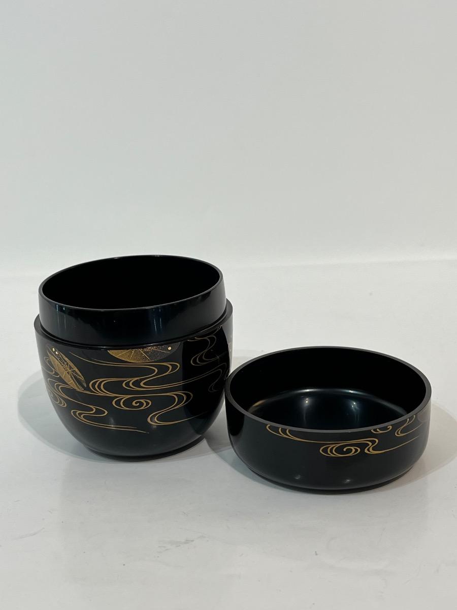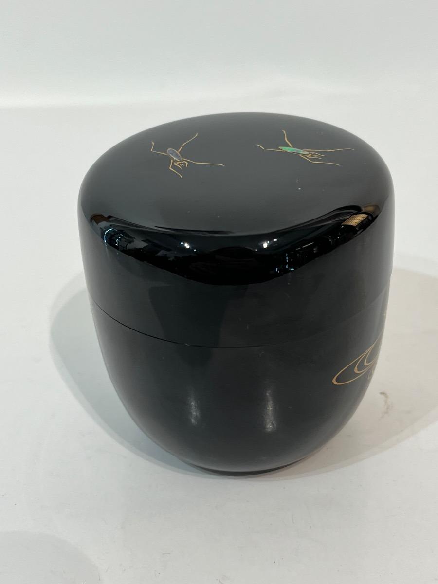 Boîte à thé, natsume, pour le thé macha de la cérémonie du thé. En bois laqué noir aux décors d´araignées d'eau avec incrustation de nacre (raden) et des nénuphars sur l'eau en laque makie or et argent. Pour la cérémonie du thé, le maître du thé choisit ses objets en fonction des saisons, invités, événements... Ce natsume se rapporte à l'été avec les araignées d'eau et les nénuphars. Pièce sur le thème classique au Japon du kachô (un animal et un végétal). Artiste : Kitahama Souki Japon, 6,5 x 7 cm. Avec sa boîte d’origine signée par l’artiste.