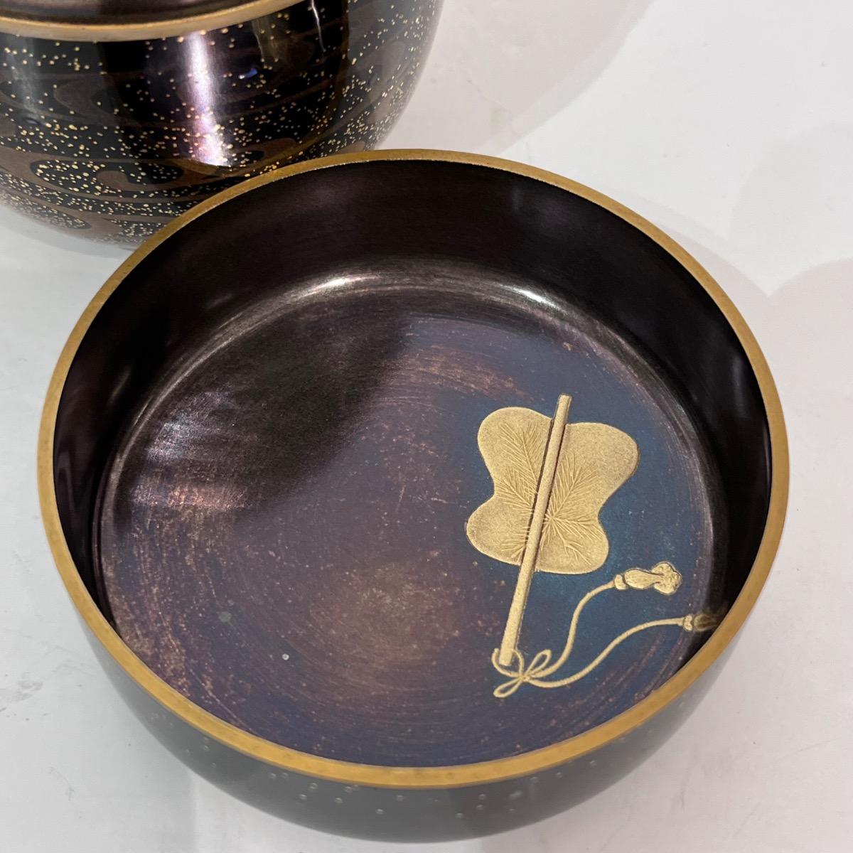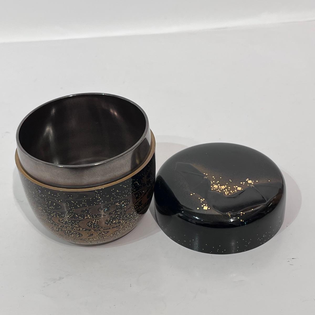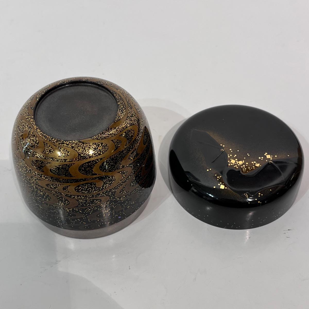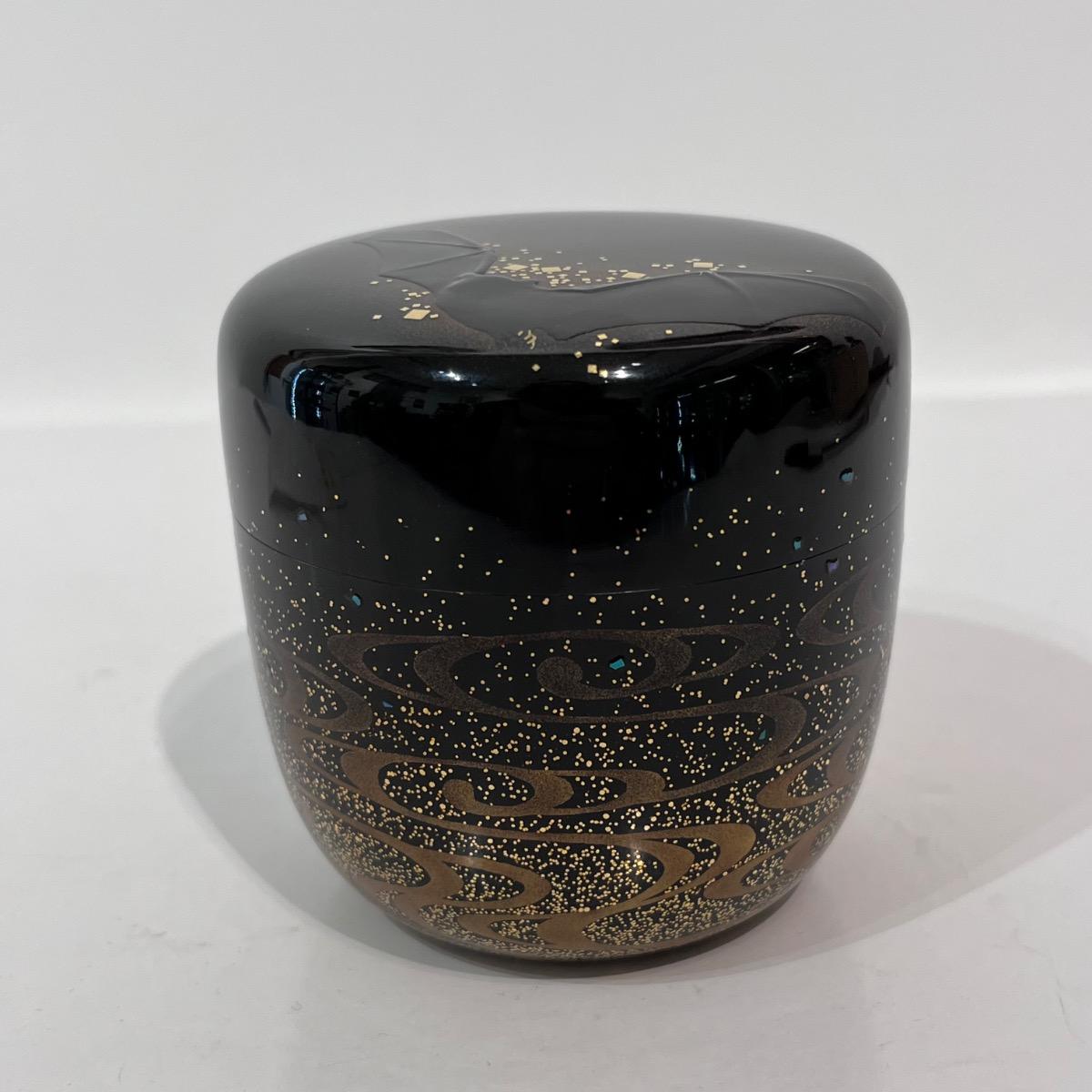 En bois laqué d'un noir profond avec, sur le couvercle, un décor de chauve-souris créé par le contour en kirigane (petits carrés de feuille d'or) et l'épaisseur de la laque.