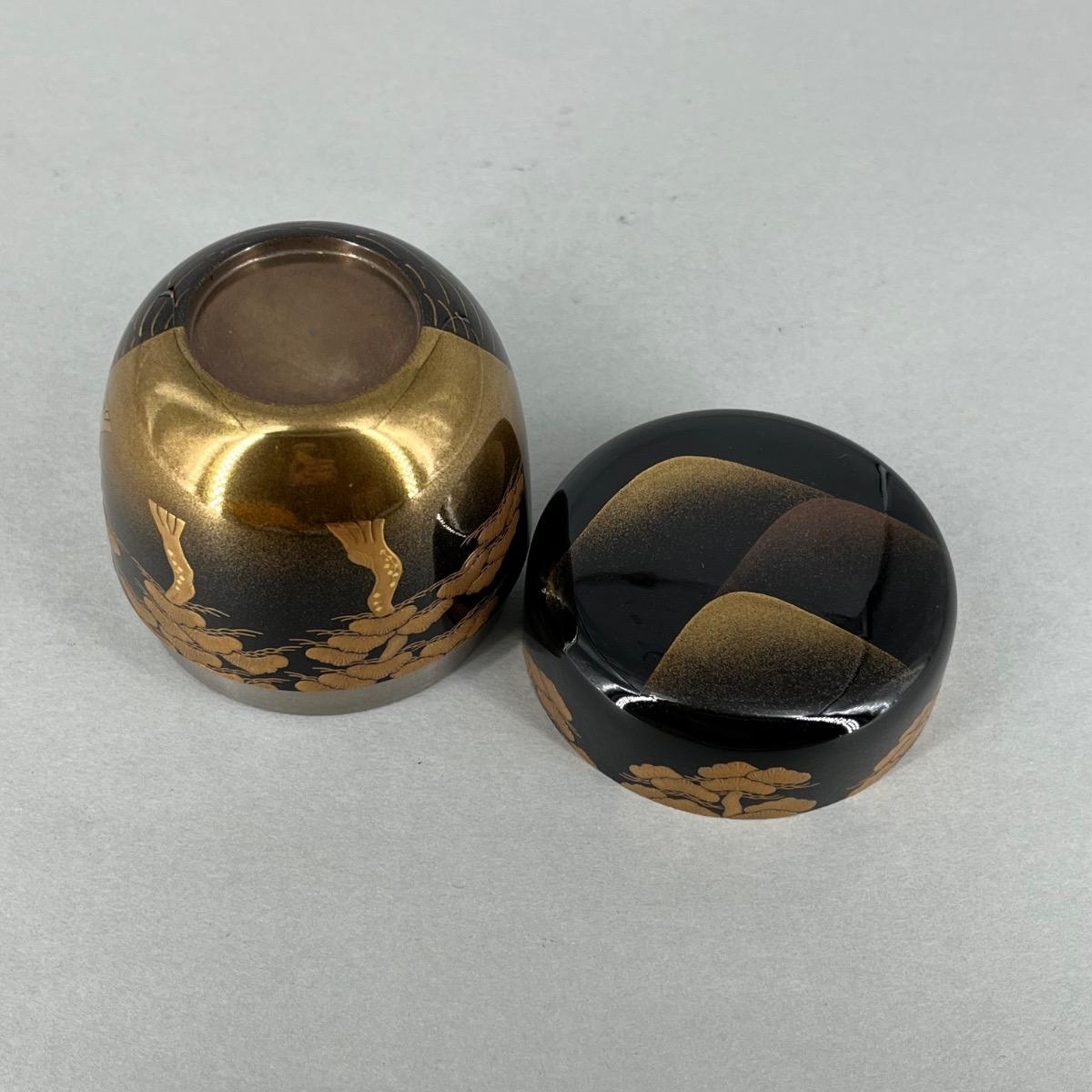 En bois laqué noir aux décors de pins côtiers, flots et montagnes sur le couvercle en laque makie or. L'intérieur et le dessous sont en laque gindame argent.