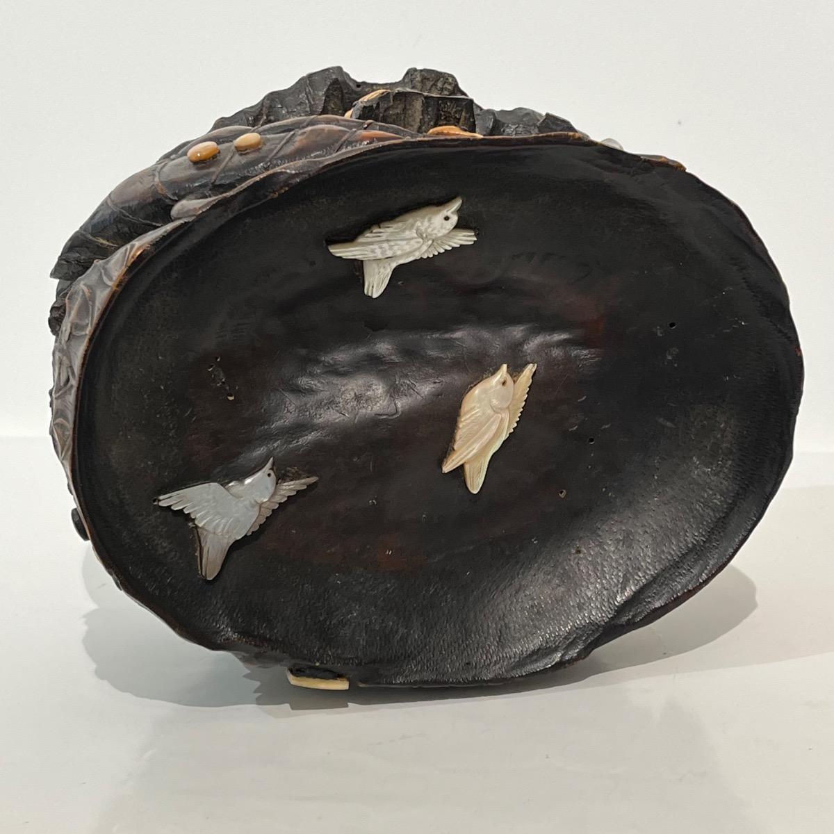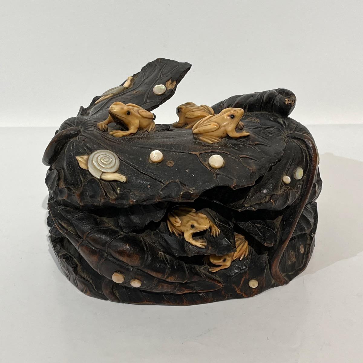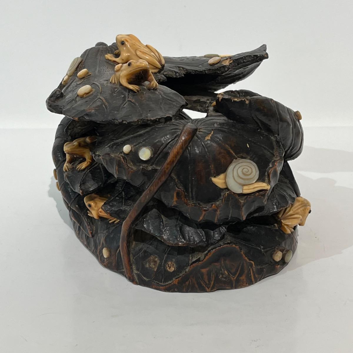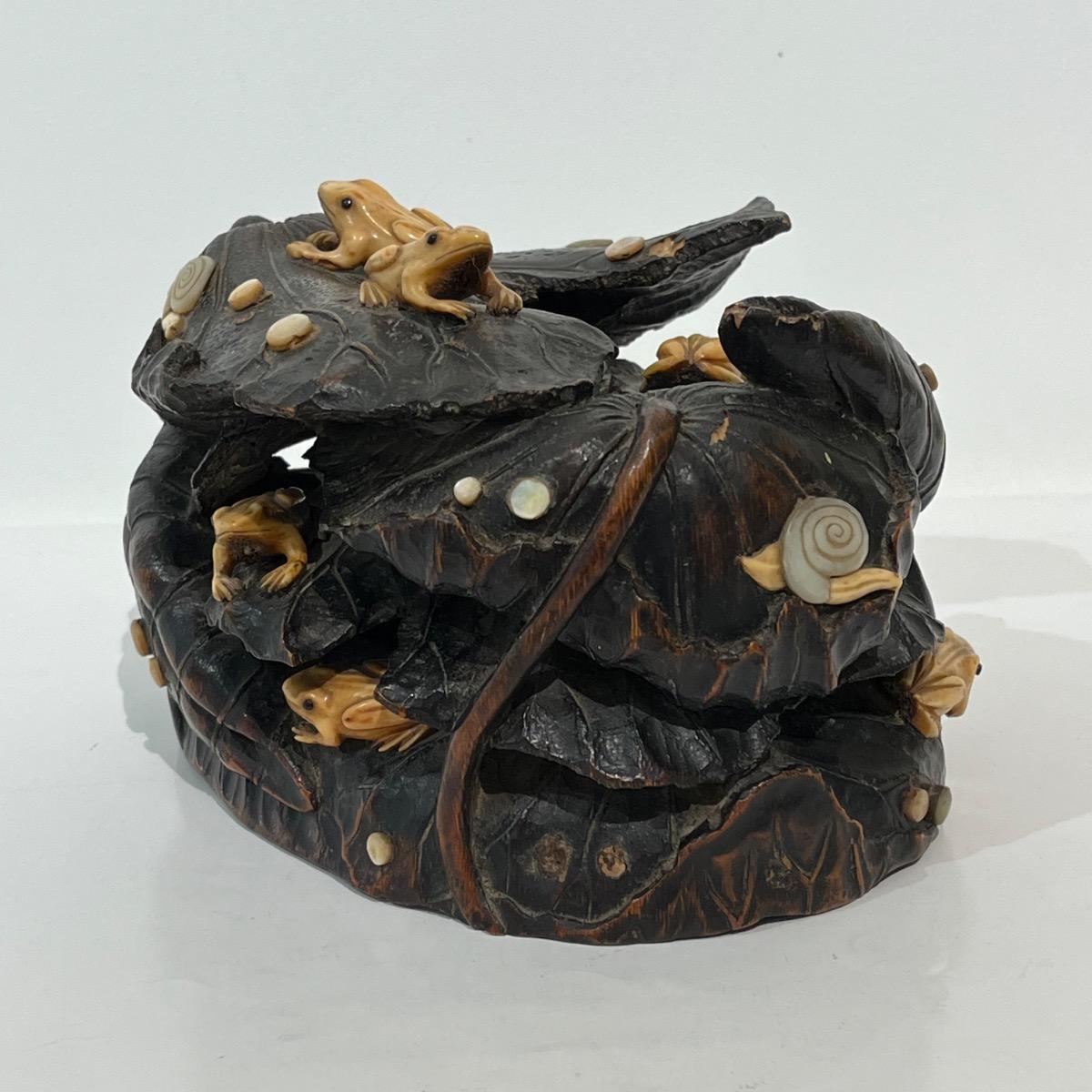 Okimono feuilles de lotus sculptées dans une seule pièce de bois, avec des grenouilles et escargots en bois de cerf et nacre. Dessous avec trois moineaux en nacre.