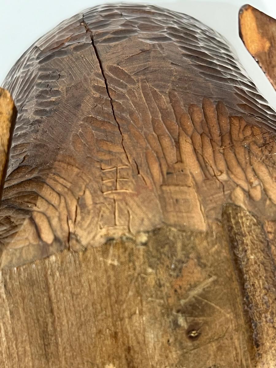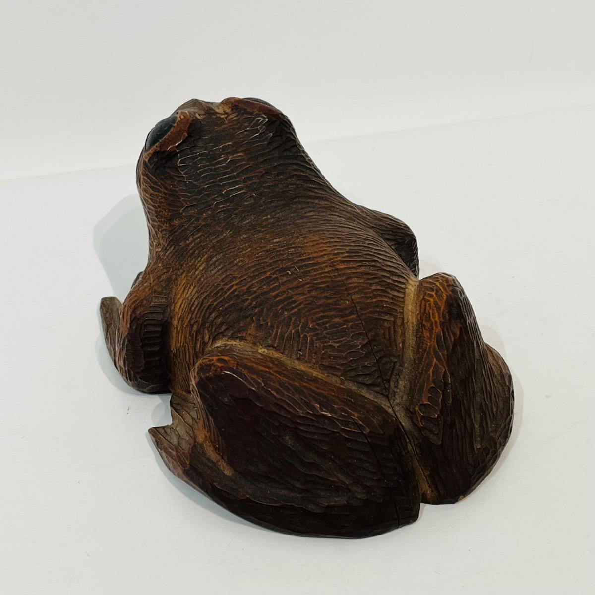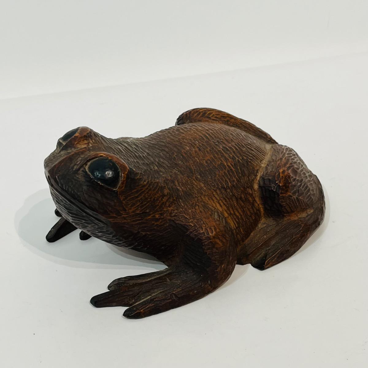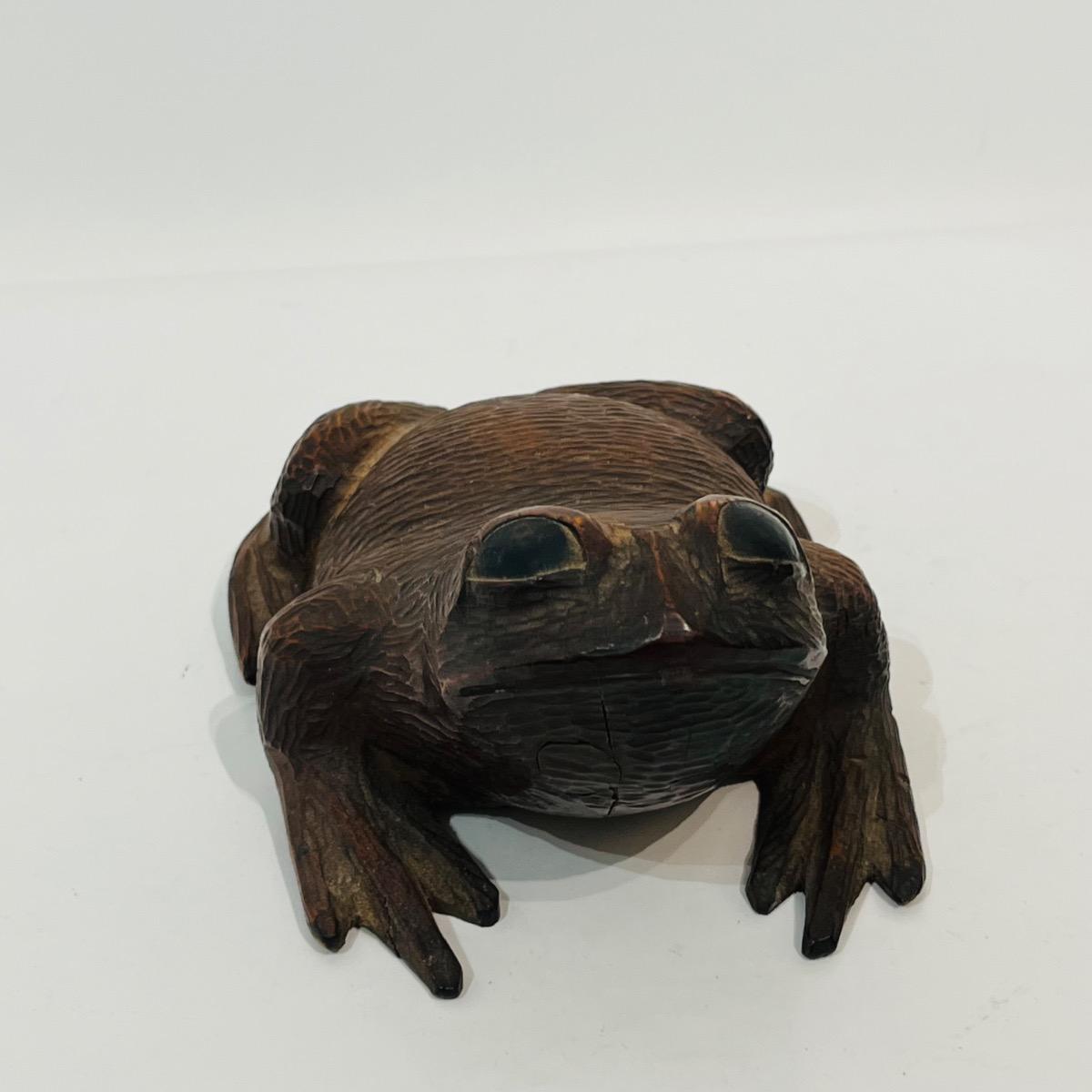 Okimono sculpture en bois gougé de grenouille. Écritures à l'encre sous la pièce ainsi qu'une signature gravée Oozan (王山). Objet porte-bonheur au Japon. Le mot grenouille (kaeru) est un homonyme de rentrer chez soi. Japon, ère Meiji (XIXème), 16 x 10,5 x 7 cm.