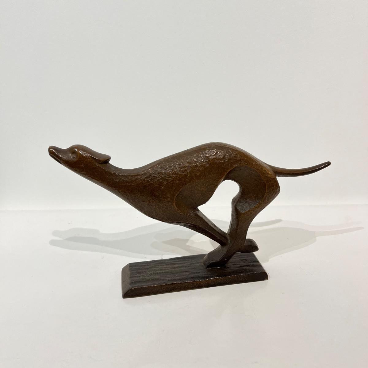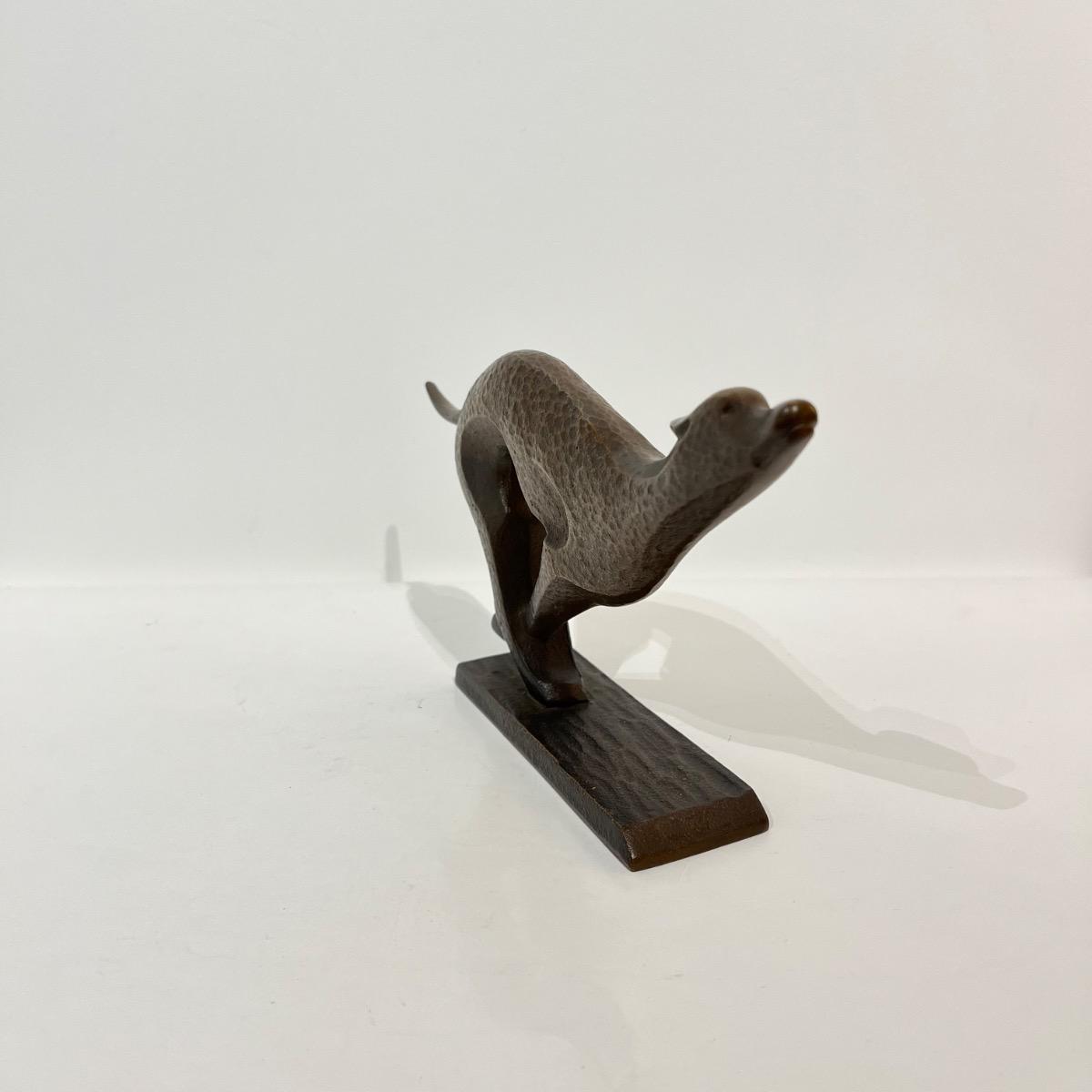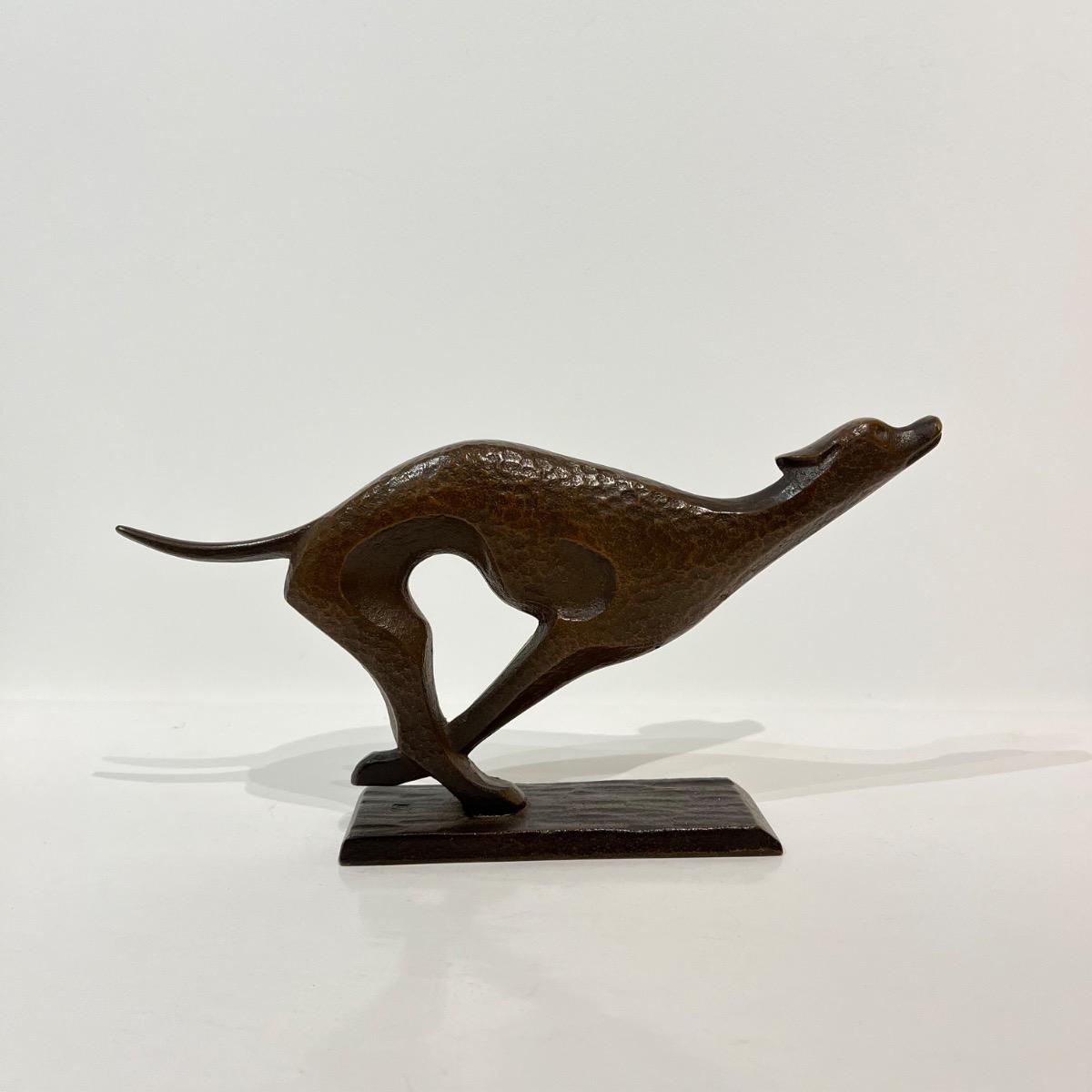 Okimono en bronze représentant un chien, a priori un lévrier, courant.