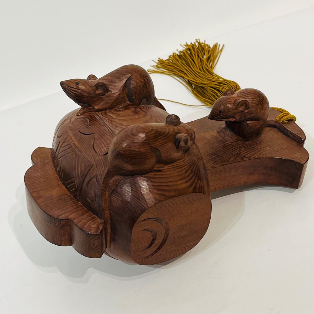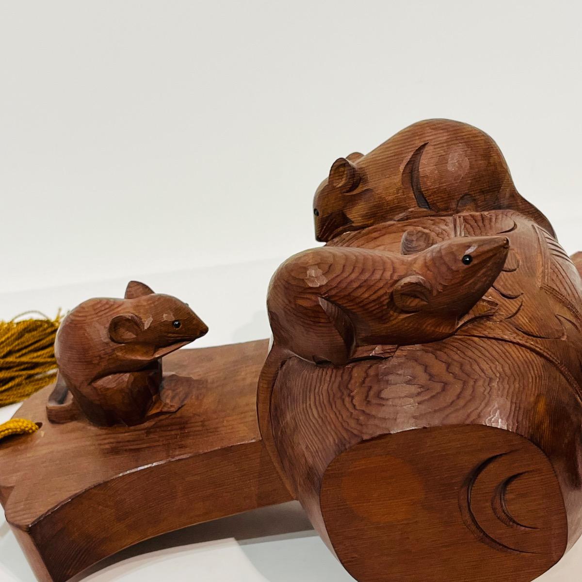 Okimono, sculpture en bois représentant trois souris sur le maillet de Daikokuten, dieu du commerce et des paysans.