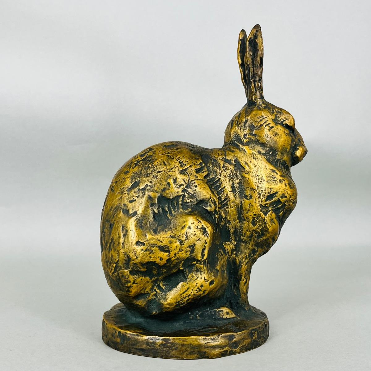 Okimono sculpture en cuivre de lapin aux oreilles dressées l'air serein.