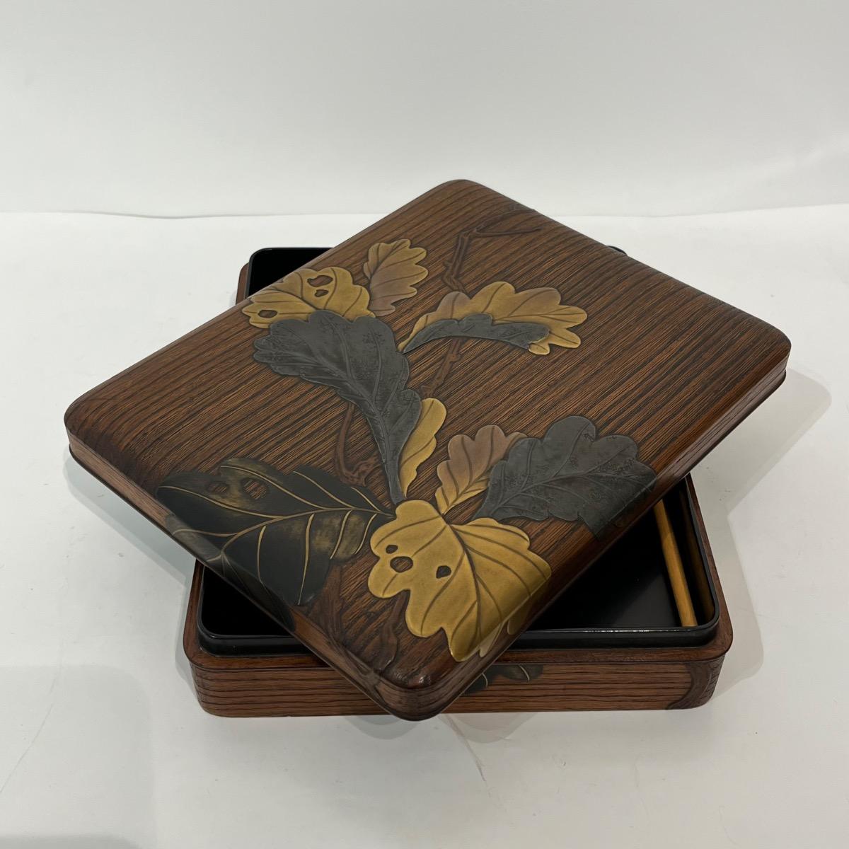 Décor splendide de feuilles de chêne automnales en laque makie or et argent.