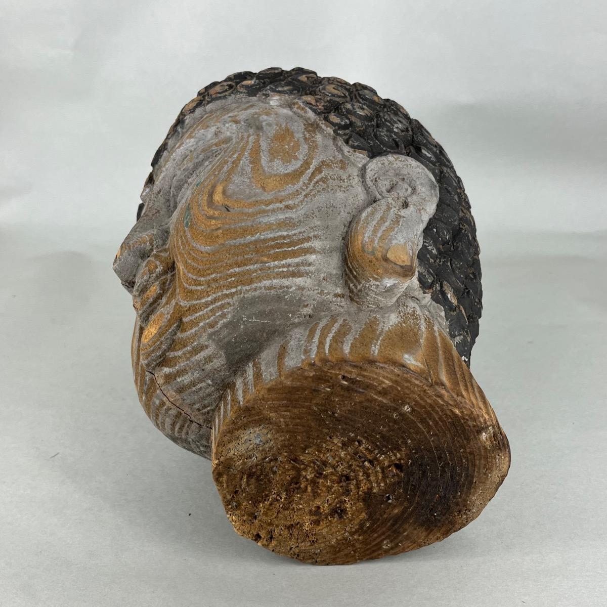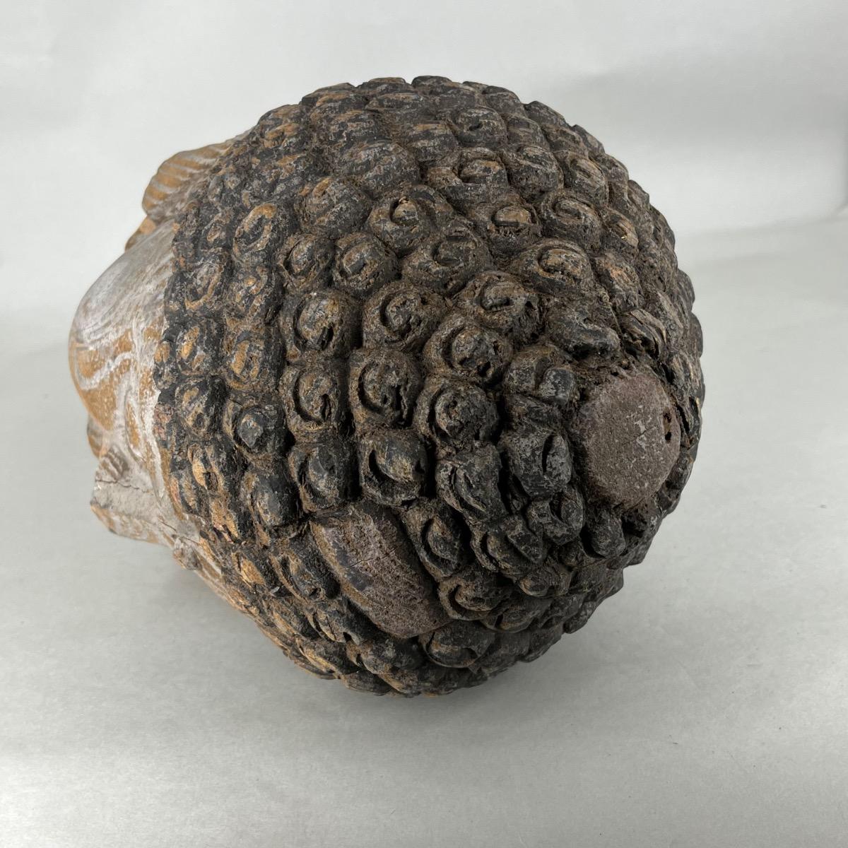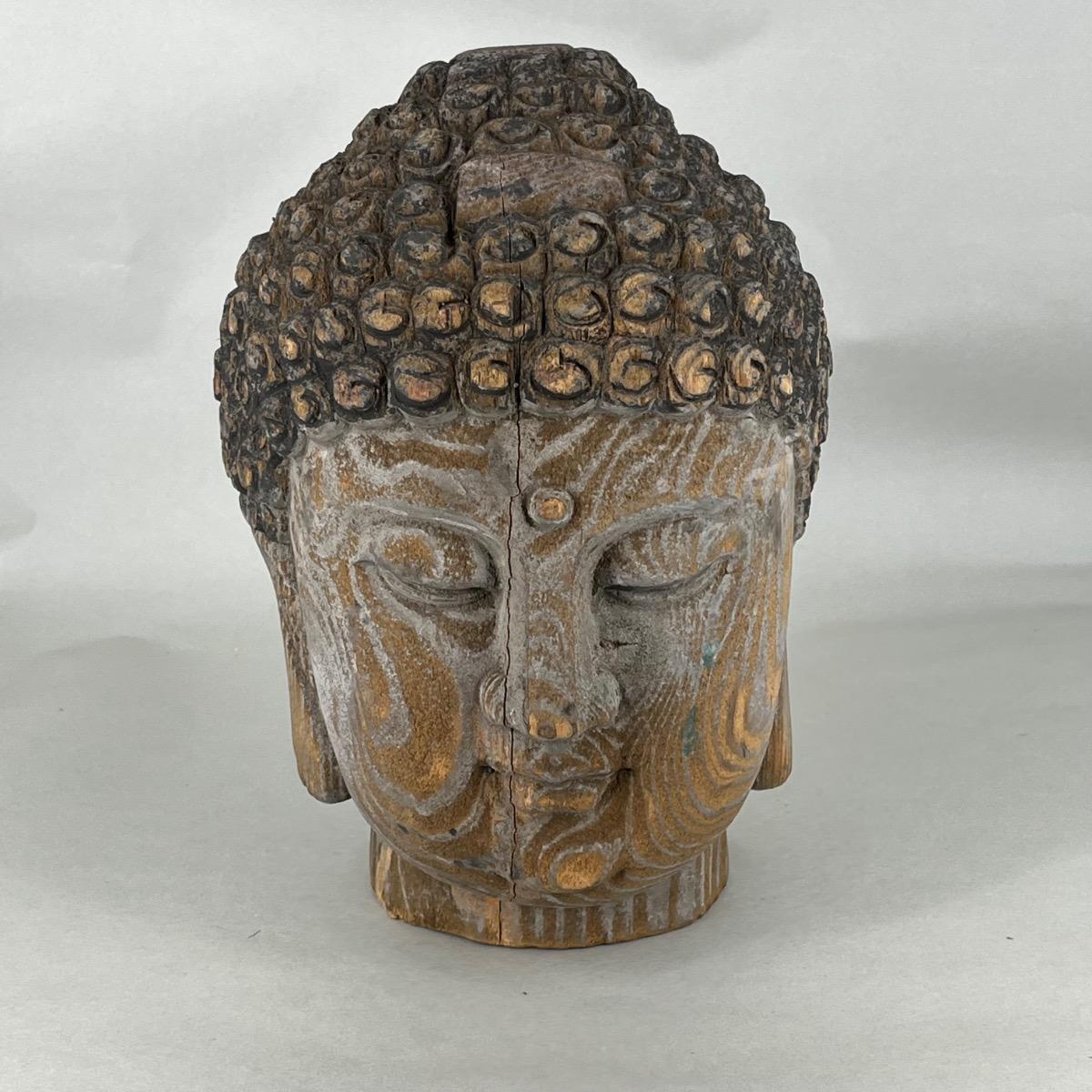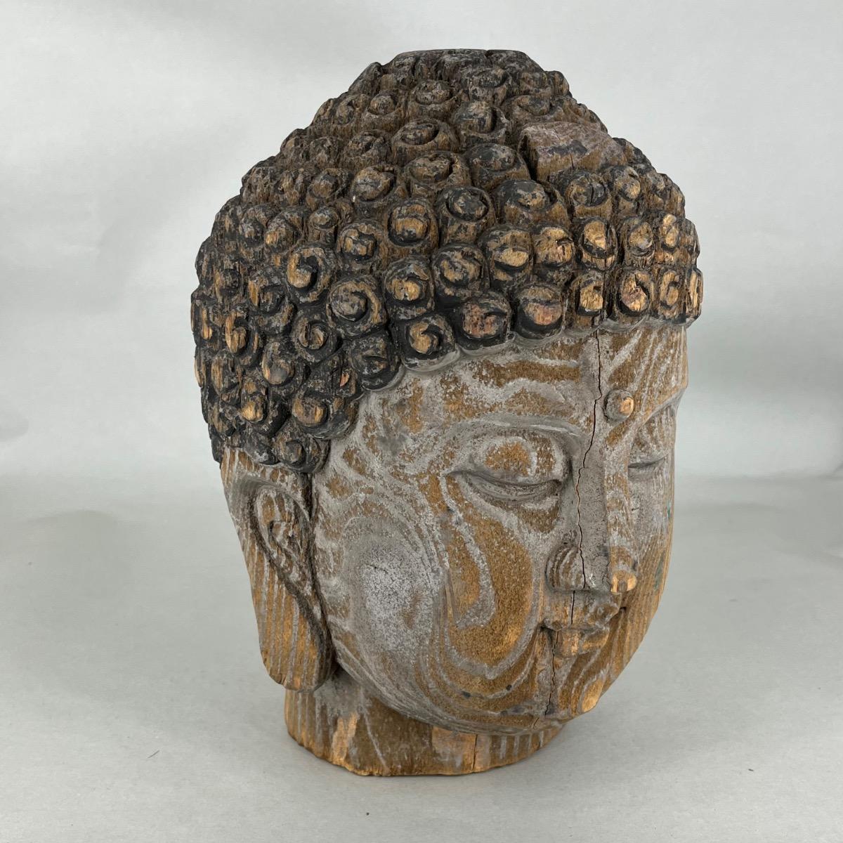 Grande tête de Bouddha Amida en bois sculpté avec des traces anciennes d'enduit et de peinture.