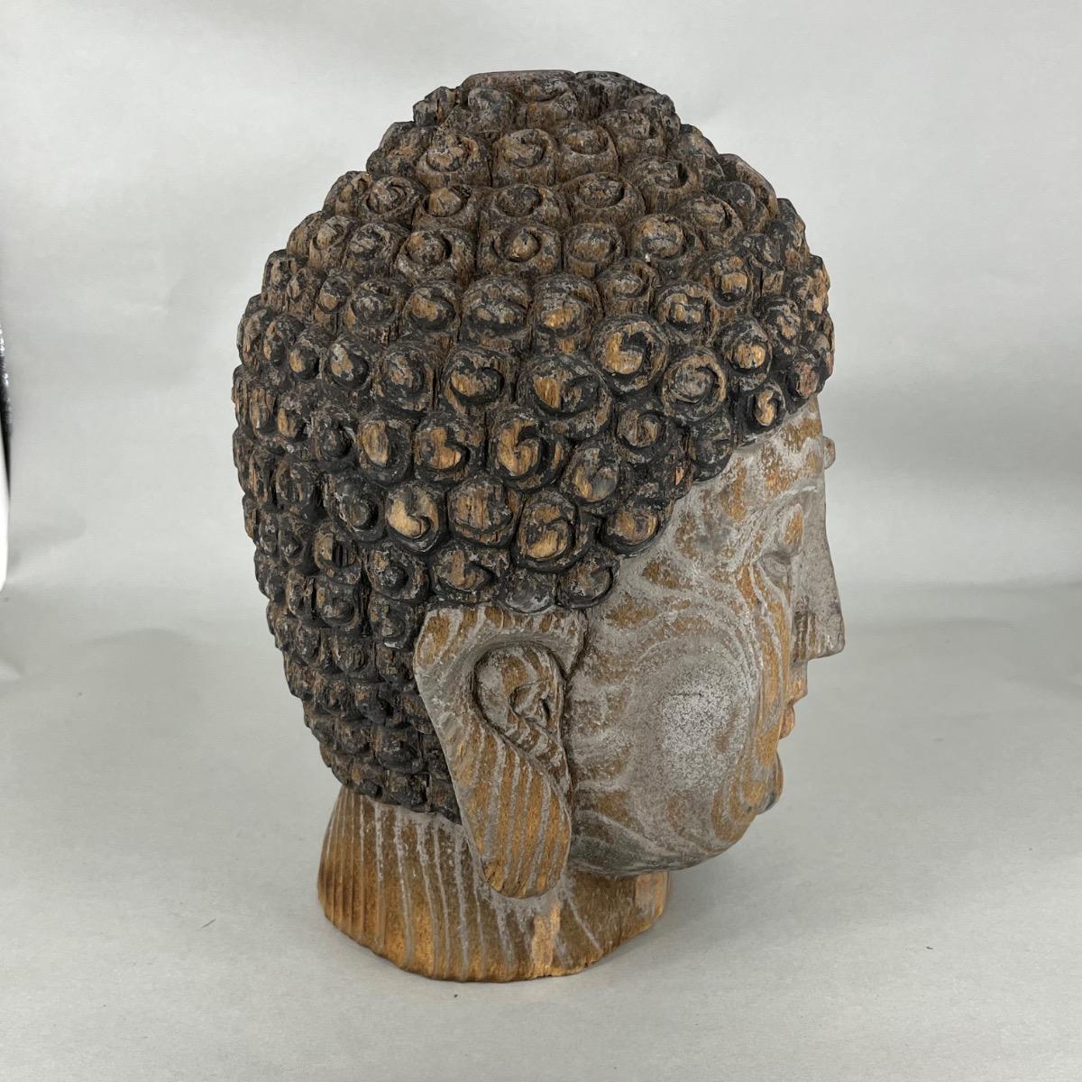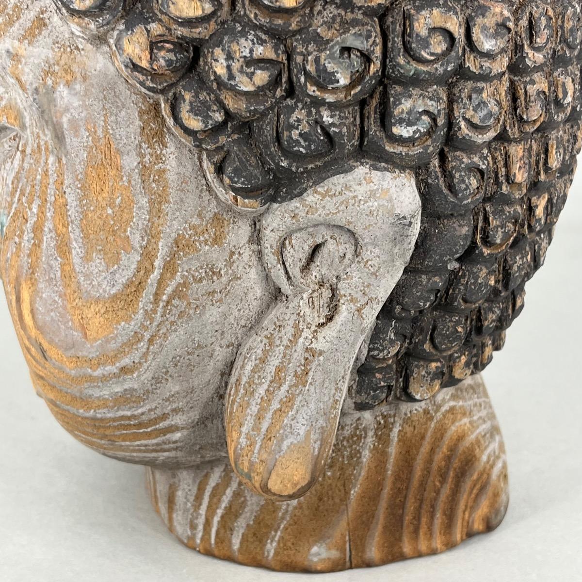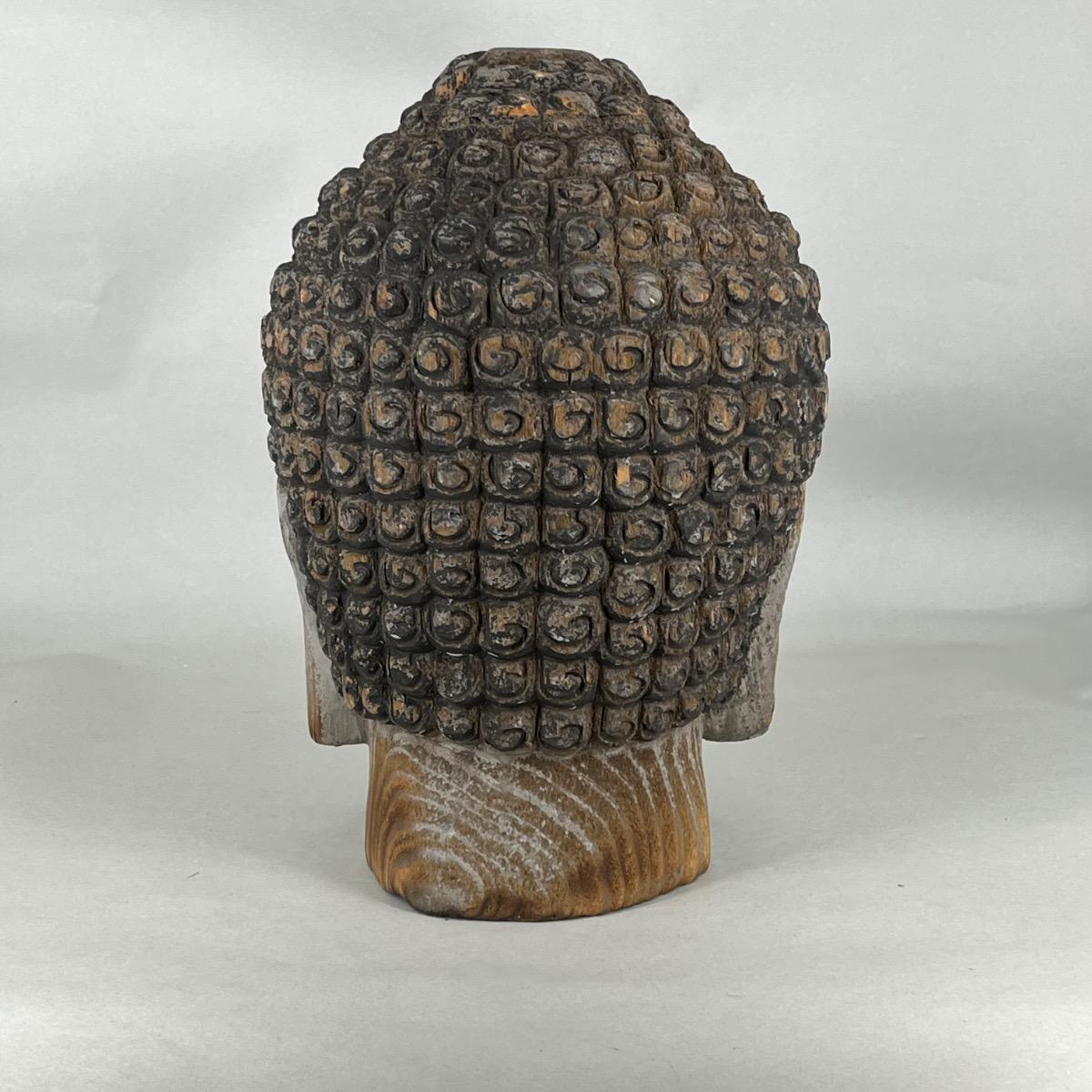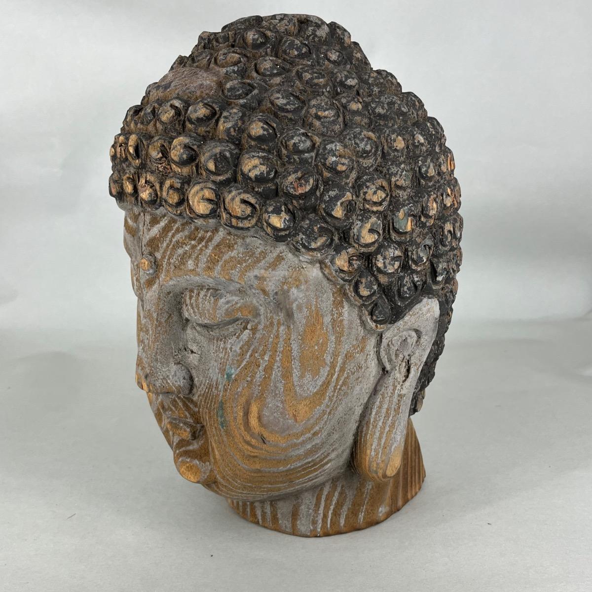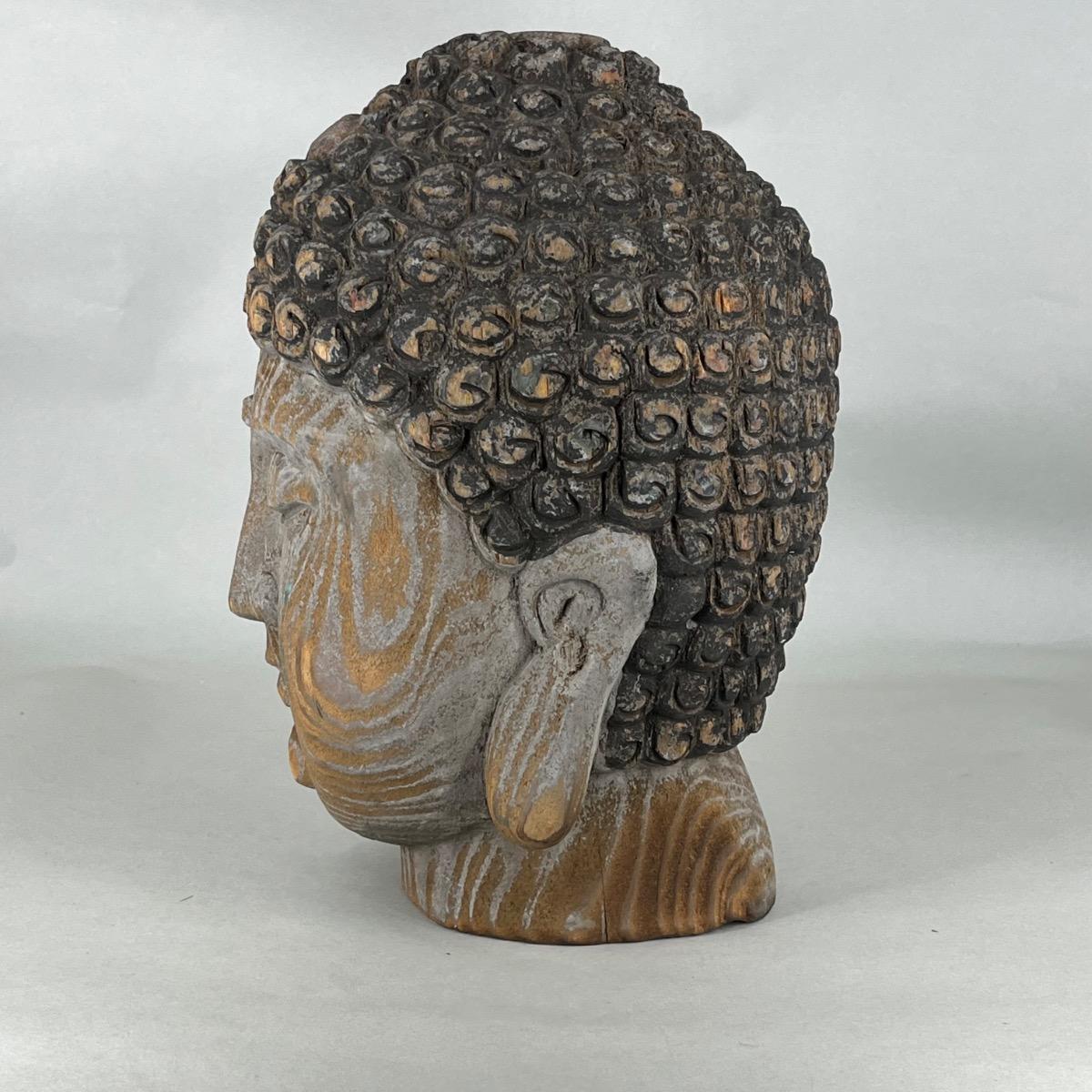 Grande tête de Bouddha Amida en bois sculpté avec des traces anciennes d'enduit et de peinture.