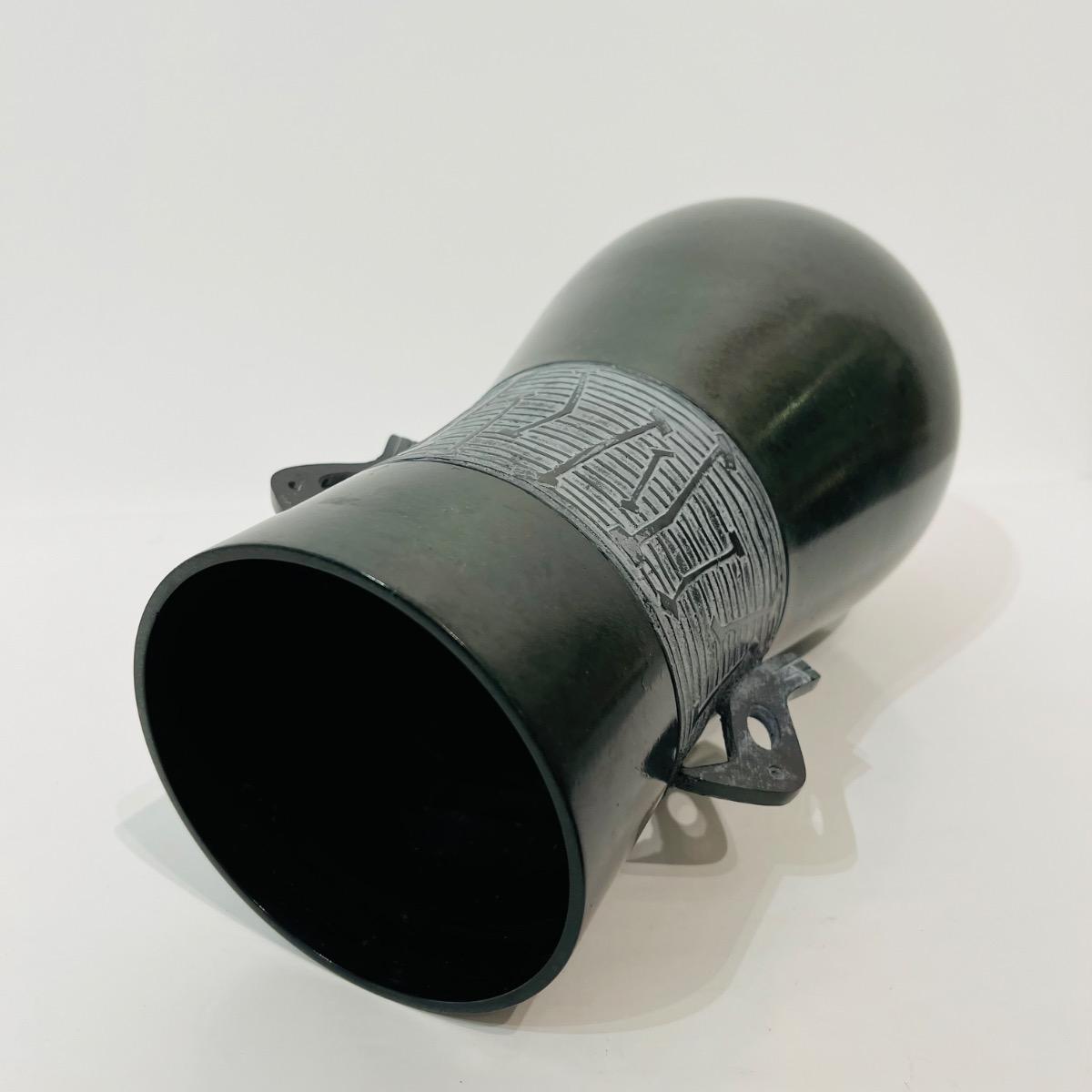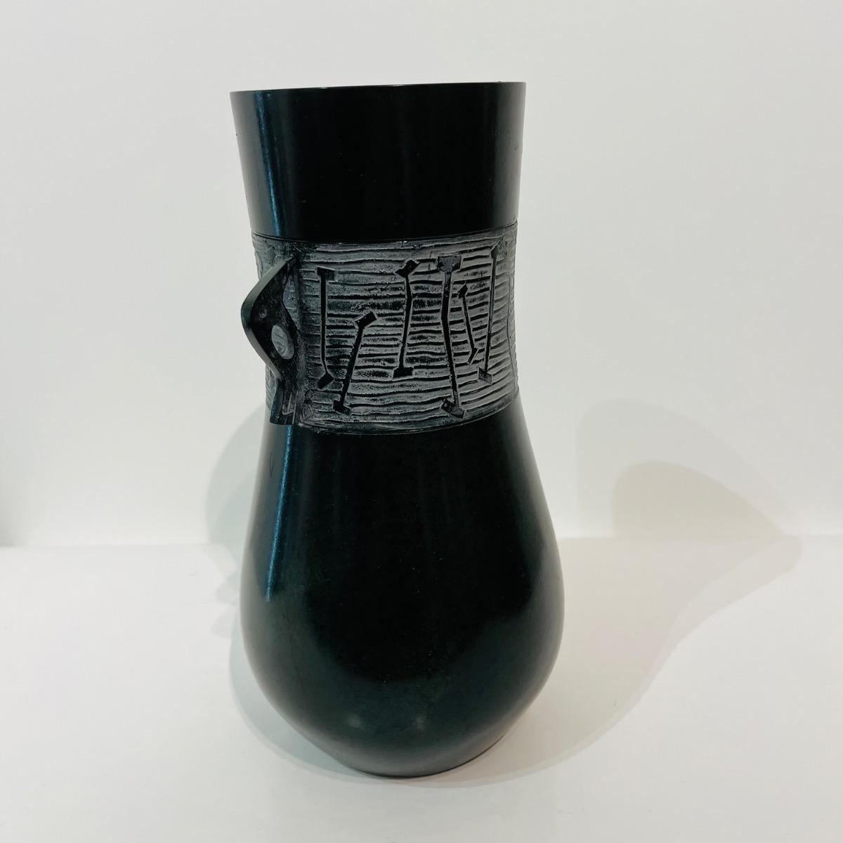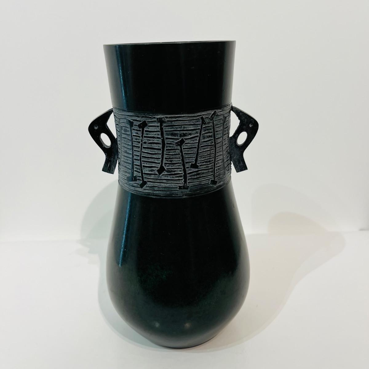 Grand vase en bronze à patine verte aux décors abstraits cisélés et anses en forme d'oiseaux stylisés. Japon, années 1970, 27 x 14,8 cm.