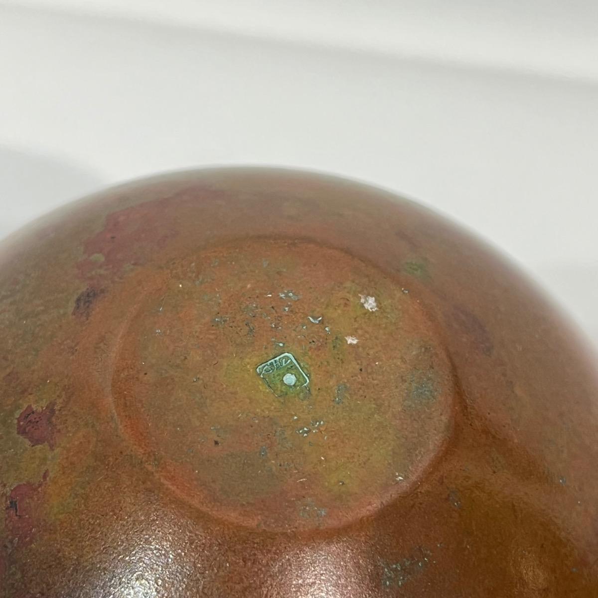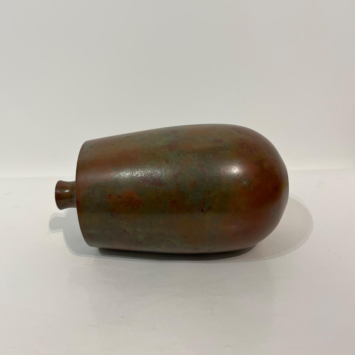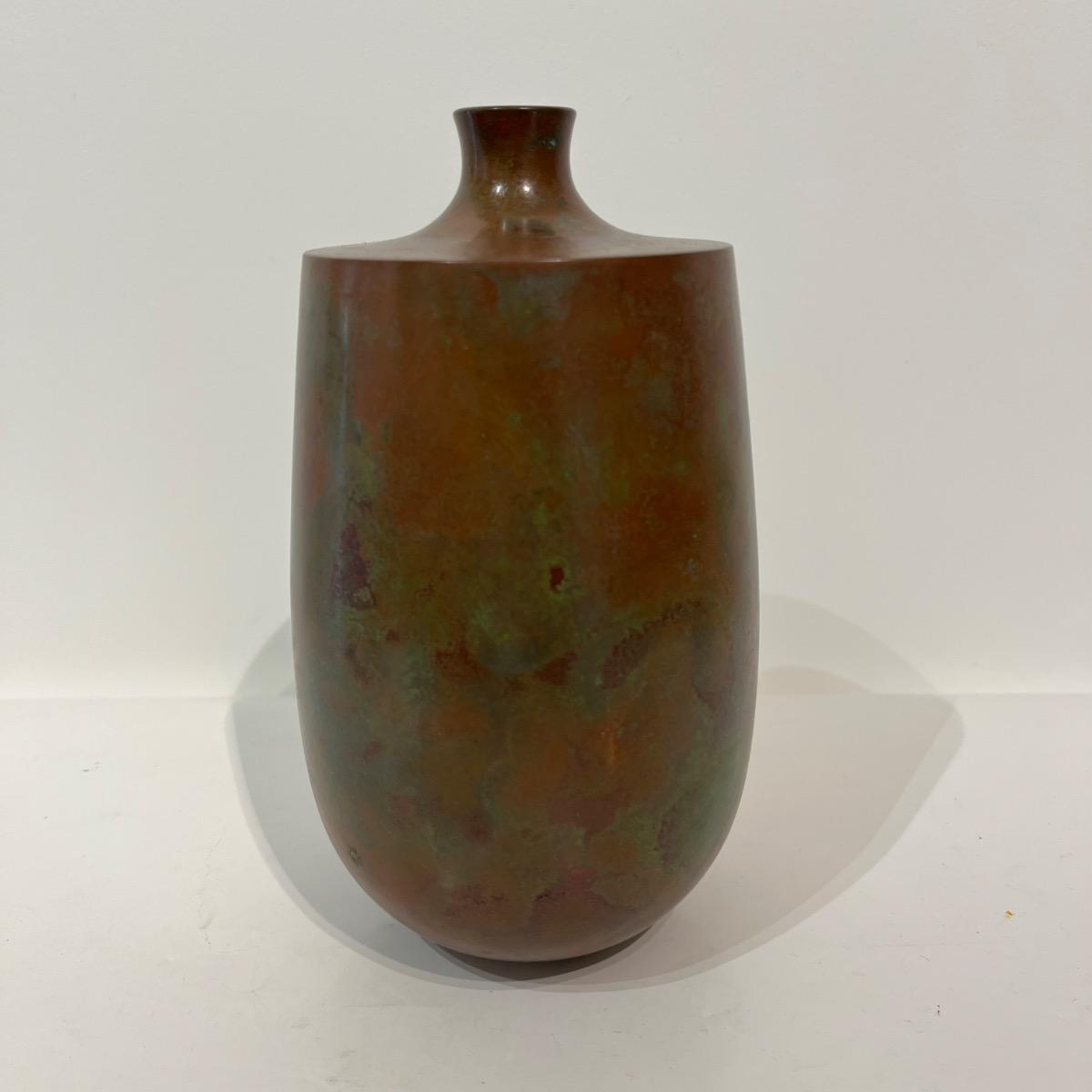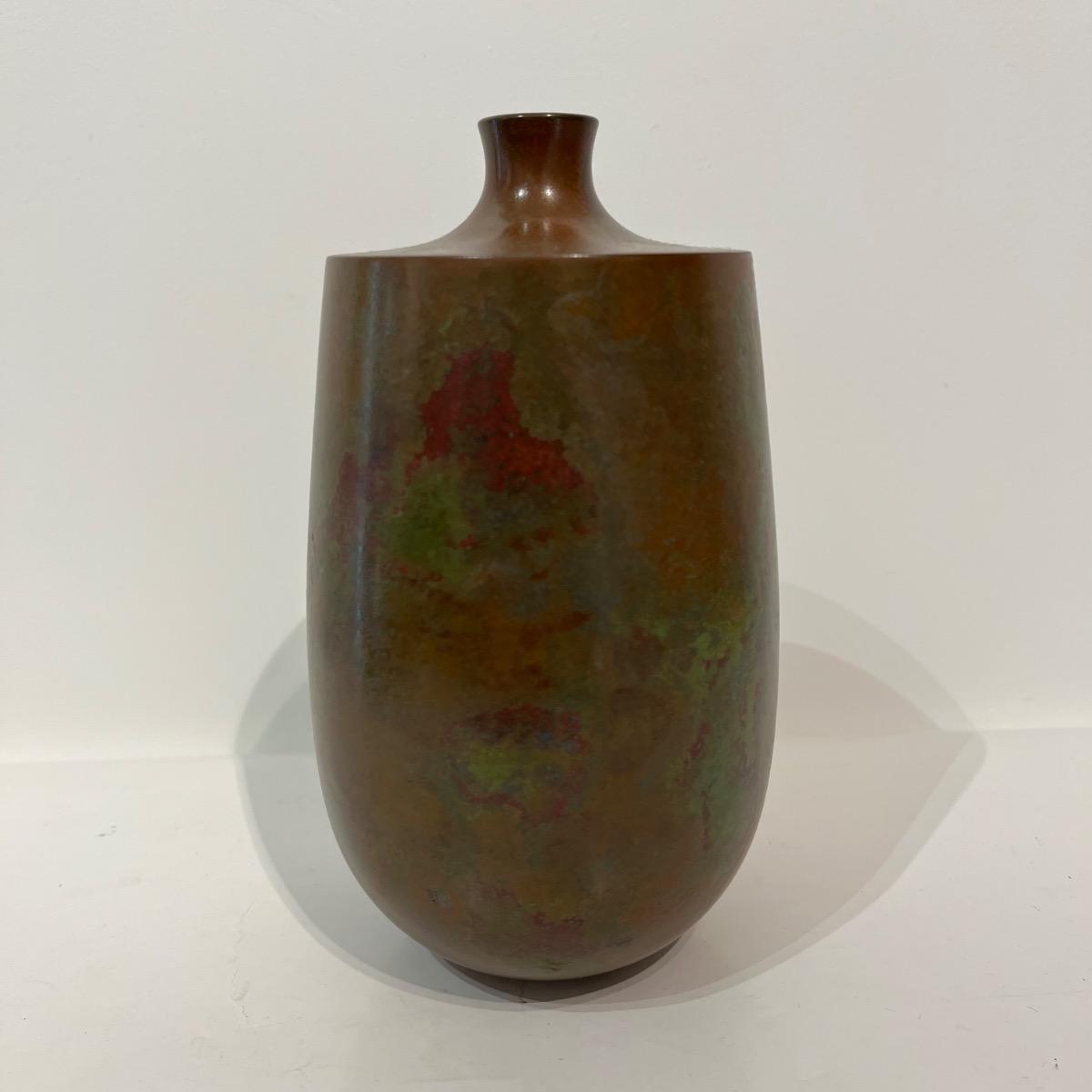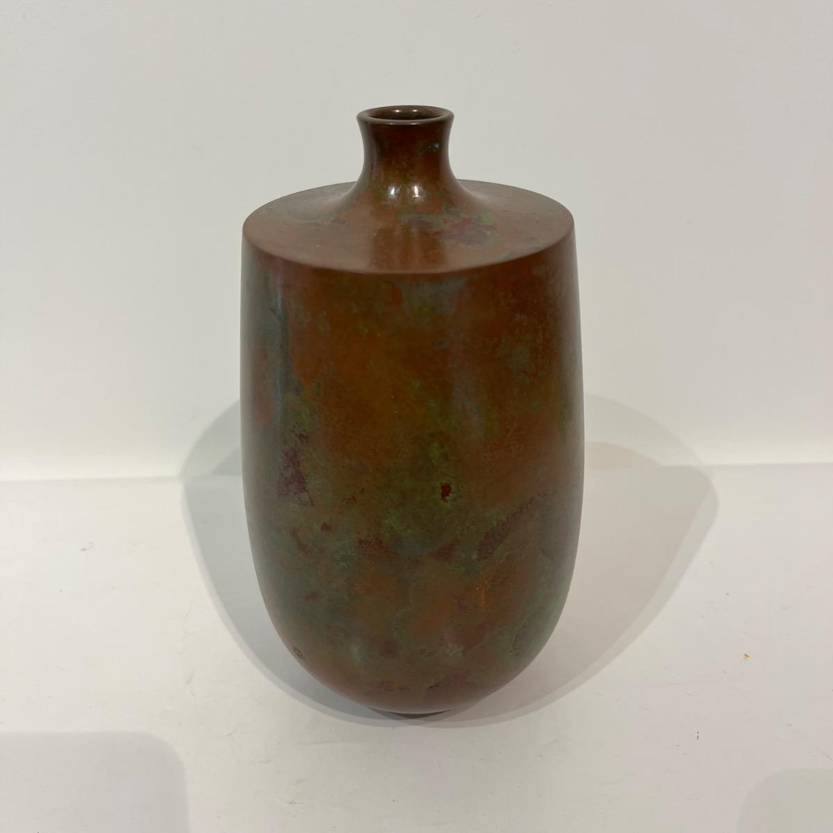 Vase en bronze aux lignes minimalistes du célèbre artiste Yoshihisa Gasen (1928-2002). Patine typique du travail de Gasen, dite murashido, avec des teintes rouge et vert. Japon, années 1970, 19 x 10,5 cm. Avec sa boîte d'origine signée par l'artiste.