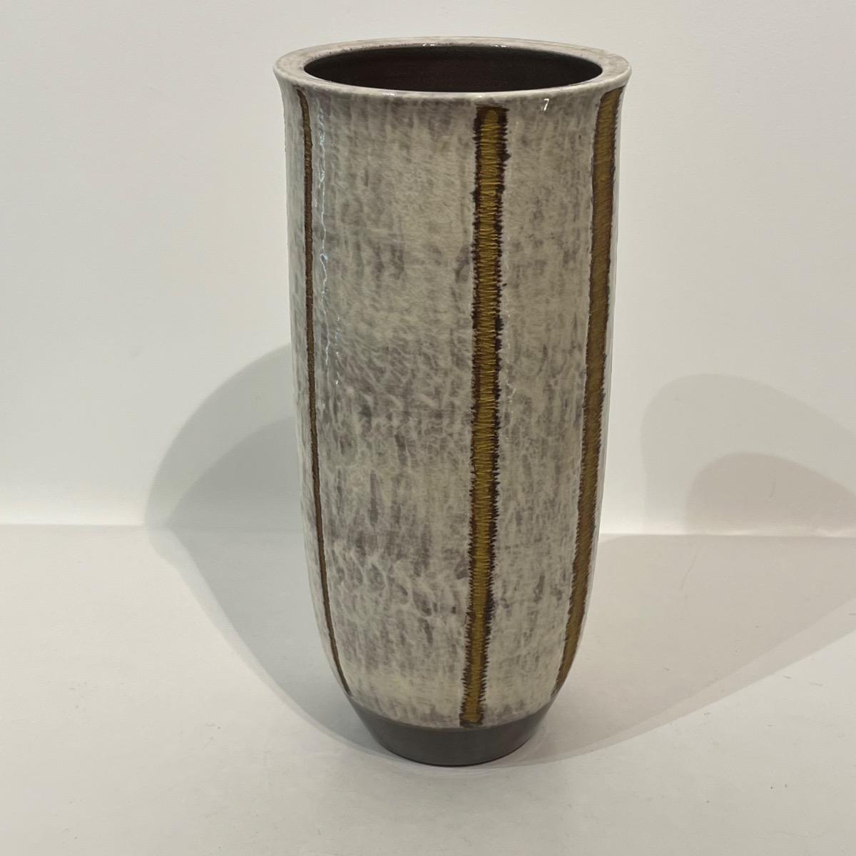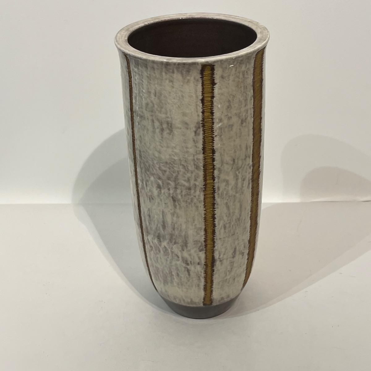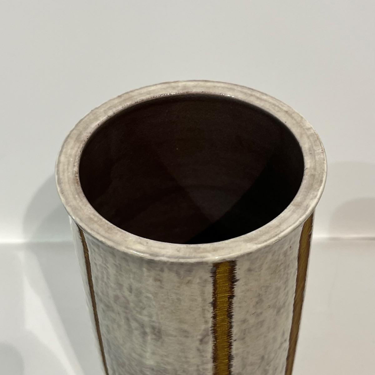 Haut vase en céramique à l'émail blanc et lignes travaillées à l'or.