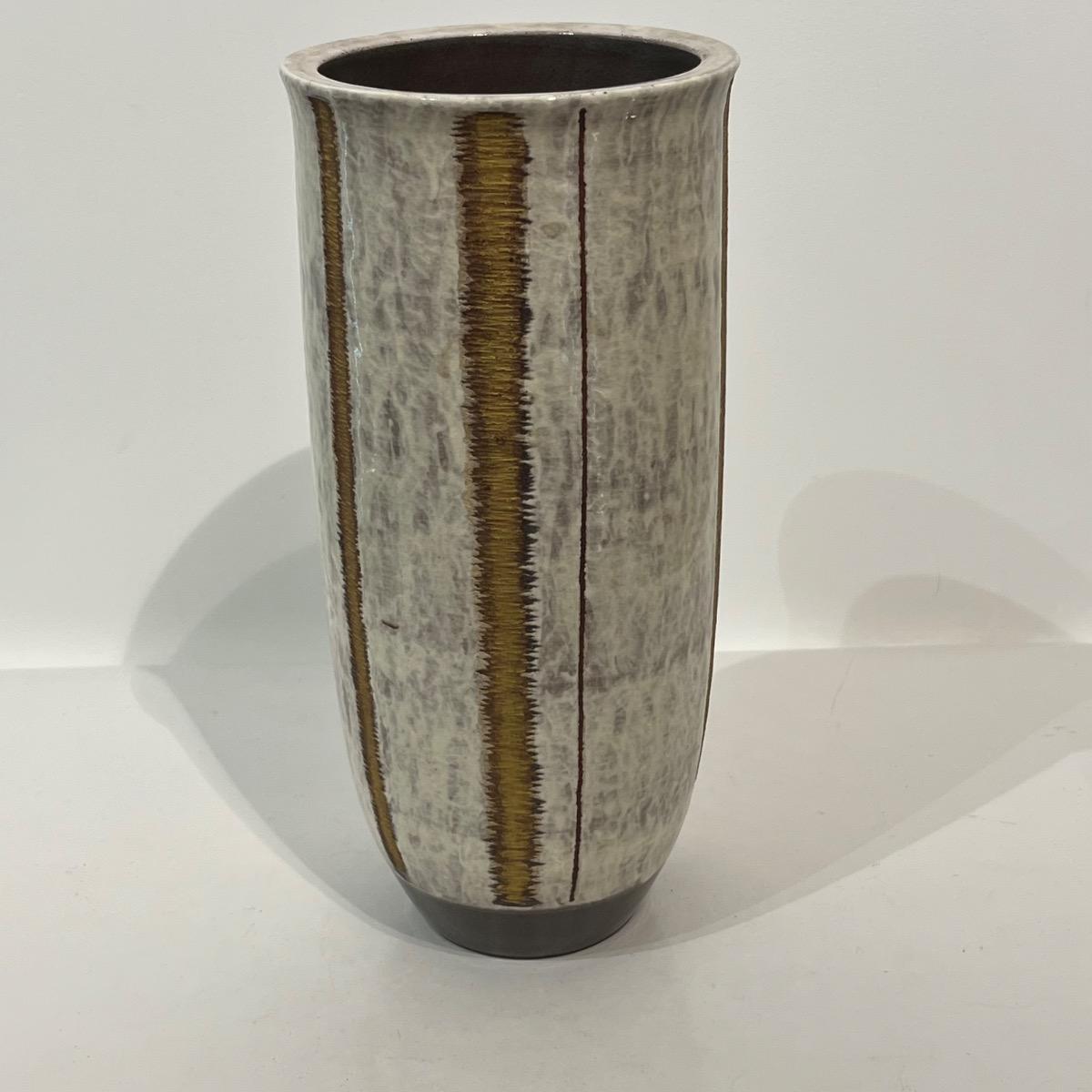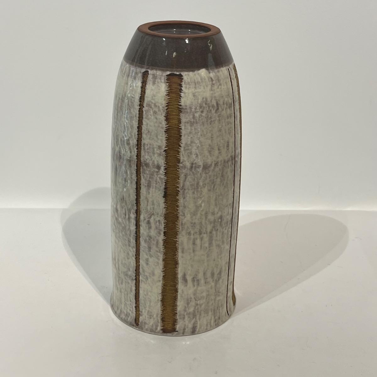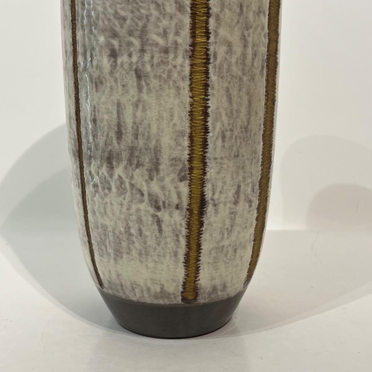 Haut vase en céramique à l'émail blanc et lignes travaillées à l'or.